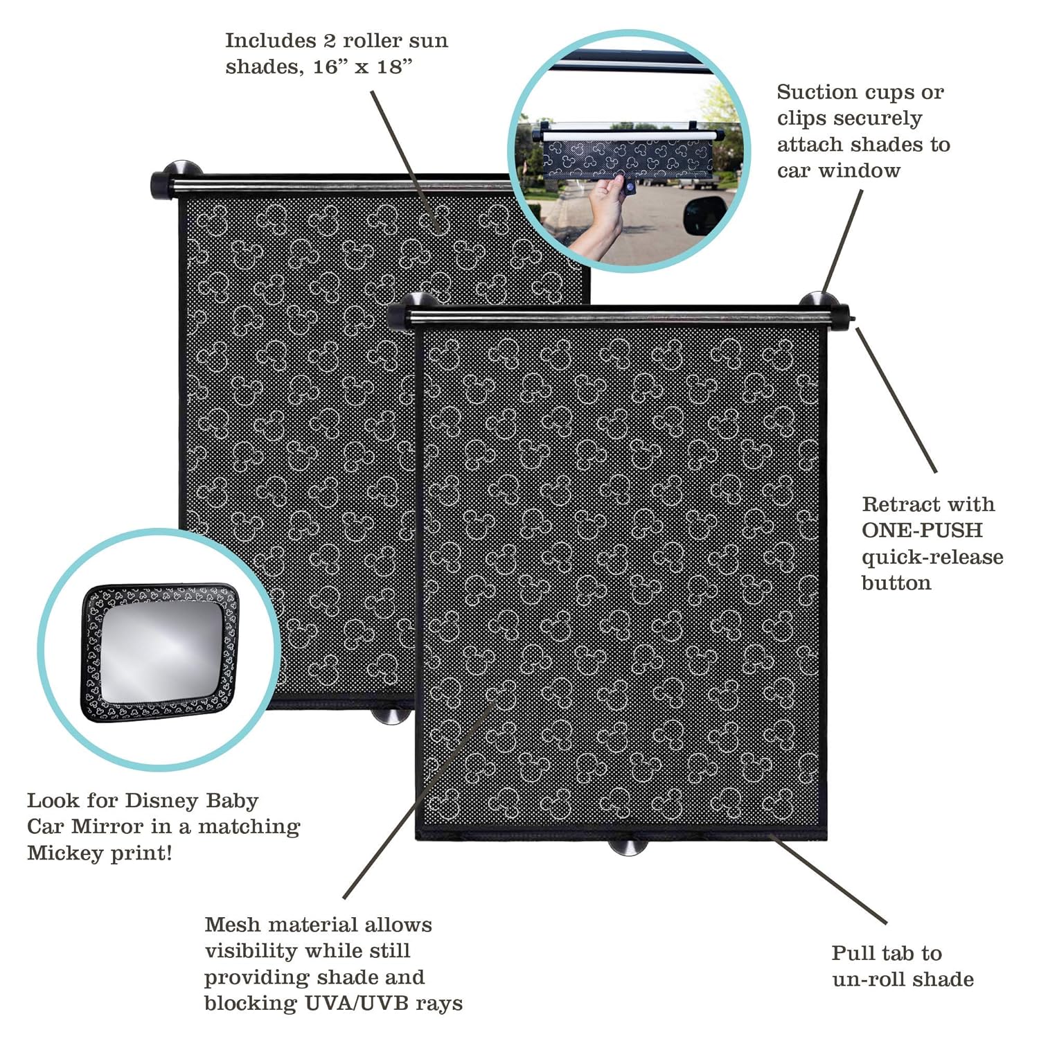 Protect your child from direct sunlight, heat, and UVA/UVB rays when riding in your car with this pair of Auto Roller Shades from Disney Baby. Mesh shades attach to most vehicle interior windows with included suction cups and roll up with ease.