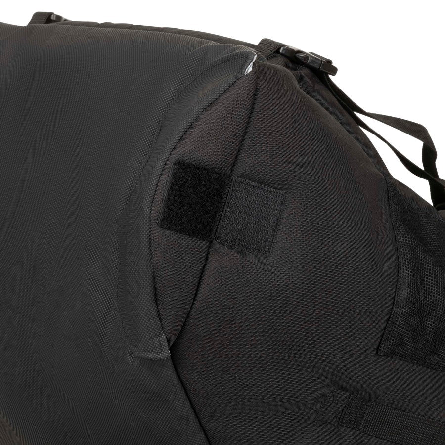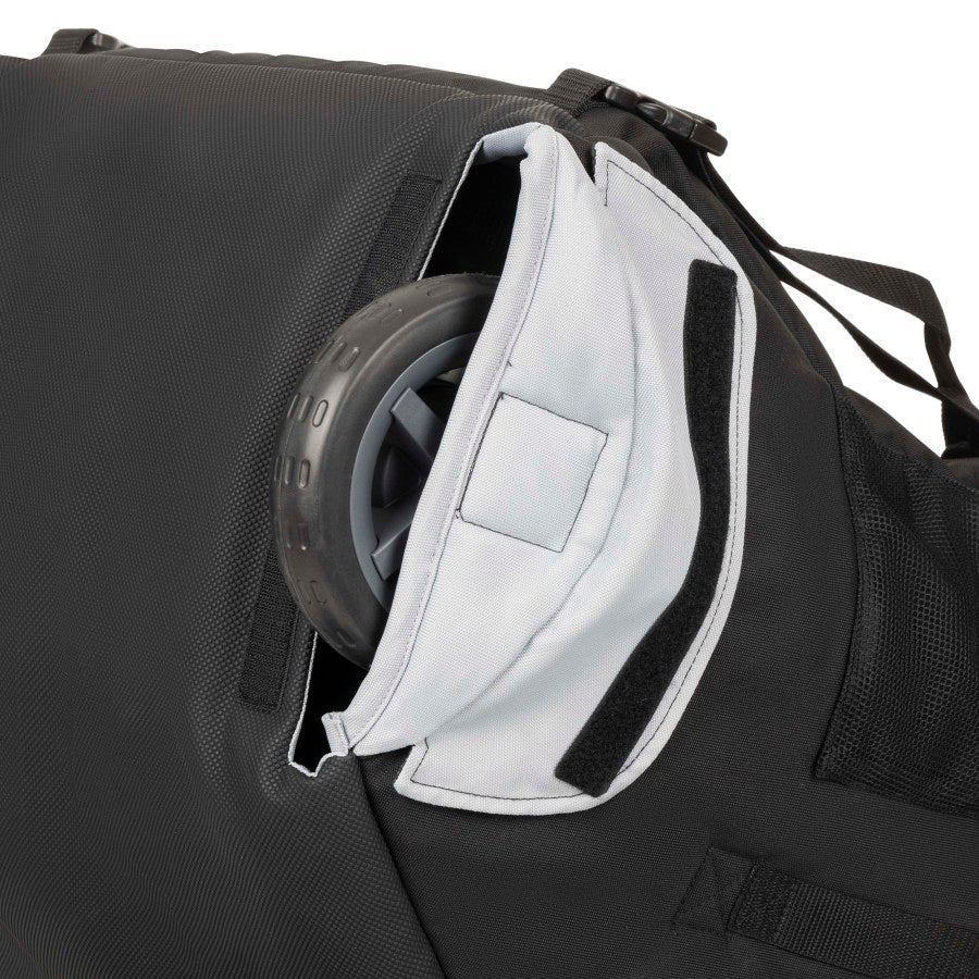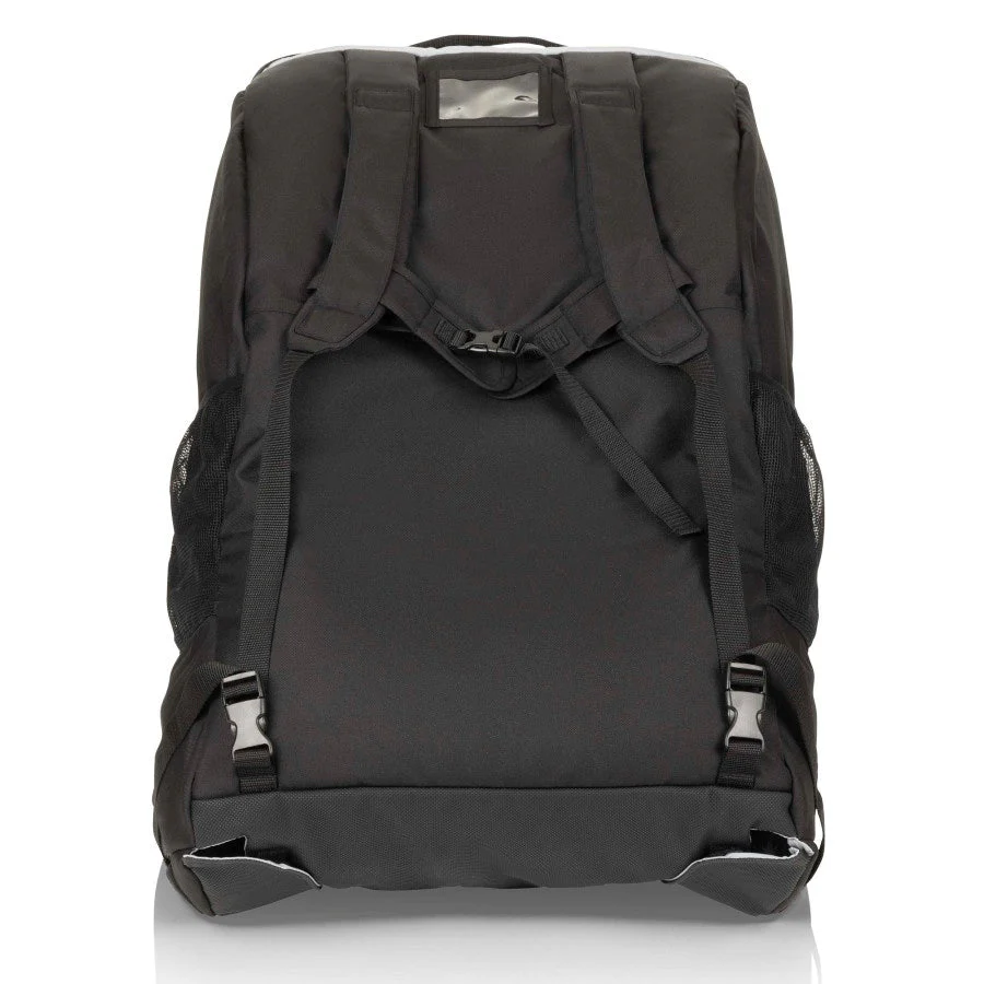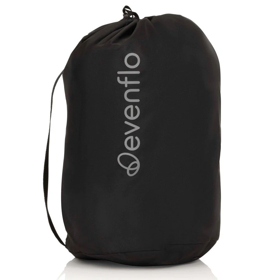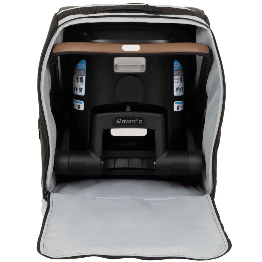 Our coordinating Padded Travel Bag is designed to streamline trips with your Evenflo® Shyft™ DualRide™ Infant Car Seat and Stroller Combo. Lightweight and durable, our stylish polyester canvas travel bag features a reflective logo to add visibility in traffic and low light. Holding up to 20 lb., it pads and protects your Shyft DualRide stroller frame during flights, train rides and more. Loading your bag couldn’t be easier! Simply unzip the back for rear-loading and slide your Shyft DualRide into place using the wheels. Zip the bag up again and then flip up the Velcro wheel flaps to expose the DualRide’s wheels for one-hand rolling through the airport. Stairs and narrow aisles can be daunting, so we designed our storage bag to double as a backpack using the adjustable, padded straps. Just remove the straps from their hidden Velcro pockets, pull on and clip the adjustable chest clip into place. Ergonomic design helps to distribute the weight for less strain on your back and more comfortable carrying. We added a top handle for easy carrying. And because your hands are full enough already, 2 mesh pockets flank either side of the travel bag to hold your iced coffee or water bottle. We also included a handy plastic luggage tag for gate checks. Don’t worry about the inevitable muss your travel bag will encounter — it’s spot-cleanable, so you can make your next excursion looking completely pulled together. Comes with a black drawstring storage bag to keep your travel bag dust-free until you Shyft into the next family adventure with your little one!