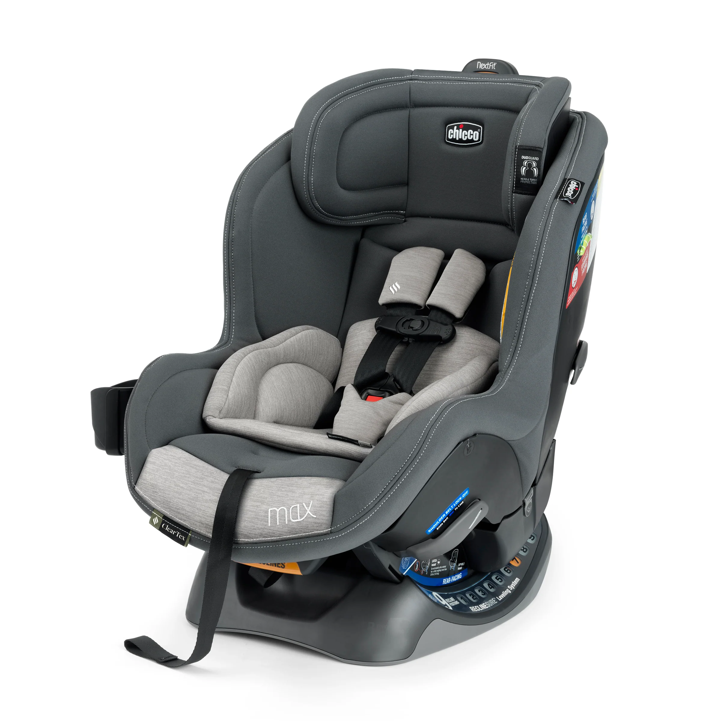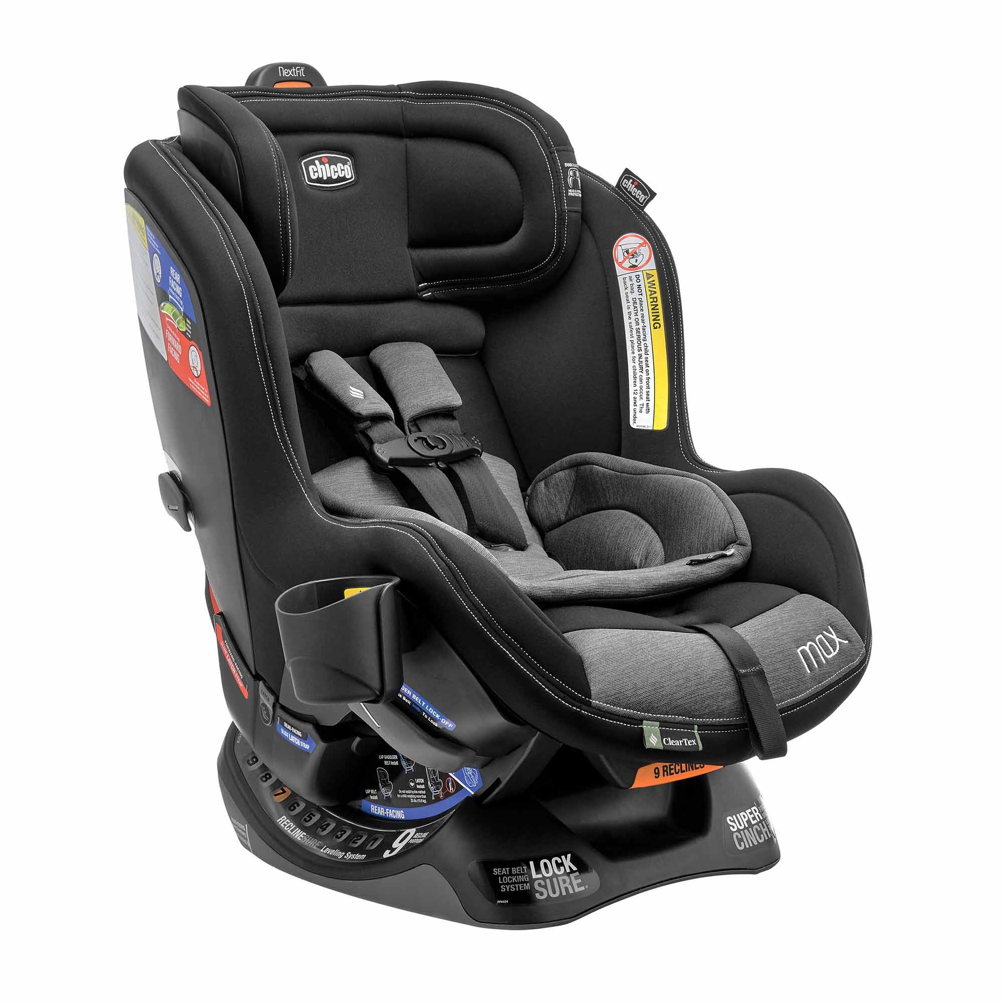 The NextFit Max ClearTex Extended-Use Convertible Car Seat from Chicco is engineered to comfortably maximize rear-facing mode. From textiles to tags, it features no added chemicals & top-rated safety features make it the easiest to install.