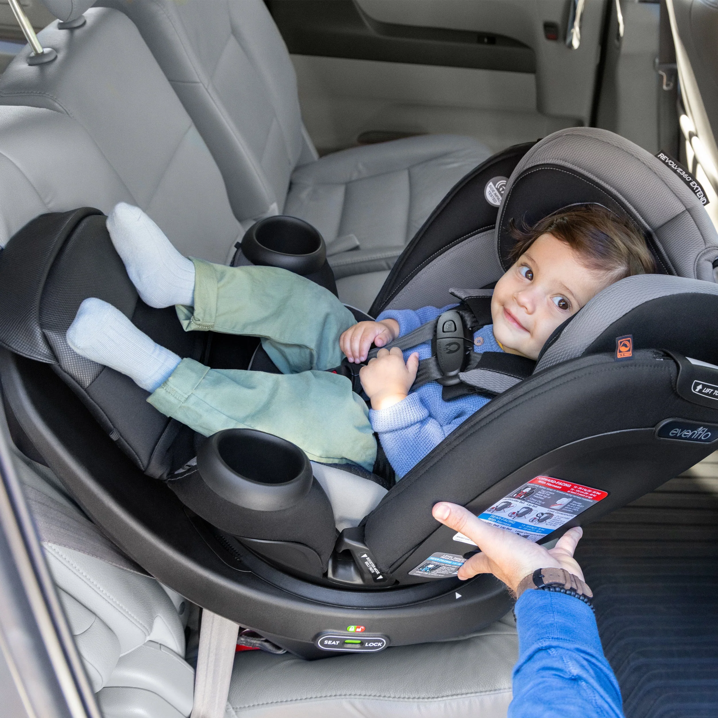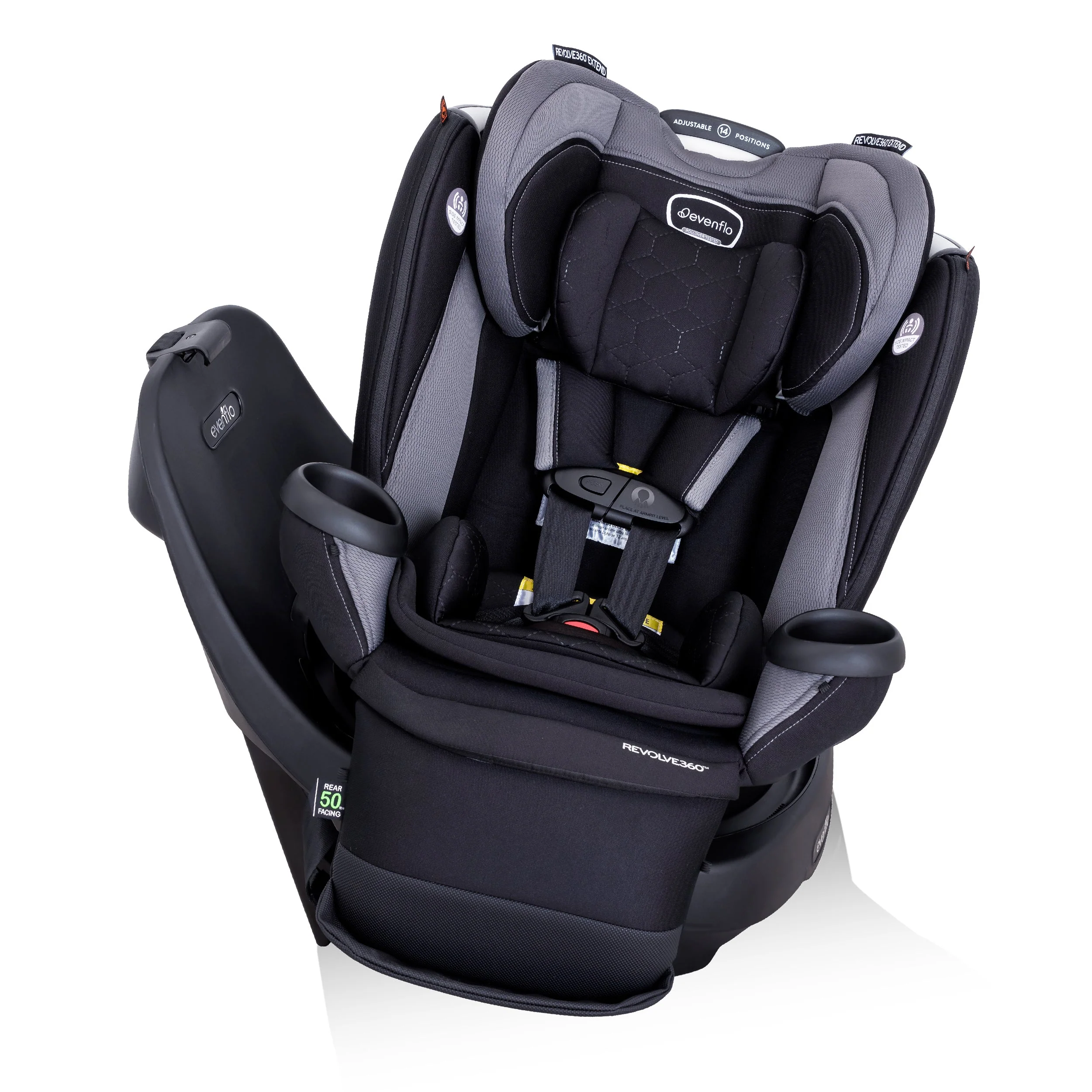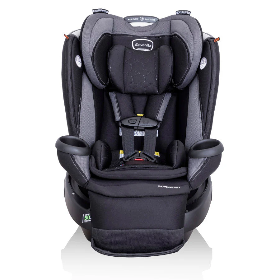 The revolution just got extended! The Evenflo® Revolve360™ Extend™ All-in-One Rotational Car Seat with Quick Clean Cover offers the extended security of rear-facing all the way up to 50 lb. Child safety experts say the longer your child remains rear-facing, the better, and the Revolve360 Extend is here to help with peace of mind all the way around. A spin-off of America’s bestselling rotating car seat, the Extend makes it easy to get your child in and out of the car with just one hand. Convenience by design doesn’t end there. This innovative car seat comes with a zip-on, ergonomic leg rest to add comfort for growing legs. Install the seat just once for rear and forward — no need to remove in order to make the switch. Sure360™ Safety Installation System with LockStrong™ and Tether360™, plus a handy bead-level indicator for leveling in seconds, make your one-time installation safe, secure and simple. The best swivel car seat is one that lasts! The Extend, the only car seat you’ll ever need, grows with your child for 10 years with 3 modes that adapt to every stage: rear-facing (4 to 50 lb), forward-facing (22 to 65 lb) and booster (40 to 120 lb). And to keep your seat looking fresh over years of snacks, spills and all the adventures to come, the Revolve360 Extend features a handy Quick Clean Cover — easy to remove, easy to wash, easy to live with. On-the-go recline means you can adjust this swivel car seat to the perfect angle without having to reinstall or bother your baby. Offering style and ease at every turn, the Revolve360 Extend features premium fabrics and elevated touches to finish off your bold moves in style. Join the revolution!