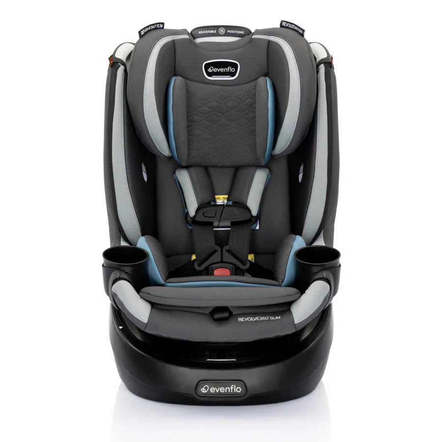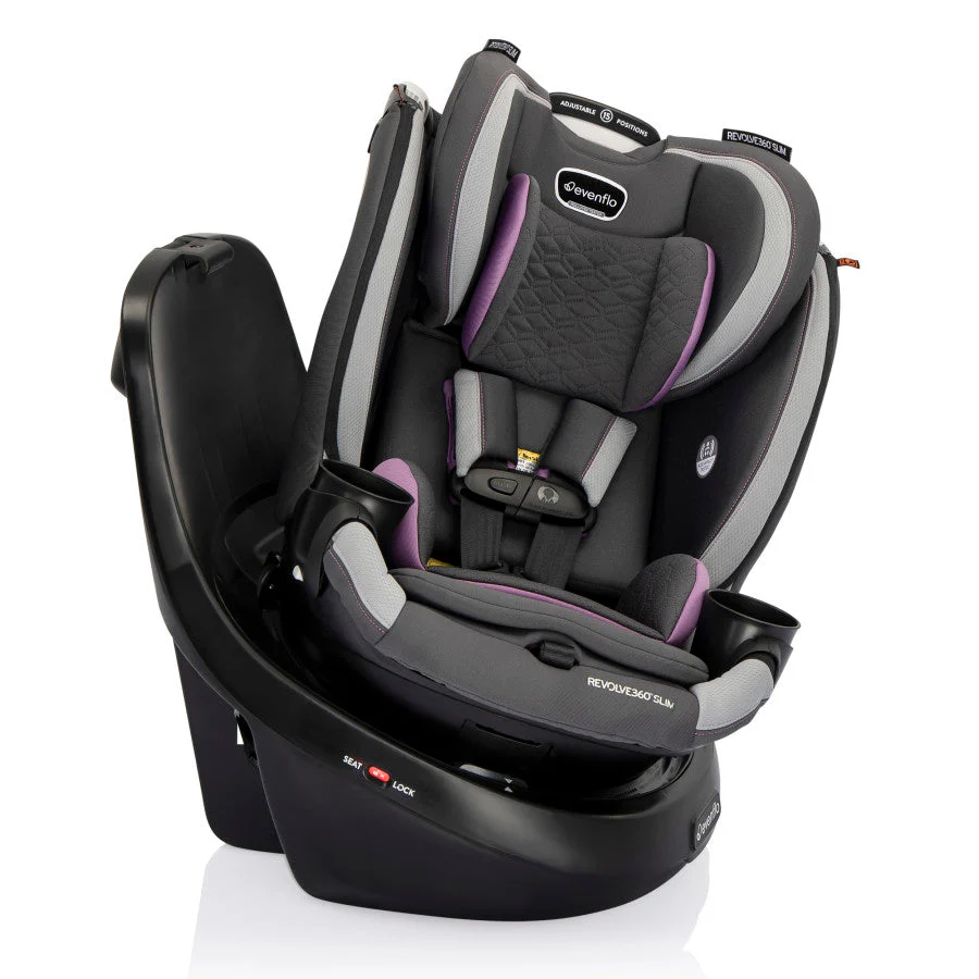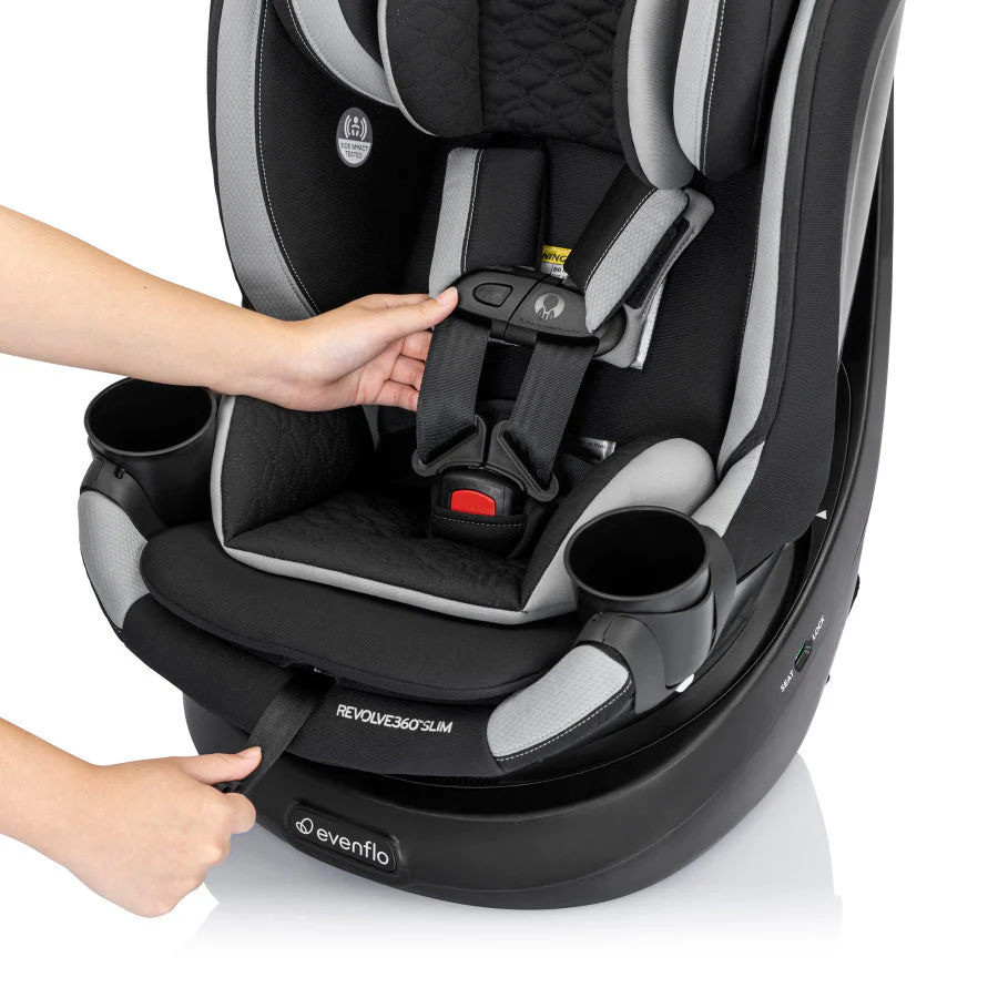 Got a compact vehicle and a little one on the way? Check out the Evenflo® Revolve360™ Slim 2-in-1 Rotational Car Seat with Quick Clean Cover! We slimmed the exterior of our revolutionary car seat to create a 16.7” footprint without sacrificing your child’s seating space or safety. You can fit more of what you love into your backseat with more room for passengers and your growing family! A spin-off of the Revolve360, America’s bestselling rotational car seat, the Revolve360 Slim offers one-hand, 360° rotation in all modes, making it easier to get your child in and out of the car. But a 360° rotating car seat is just the beginning. The Revolve360 Slim offers two modes: rear-facing (4 lb to 50 lb, for a child measuring from 17 in. to 48 in) and forward-facing (22 lb to 65 lb, for a child measuring 28 in. to 49 in.). For peace of mind all the way around, this slim fit car seat offers the extended security of rear-facing all the way up to 50 lb. Child safety experts say the longer your child remains rear-facing, the better. Convenience comes full circle in a rotating car seat you can install just once for rear-facing and forward-facing — no need to uninstall your car seat in order to make the switch. Sure360™ Safety Installation System with LockStrong™ and Tether360™, plus a handy bead-level indicator for leveling in seconds, make one-time installation safe, secure and simple. The best swivel car seat is one that’s easy to keep clean! To keep your Revolve360 Slim car seat looking fresh over years of snacks, spills and all the adventures to come, a handy Quick Clean Cover is included — it’s easy to remove, easy to wash, easy to live with. On-the-go recline means you can adjust the car seat to the perfect angle without having to reinstall the car seat or bother your child. Offering style and ease at every turn, the Revolve360 Slim features premium fabrics and elevated touches to complement your bold moves in style. Discover the new spin on Slim!