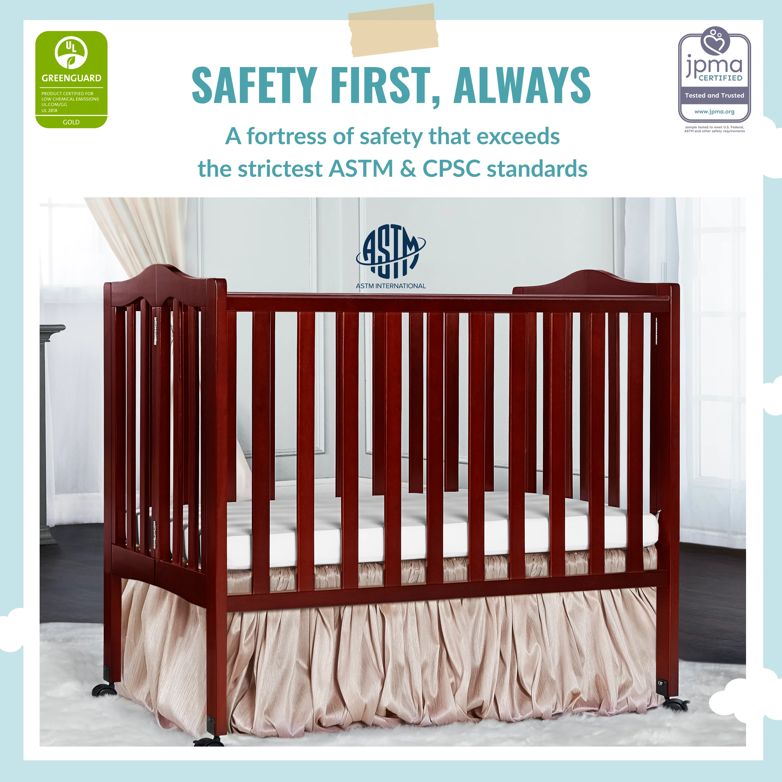 - The stationary (non drop side) rail system and dual hooded, locking wheels provide the utmost in product safety. It meets applicable ASTM/CPSC standards