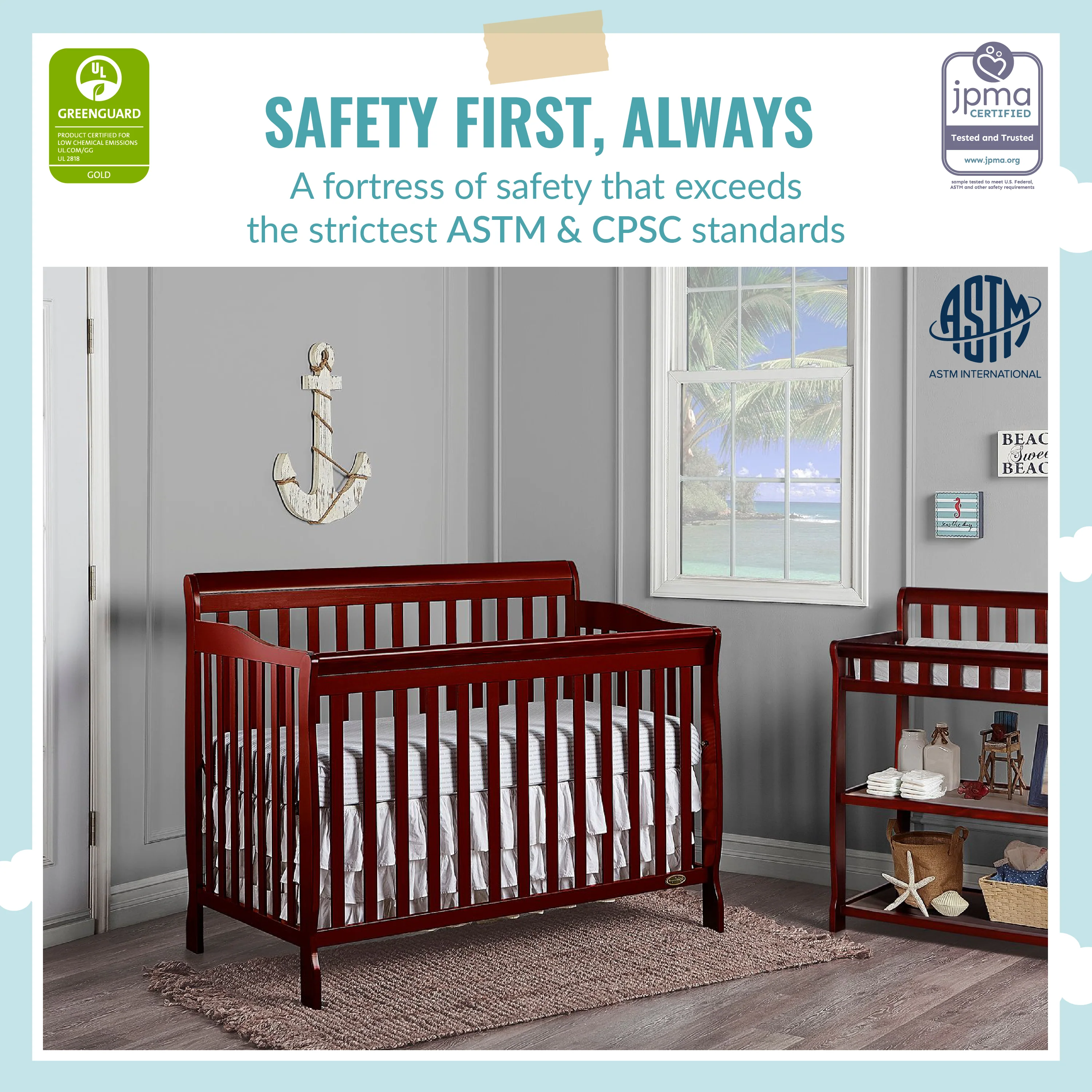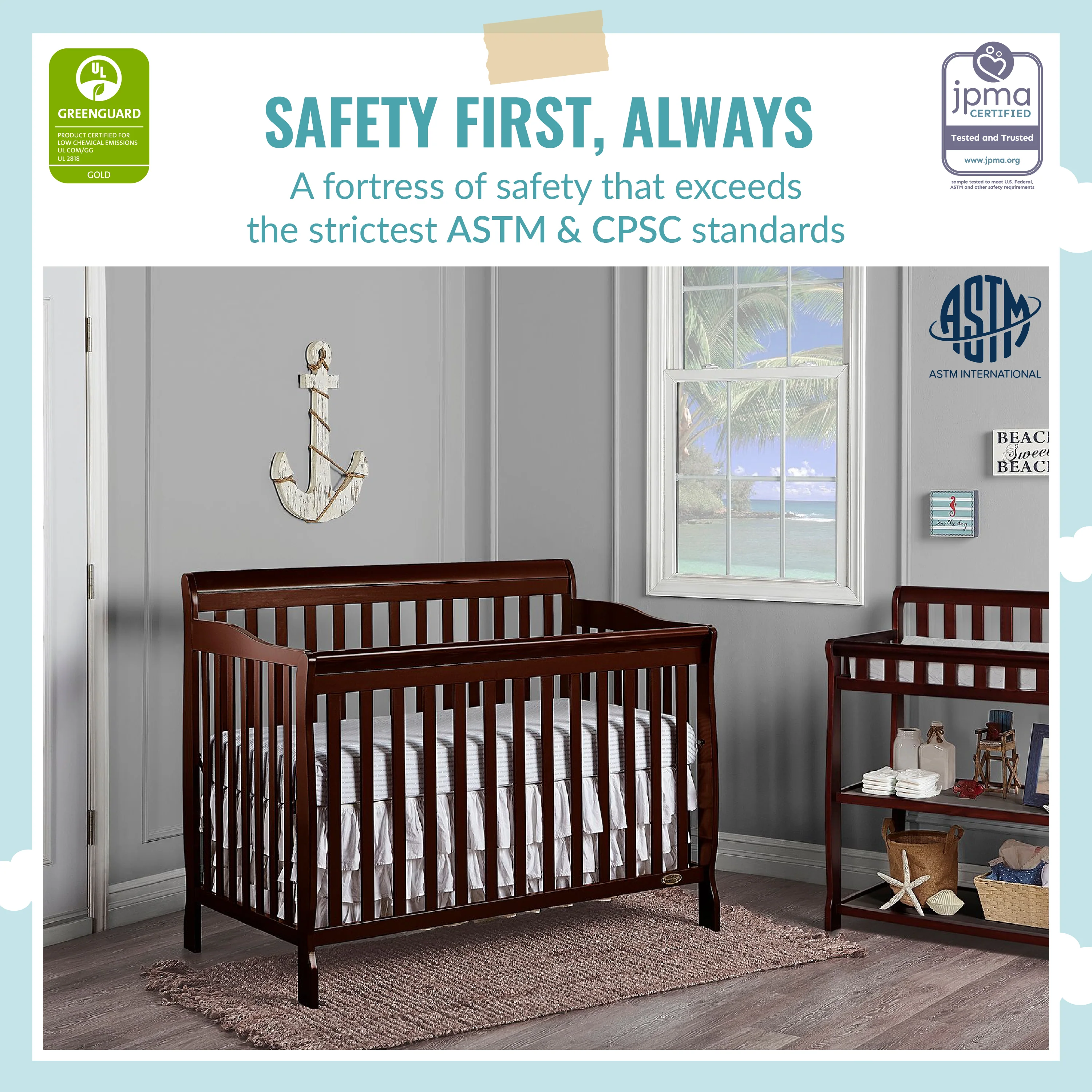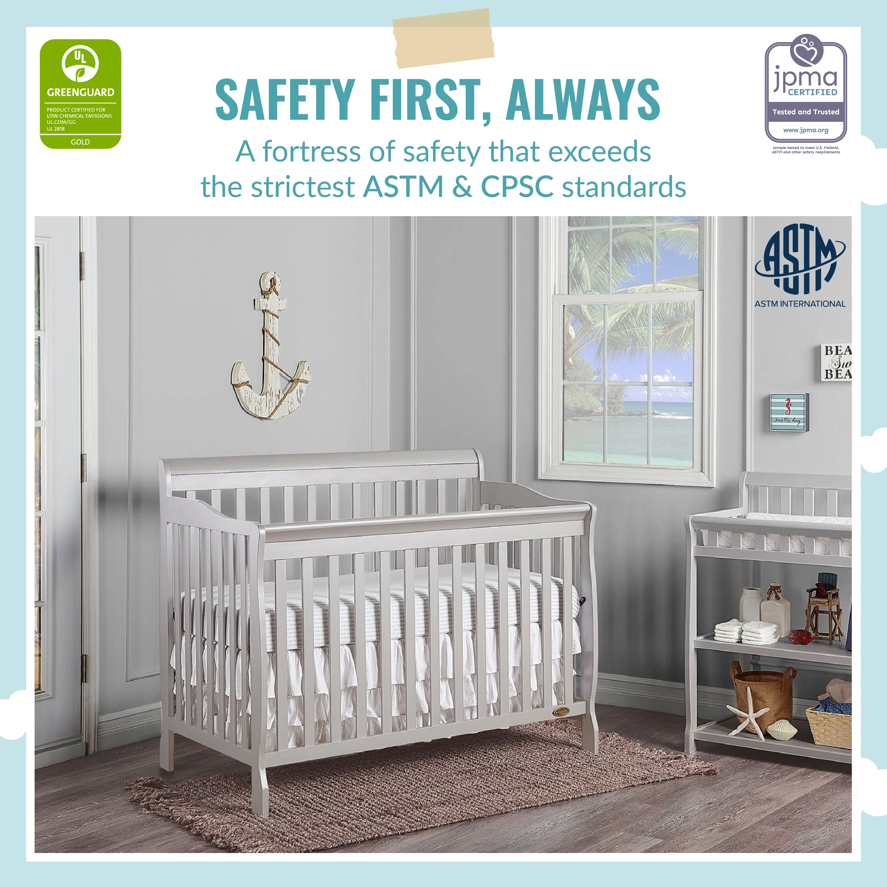 • SAFETY FIRST - ALWAYS: This crib is JPMA Certified to meet or exceed all safety standards set by the CPSC & ASTM. All of our products are tested by 3rd party labs for lead and other toxic elements to meet or exceed CPSC and ASTM safety standards