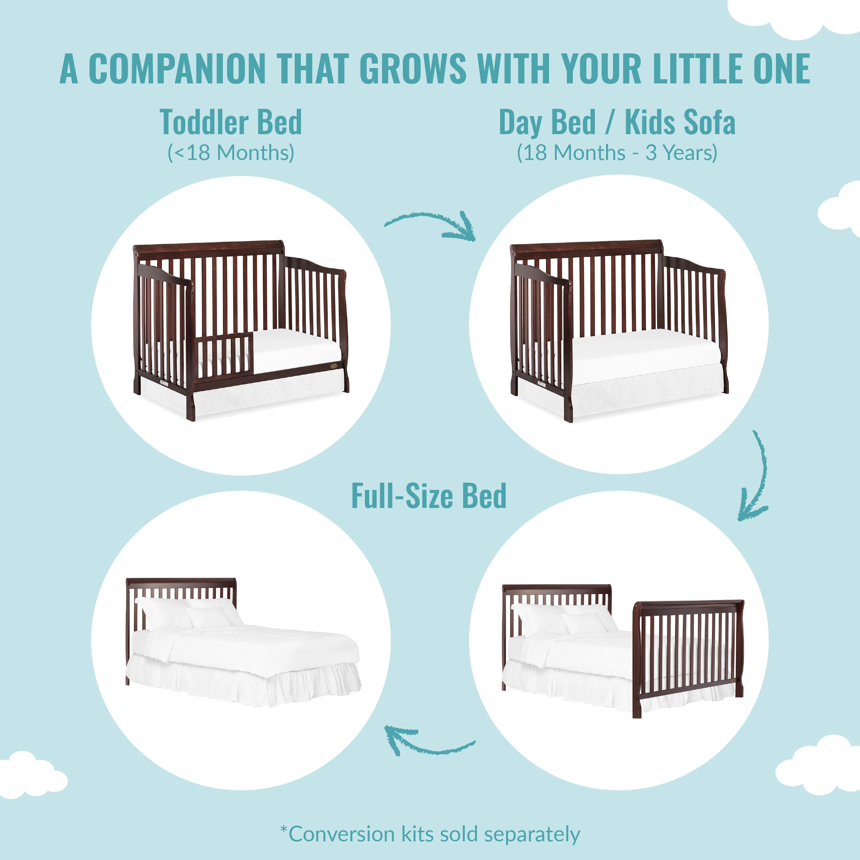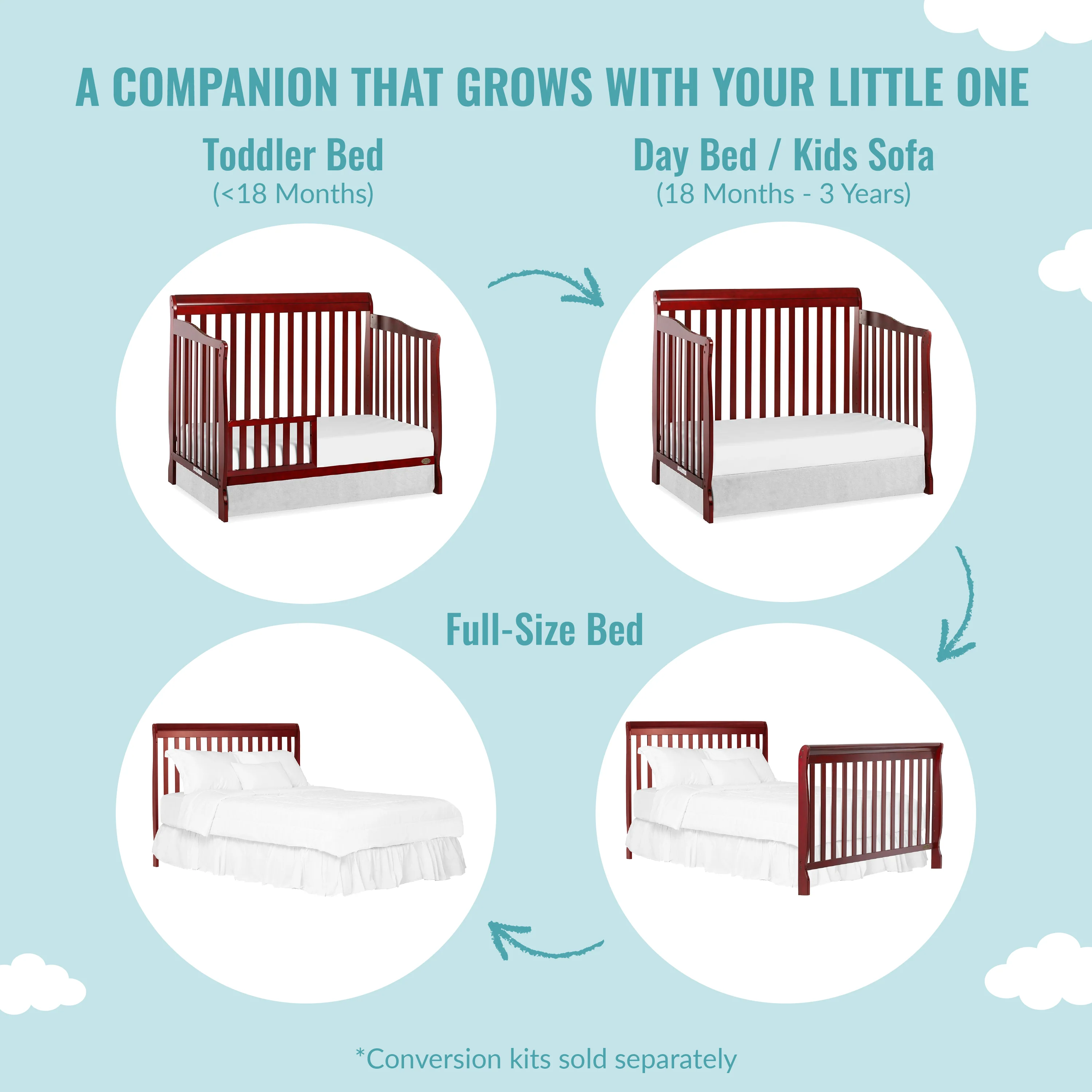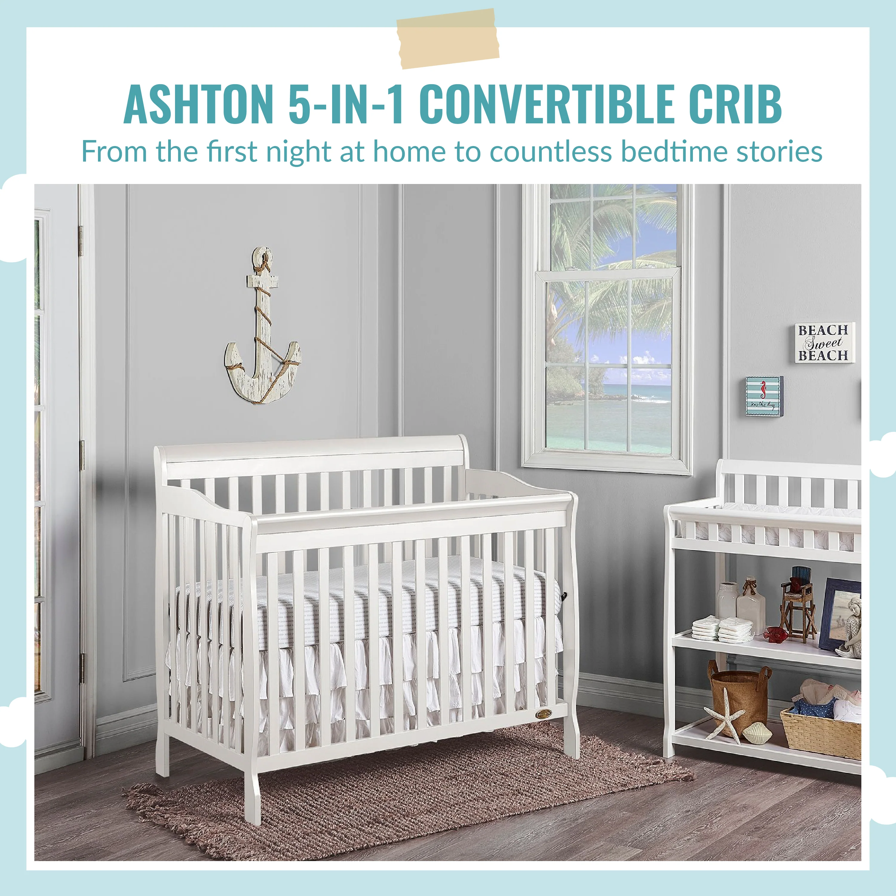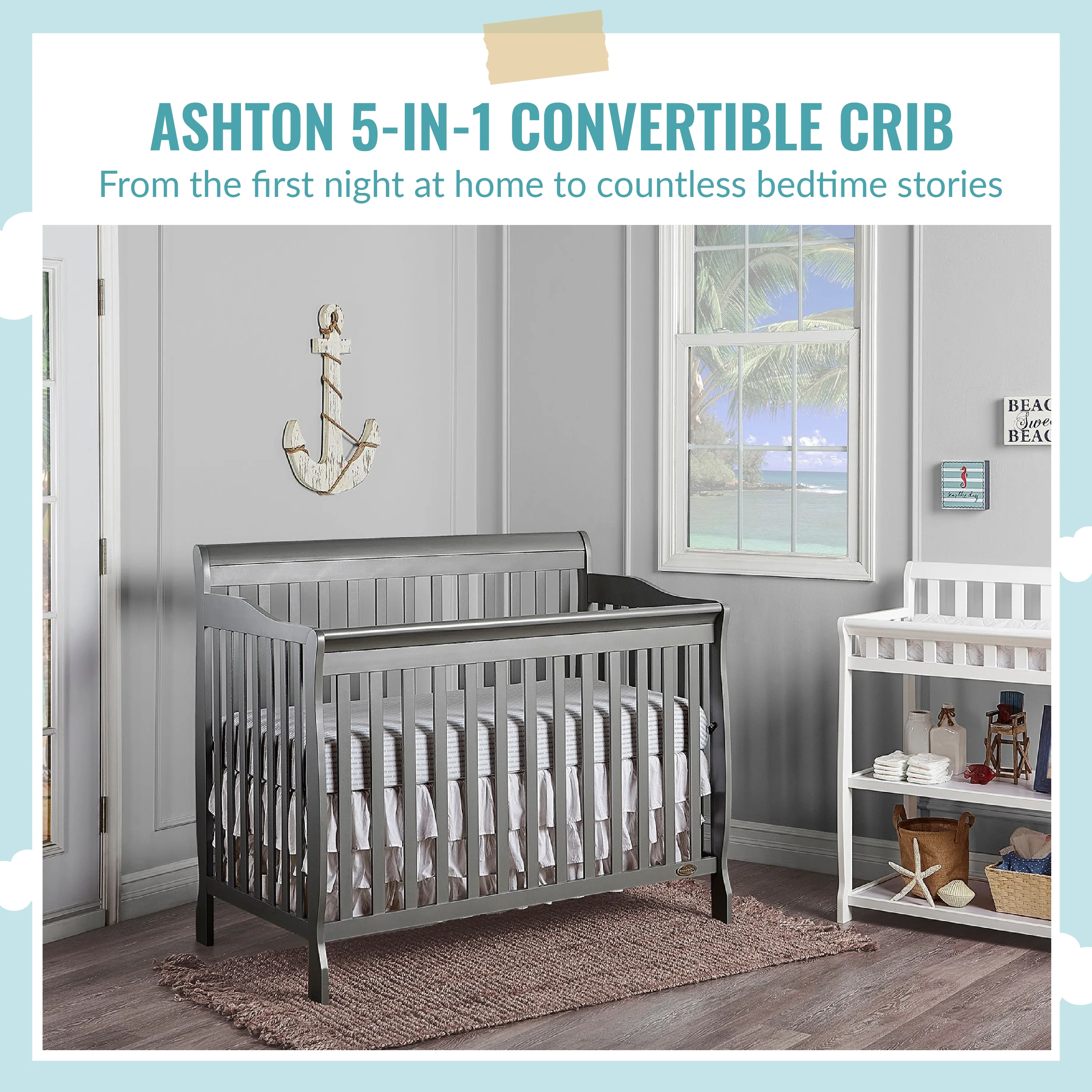 • 4-IN-1 CONVERTIBLE CRIB: A lifetime investment, the Ashton grows with your child, easily converting from a crib into a toddler, day and full-size bed. The toddler guardrail, stabilizer and full-size rail are sold separately