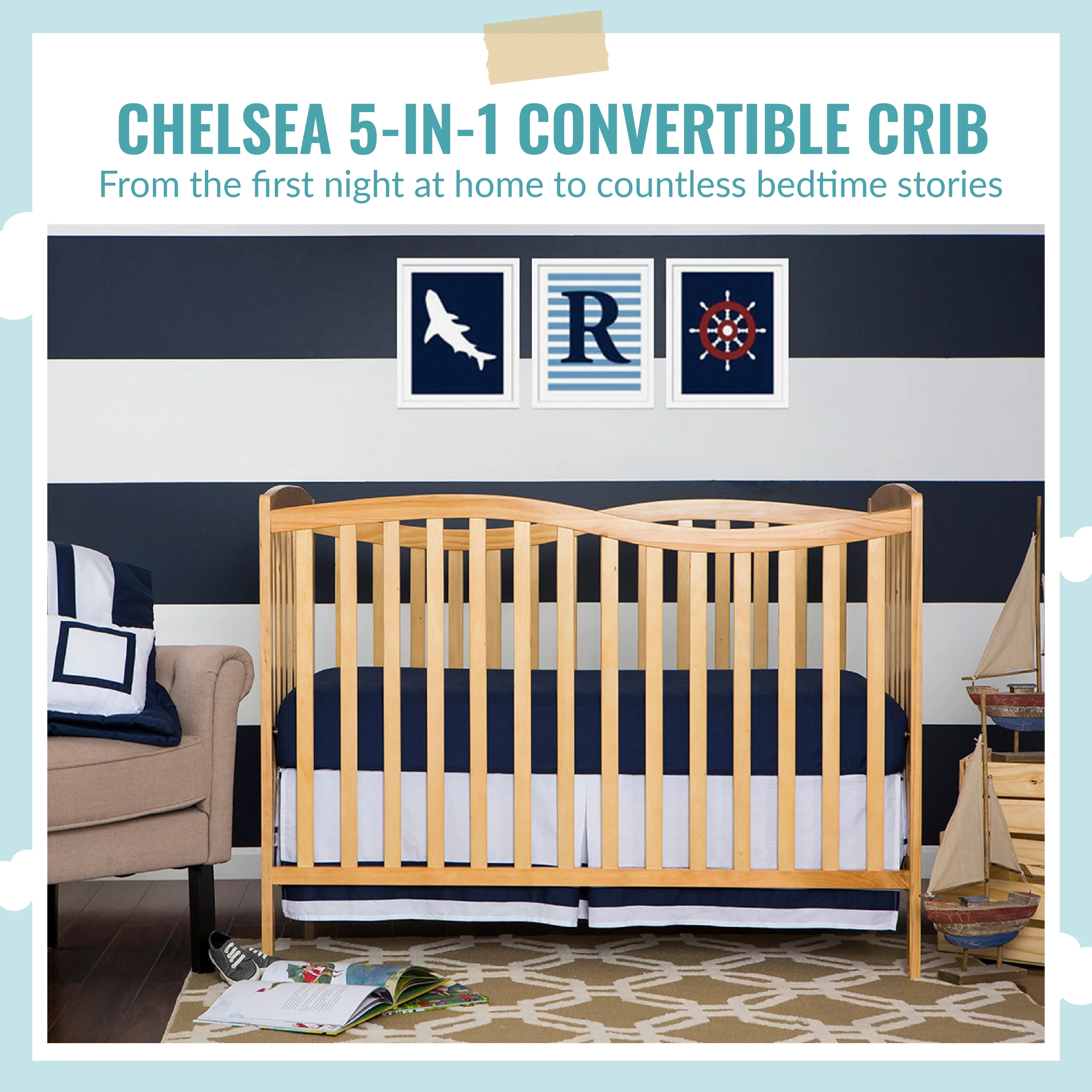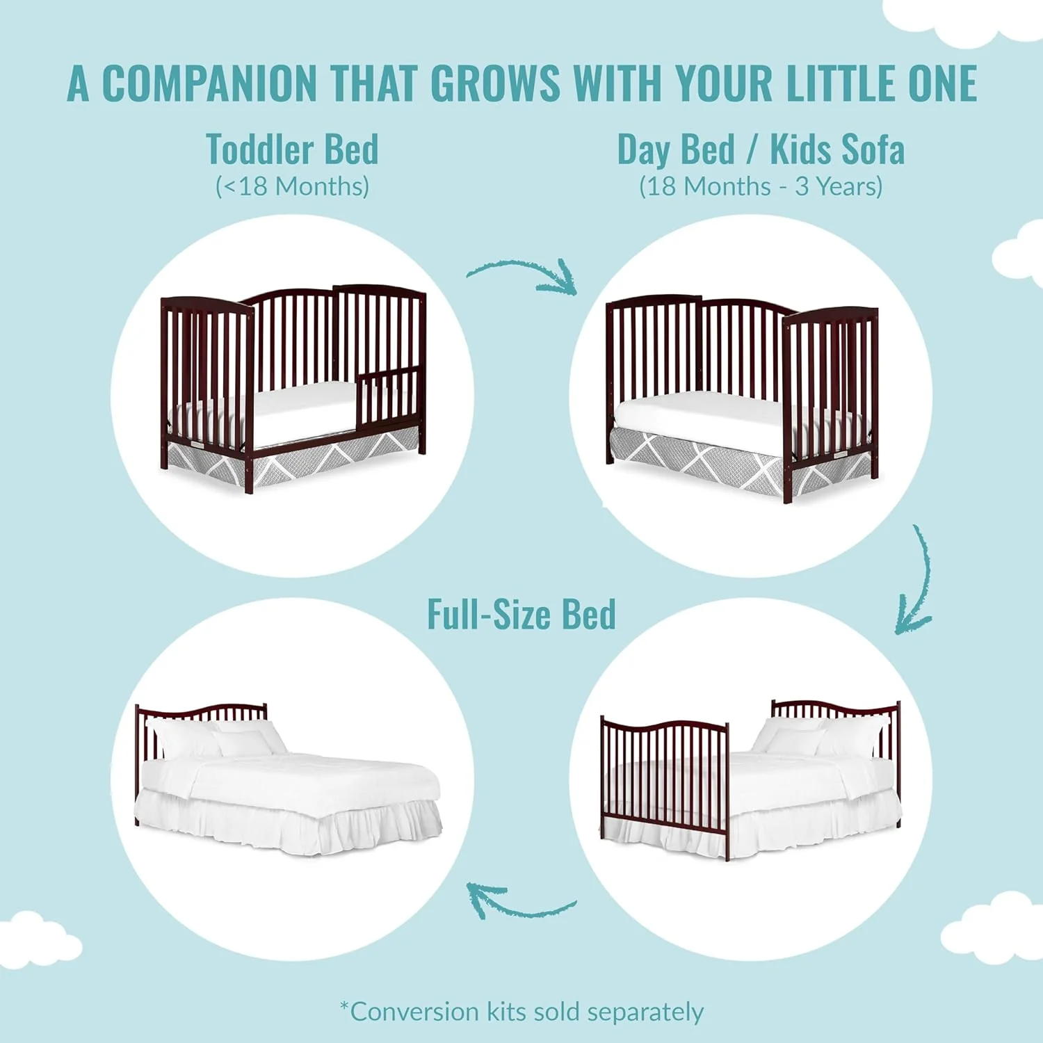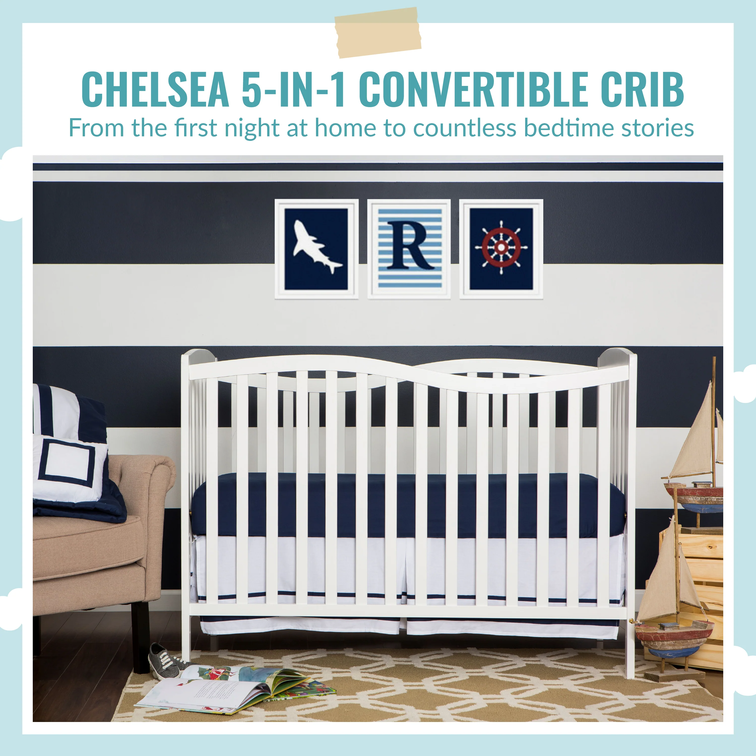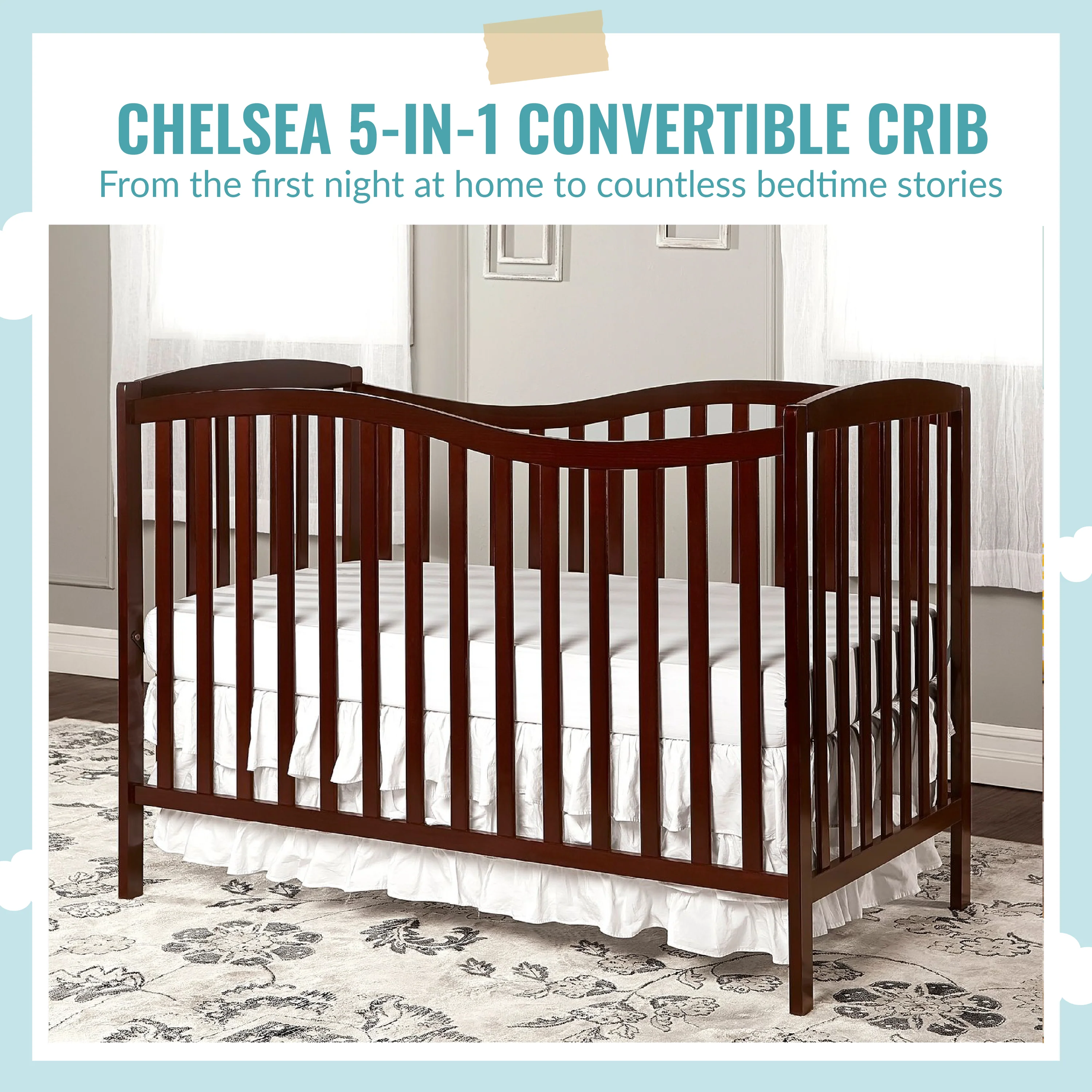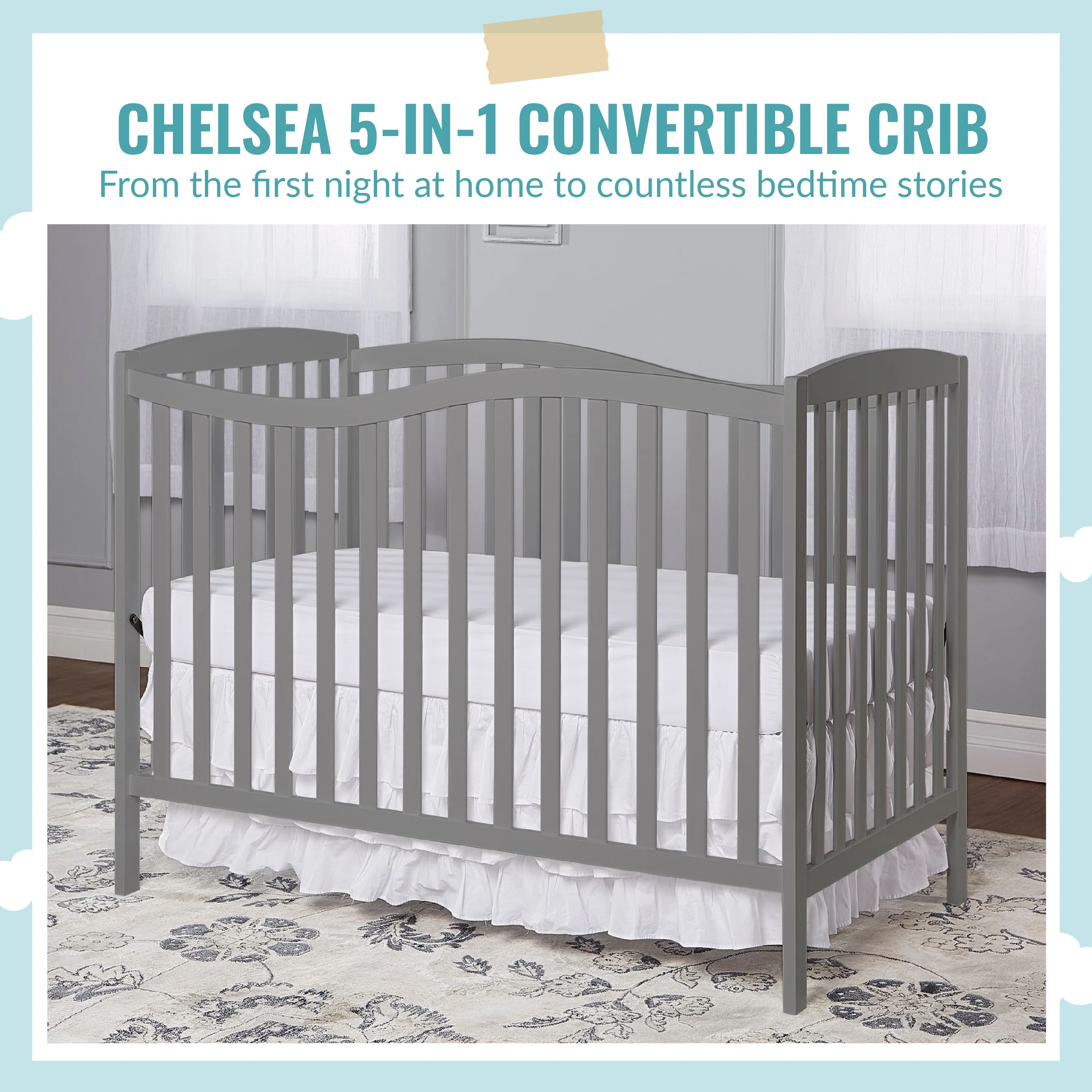 - 5-IN-1 CONVERTIBILITY: The graceful Chelsea keeps pace with your child, converting into a comfy toddler bed, daybed and full size bed as your child grows (toddler guardrail, stabilizer, full size rail and bed frame sold separately)