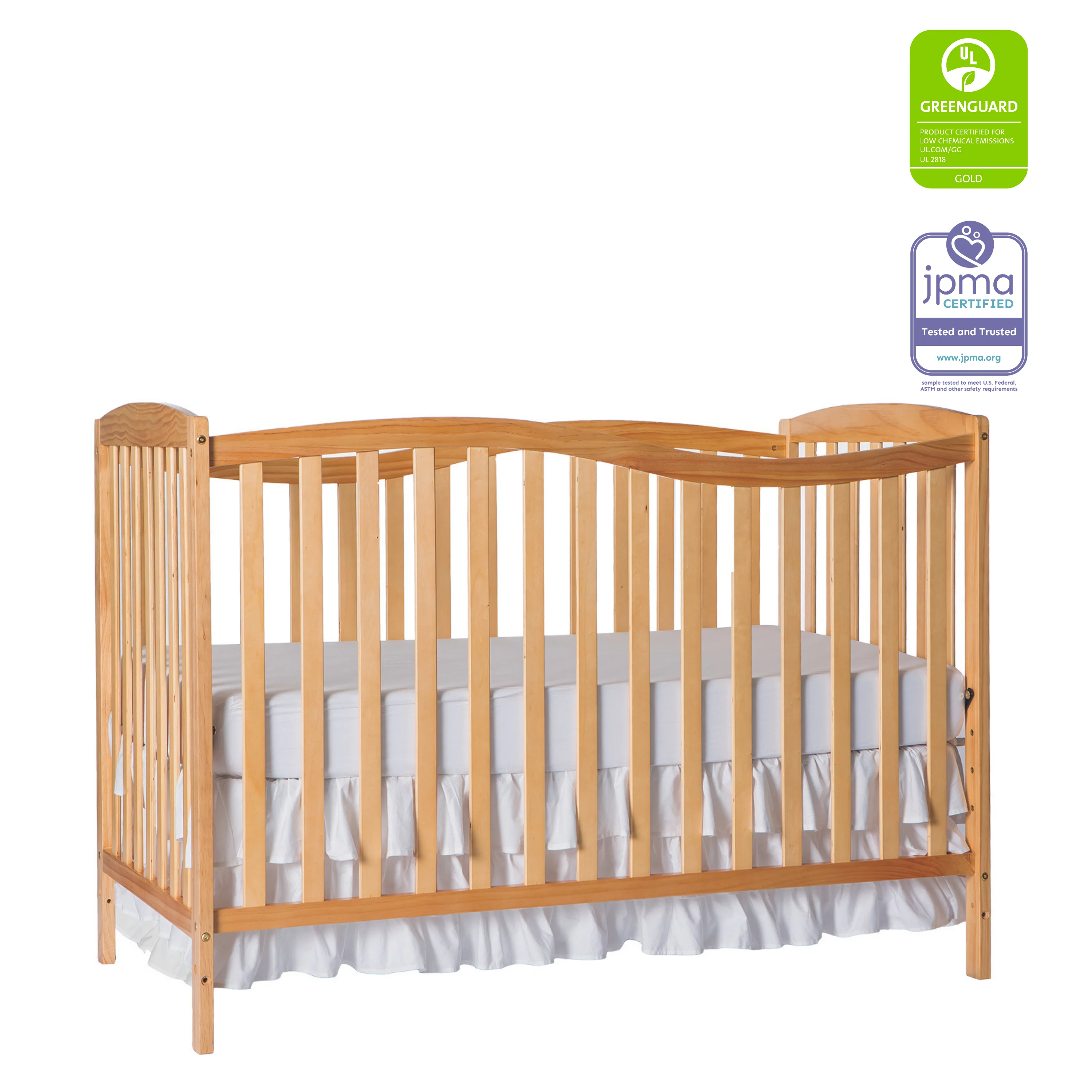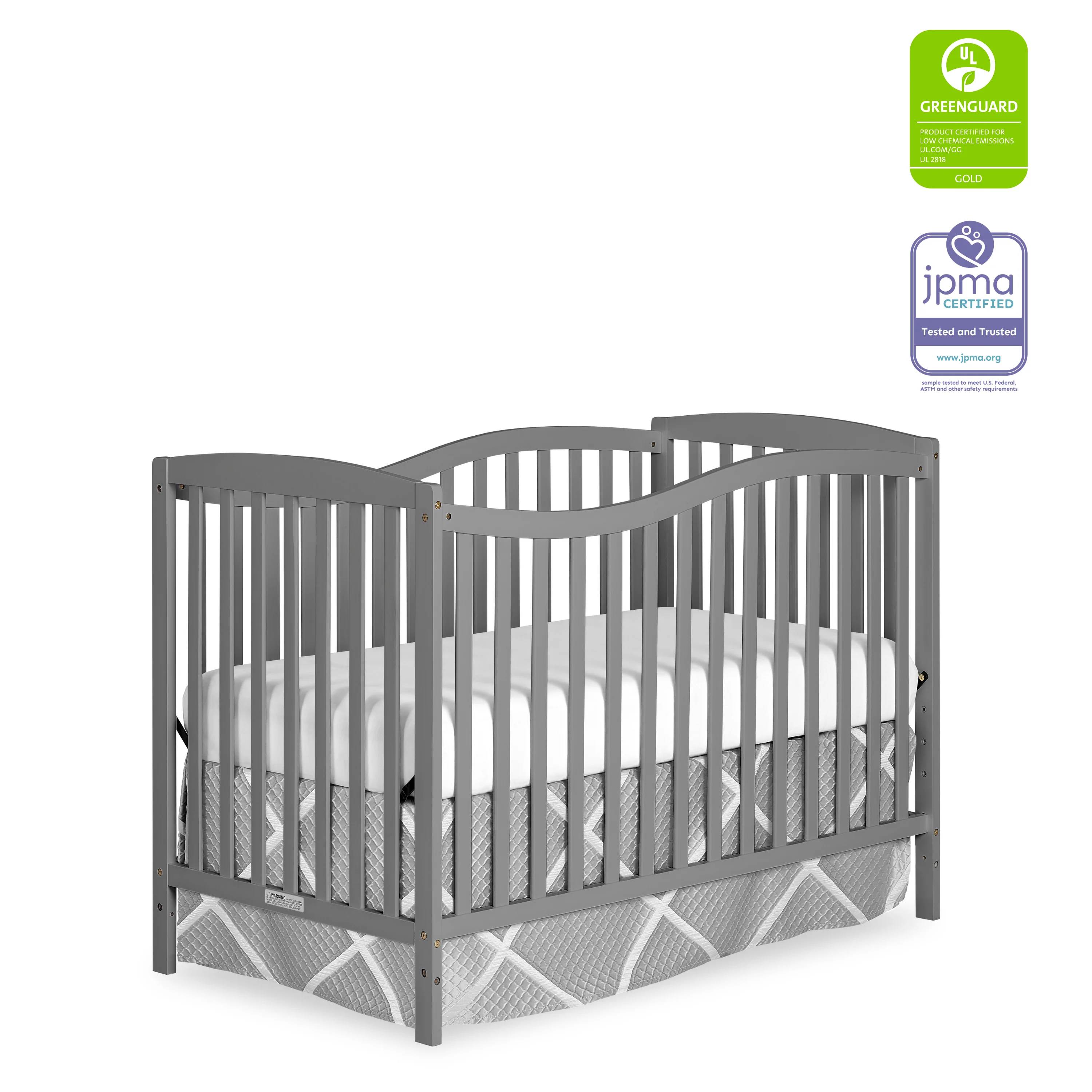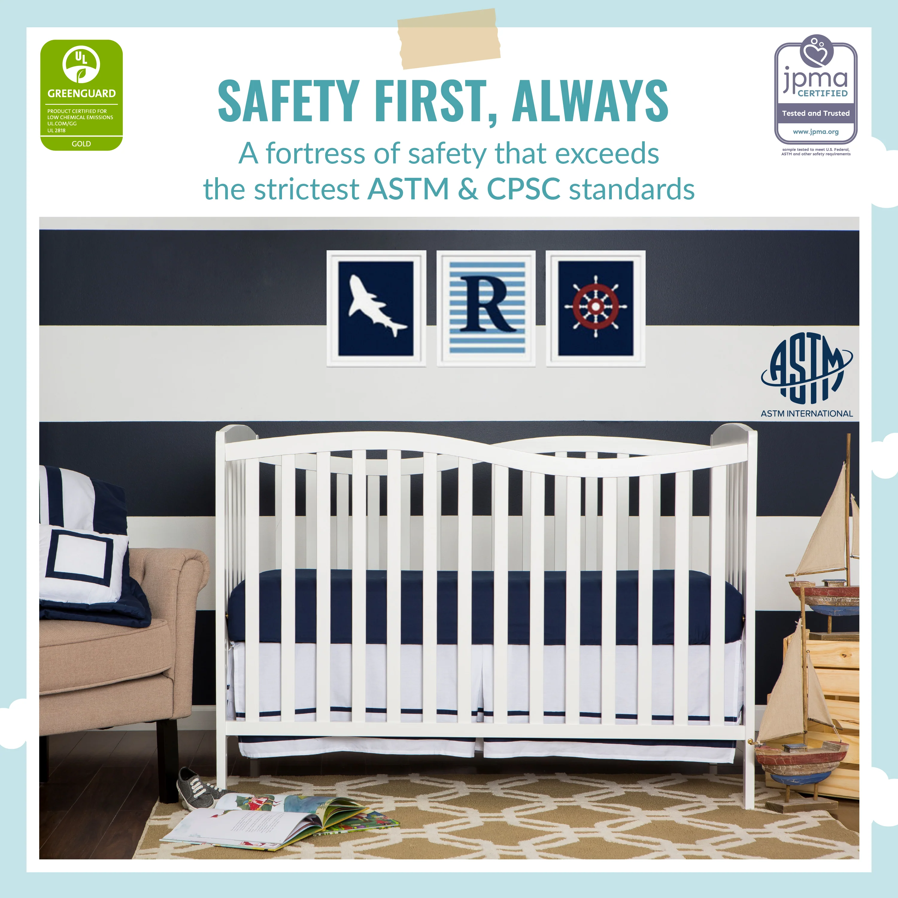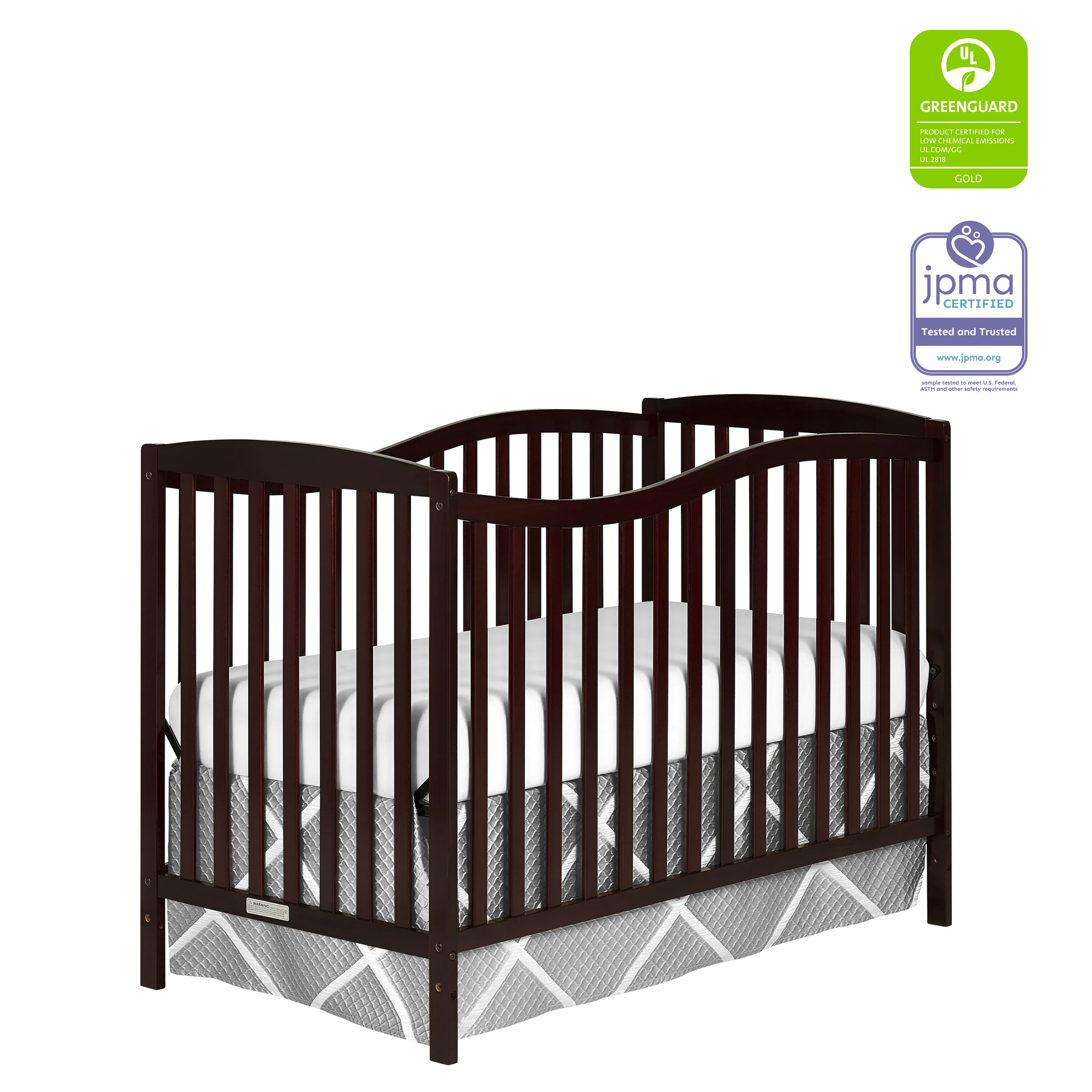 - SAFETY FIRST: The crib has stationary sides for added security. All our cribs are JPMA Certified to meet/exceed CPSC/ASTM safety standards. Our products are tested by 3rd party labs for lead/other toxic elements to meet/exceed CPSC/ASTM safety standards