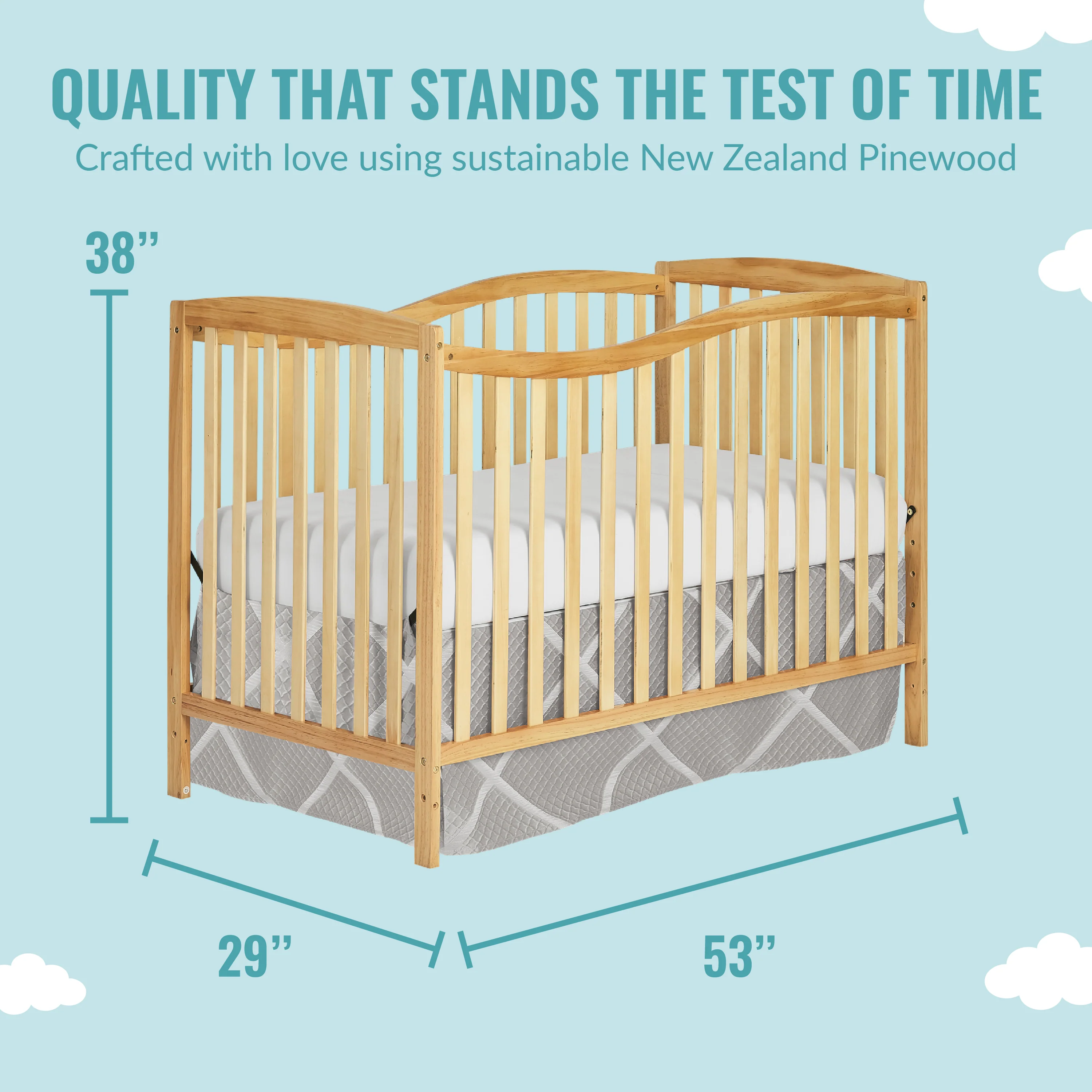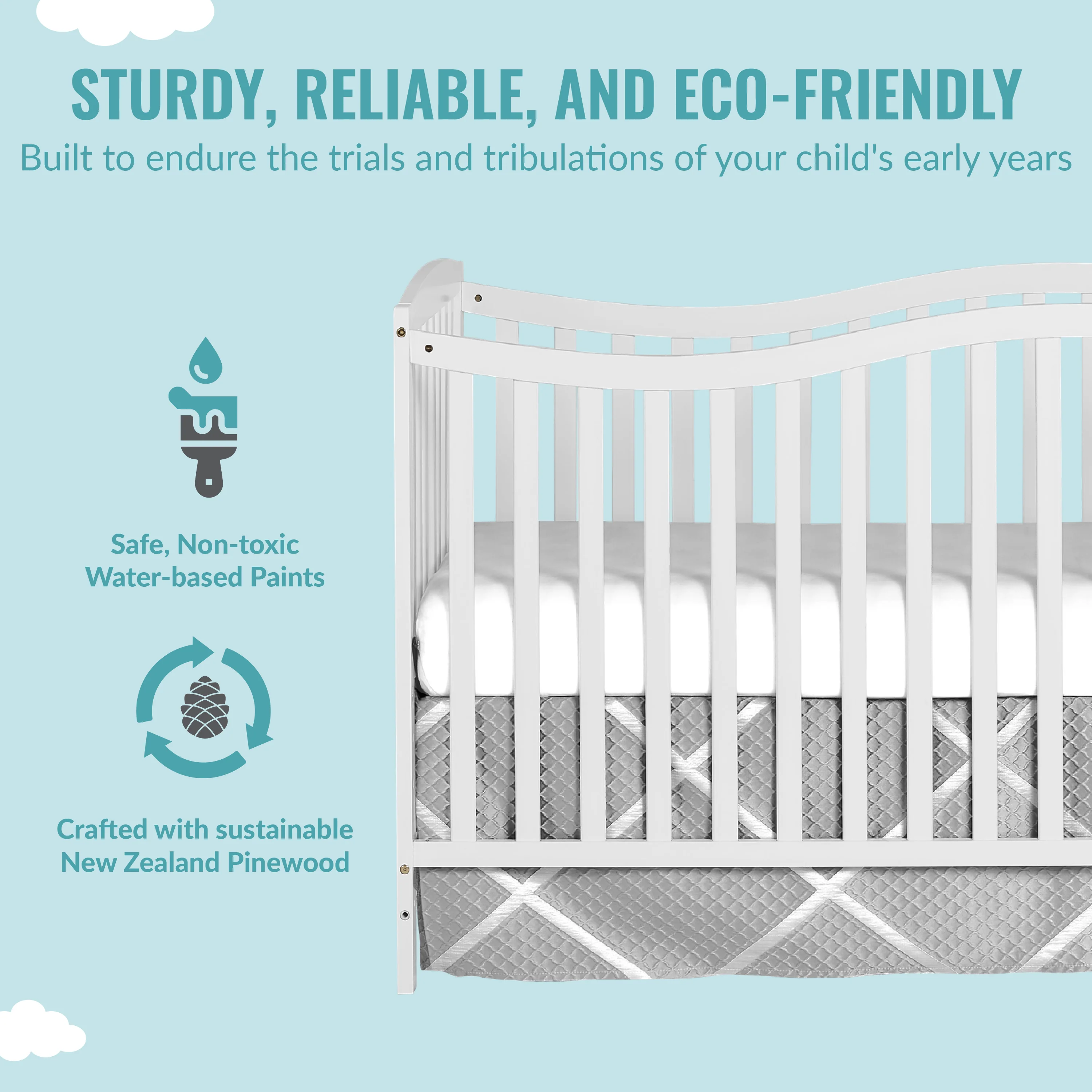 - VERSATILE DESIGN: Built of renewable, sustainable & sturdy New Zealand pinewood, the Chelsea’s sleigh design in non-toxic finishes suits several nursery themes. Its flowing silhouette is offset with straight lines; a low to floor design allows easy access to baby