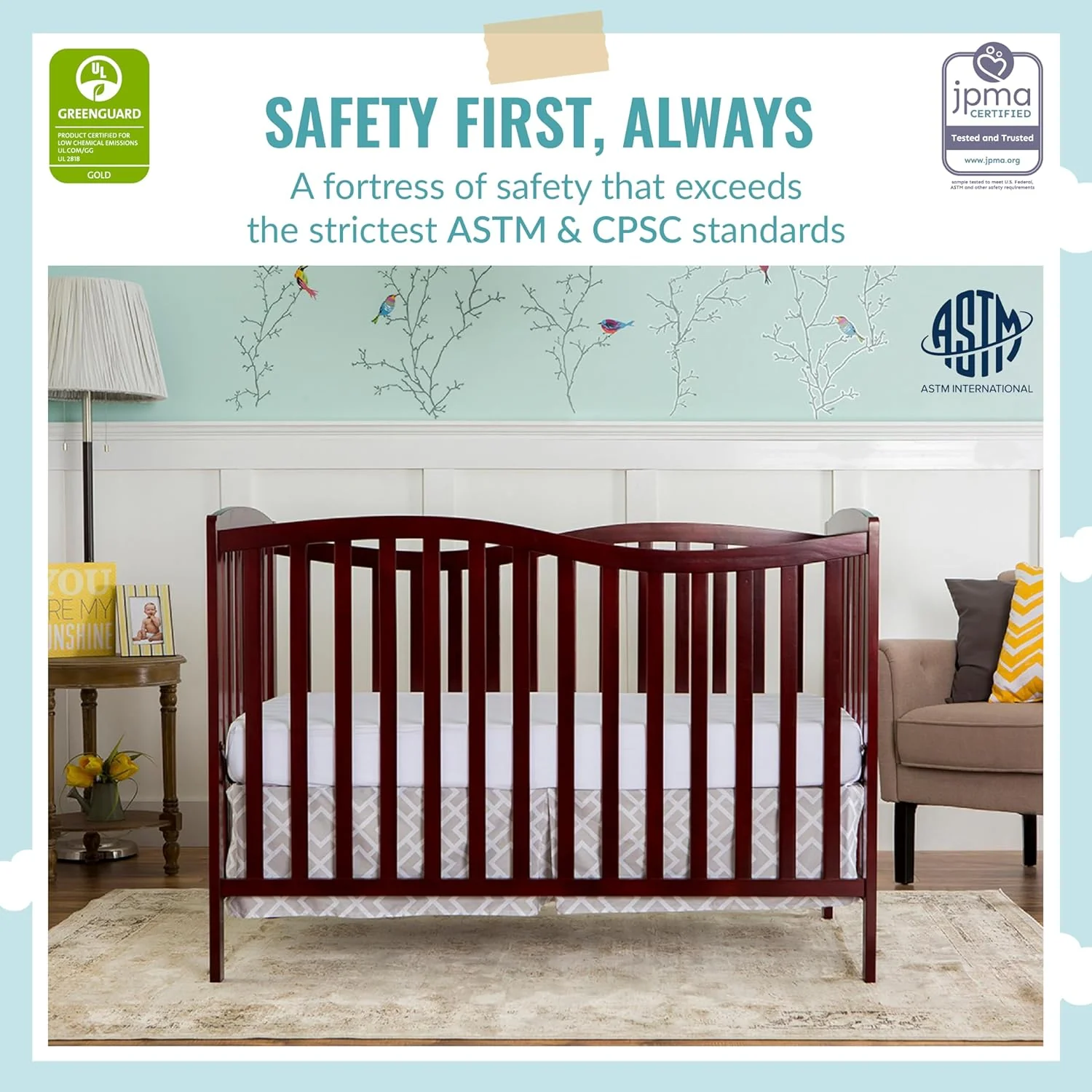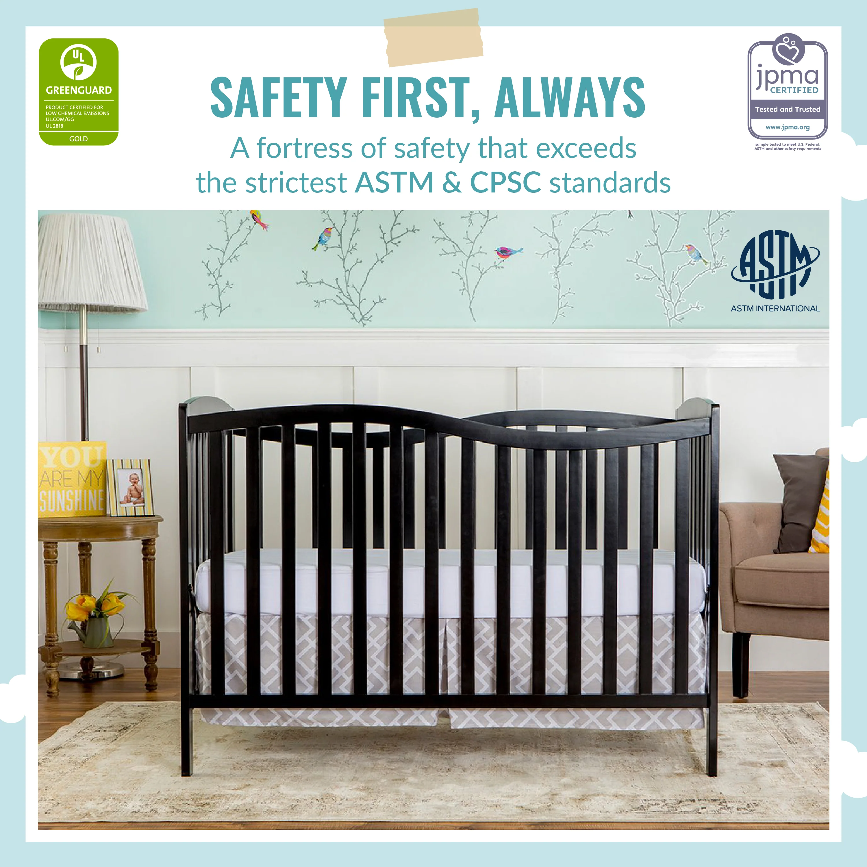 - SAFETY FIRST: The crib has stationary sides for added security. All our cribs are JPMA Certified to meet/exceed CPSC/ASTM safety standards. Our products are tested by 3rd party labs for lead/other toxic elements to meet/exceed CPSC/ASTM safety standards