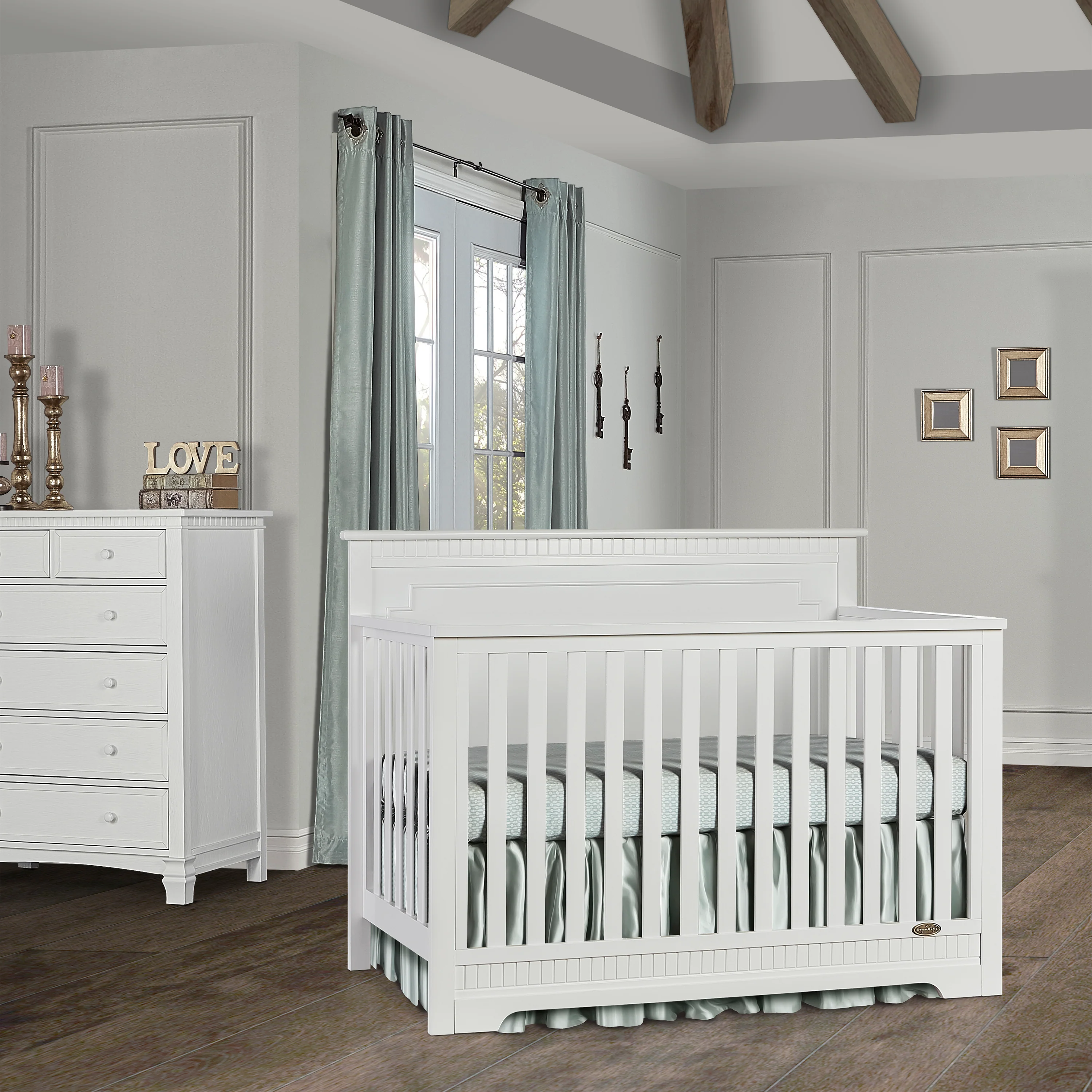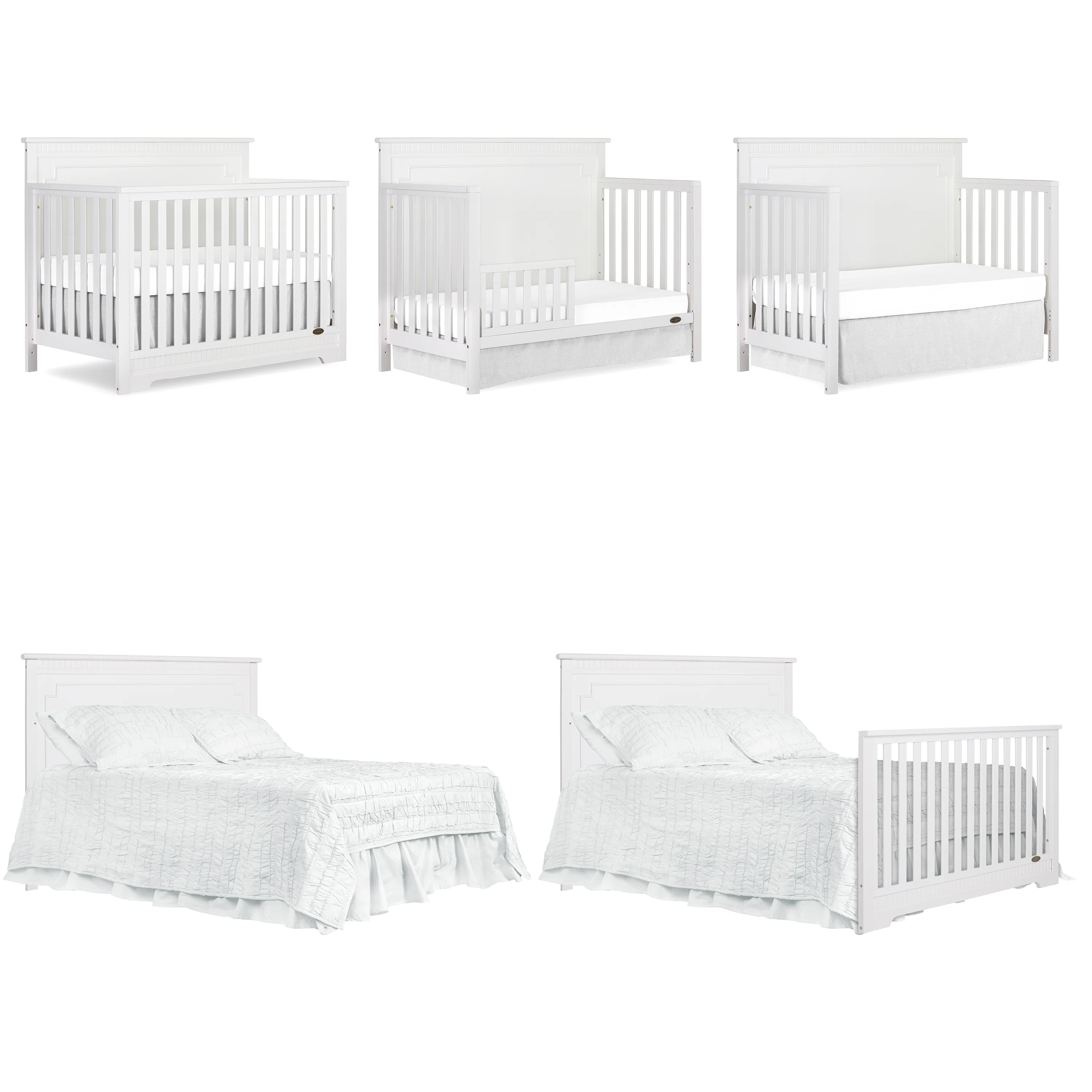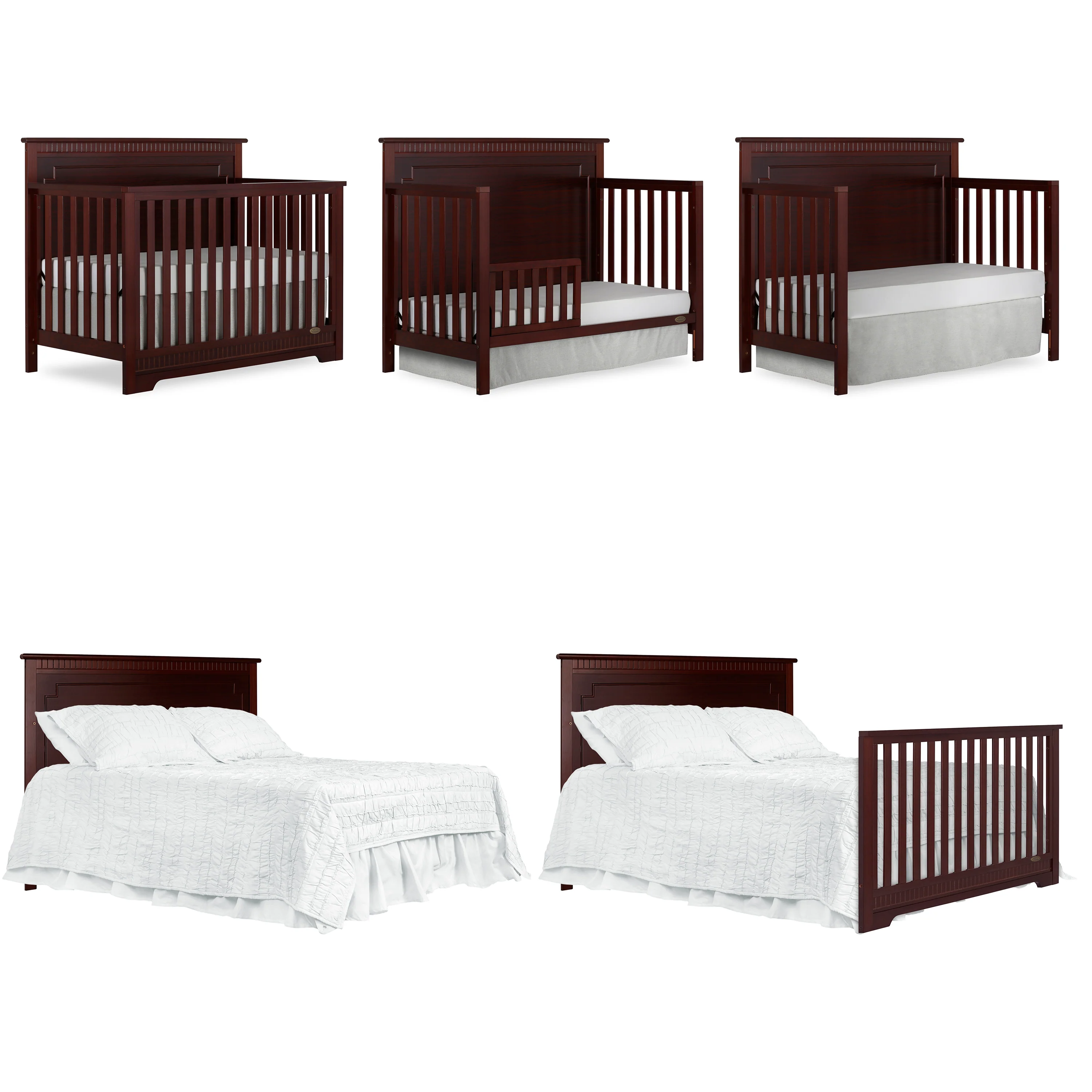 The Dream On Me Morgan inspired by the Boston sky line this modern , 5 in 1 convertible crib featuring full panel headboard connecting natural elements of wood with a flourish of decorator details. Its stylish flat-top headboard features dentil trim molding that lines the headboard and footboard. This crib offers a long term value converting into a charming toddler bed with our conversion kit ( sold separately ), daybed and theback panel converts to a full-size headboard with the simple addition of bed frame ( sold separately). The Morgan mattress platform adjusts to three different heights depending on the age of your baby. All Dream On Me cribs meets all applicable ASTM , CPSC and JPMA standards