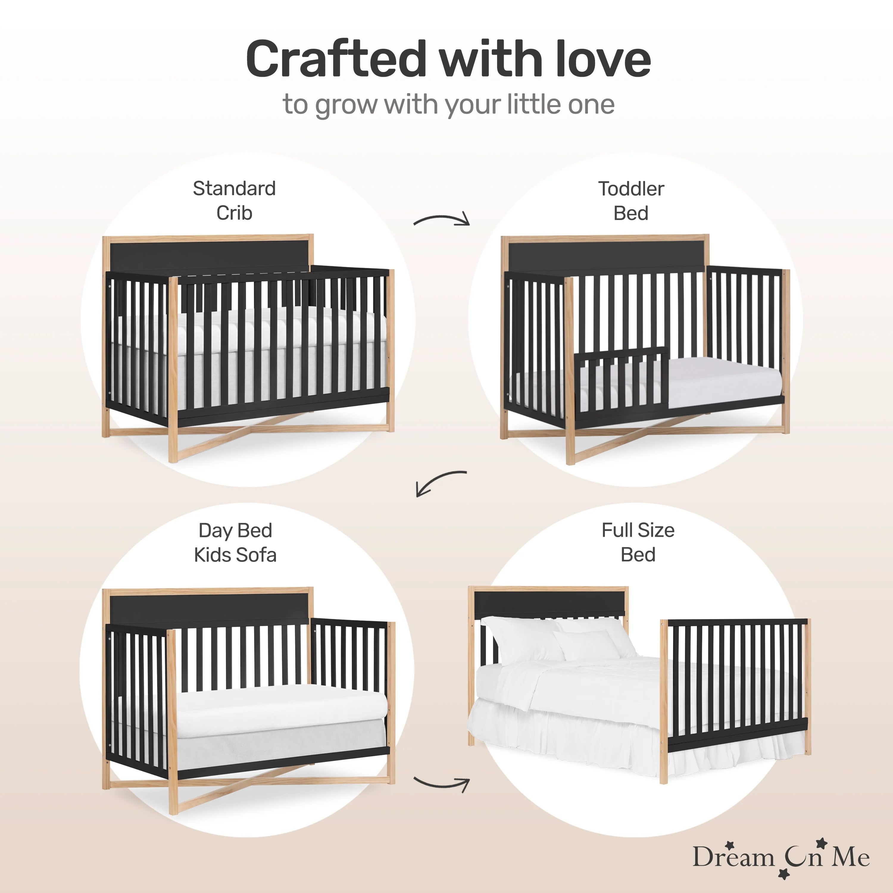 - A DREAMY HAVEN: Crafted to grow with your child through those precious early years, this crib converts to a toddler bed, daybed & full-size bed.