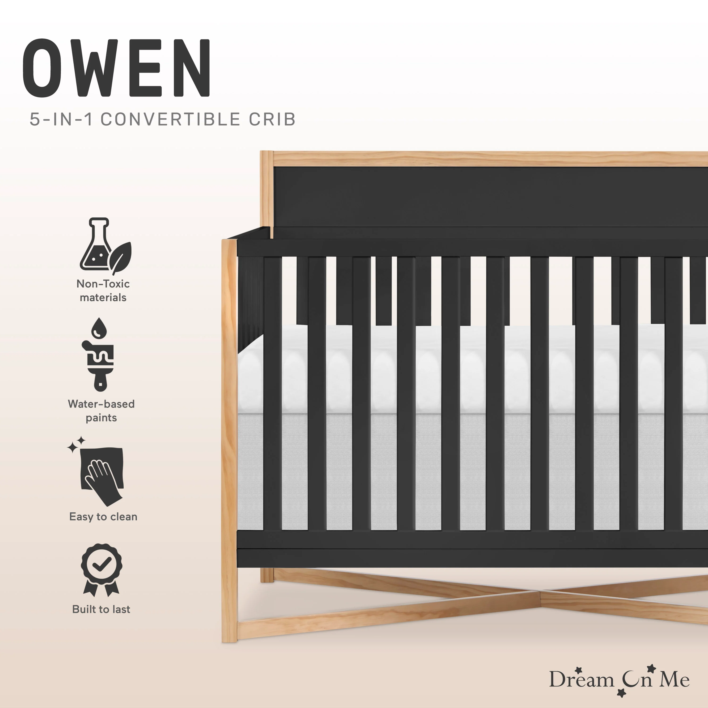 Introducing the Dream On Me Owen 5-in-1 Convertible Crib –where safety, style, and durability converge to create a haven for your little one's dreams. Crafted to grow with your child through those precious early years, this crib converts to a toddler bed, daybed & full-size bed. Created with utmost care, the Owen 5-in-1 Convertible Crib is JPMA certified, meets SOR standards and features water-based paints with a non-toxic finish, ensuring a safe and healthy sleeping environment. The sleek X-shaped base adds a touch of contemporary elegance to the design, making it a focal point in any nursery. Available in two stunning finishes, Matte Black and Vintage White Oak.