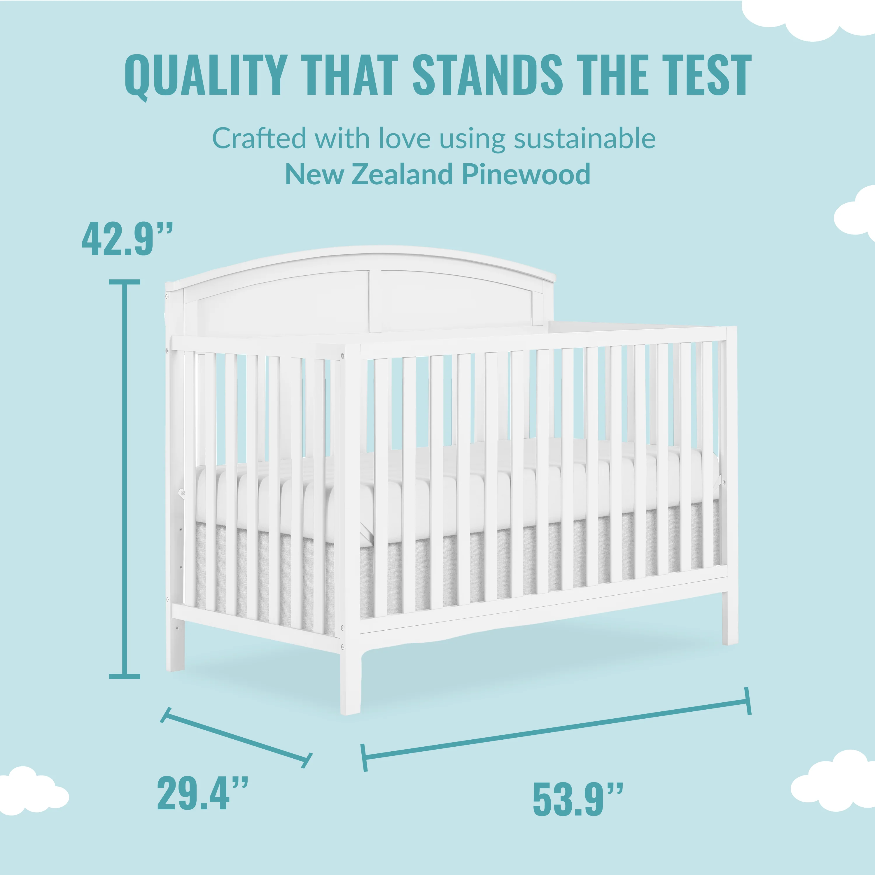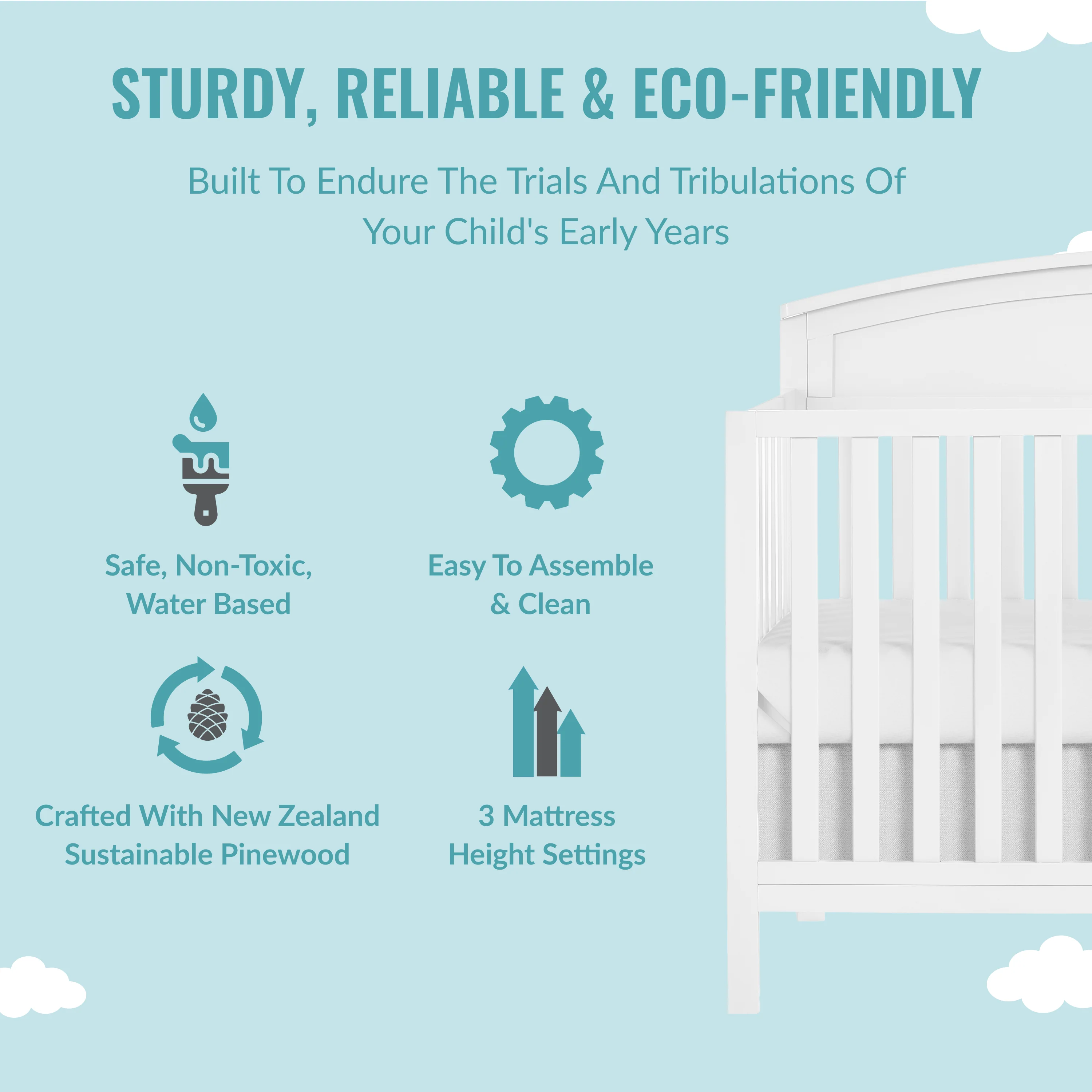 - EASY MAINTENANCE: Built with sustainable New Zealand Pinewood and sturdy wooden spindles, with non-toxic, water based paint, this convenient crib is easy to assemble and clean.