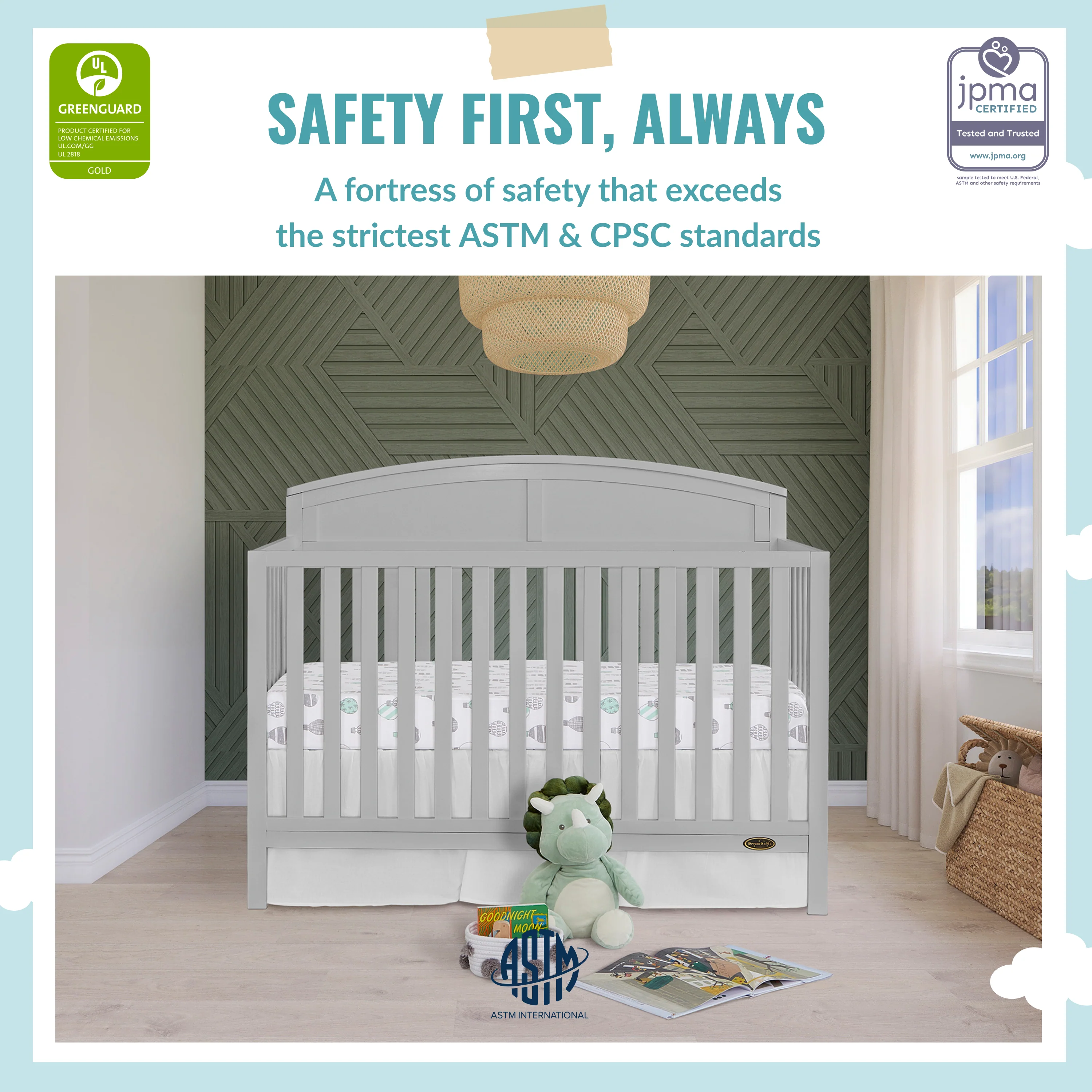 - SAFE CHOICE: The Dream On Me Storybrooke Crib provides utmost safety, as it is both JPMA & Greenguard Gold certified and meets/exceeds the ASTM & SOR standards.