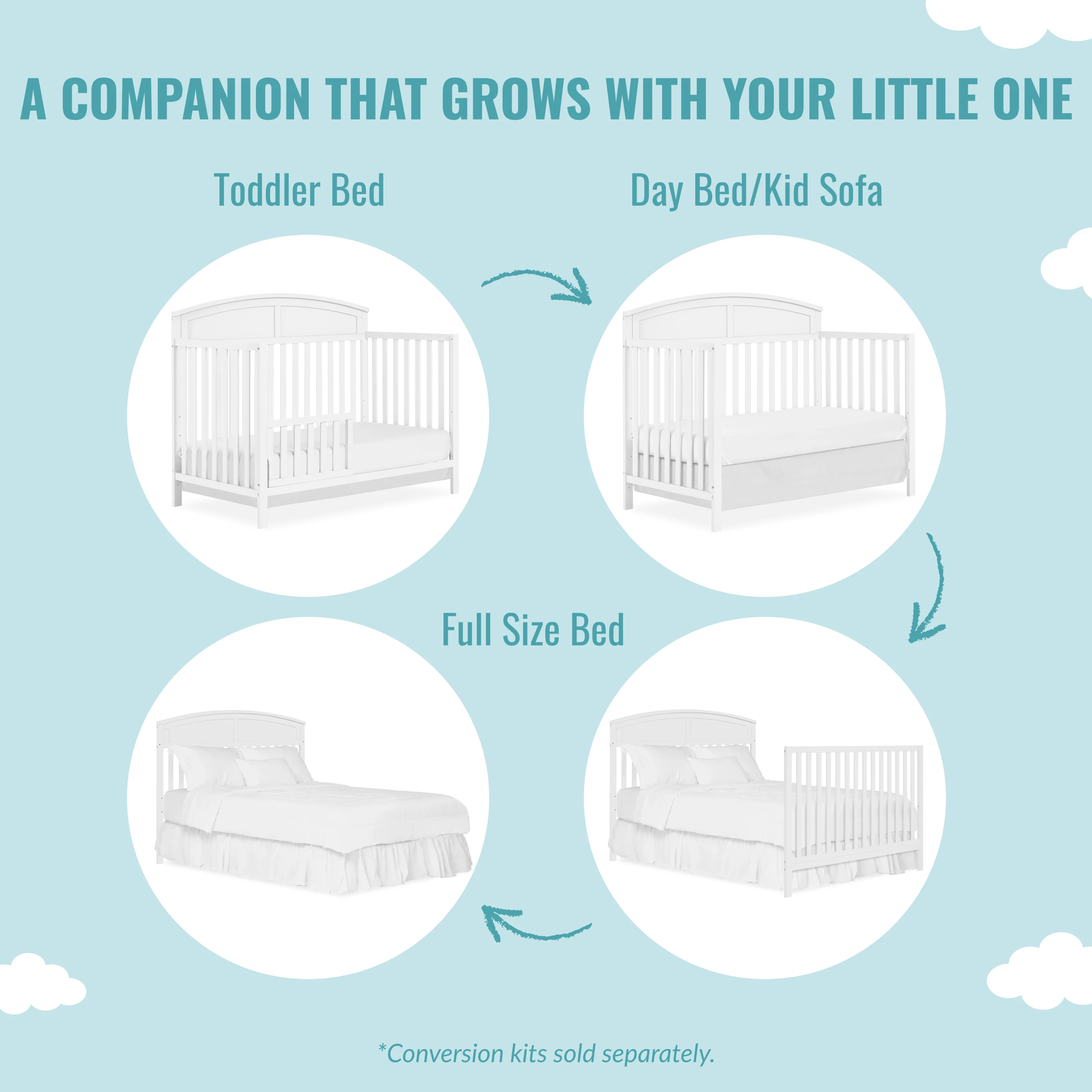 - EFFORTLESS CONVERTIBILITY: This crib easily converts to daybed, toddler bed & full-size bed (conversion kit sold separately), with a 3-position adjustable mattress height setting.