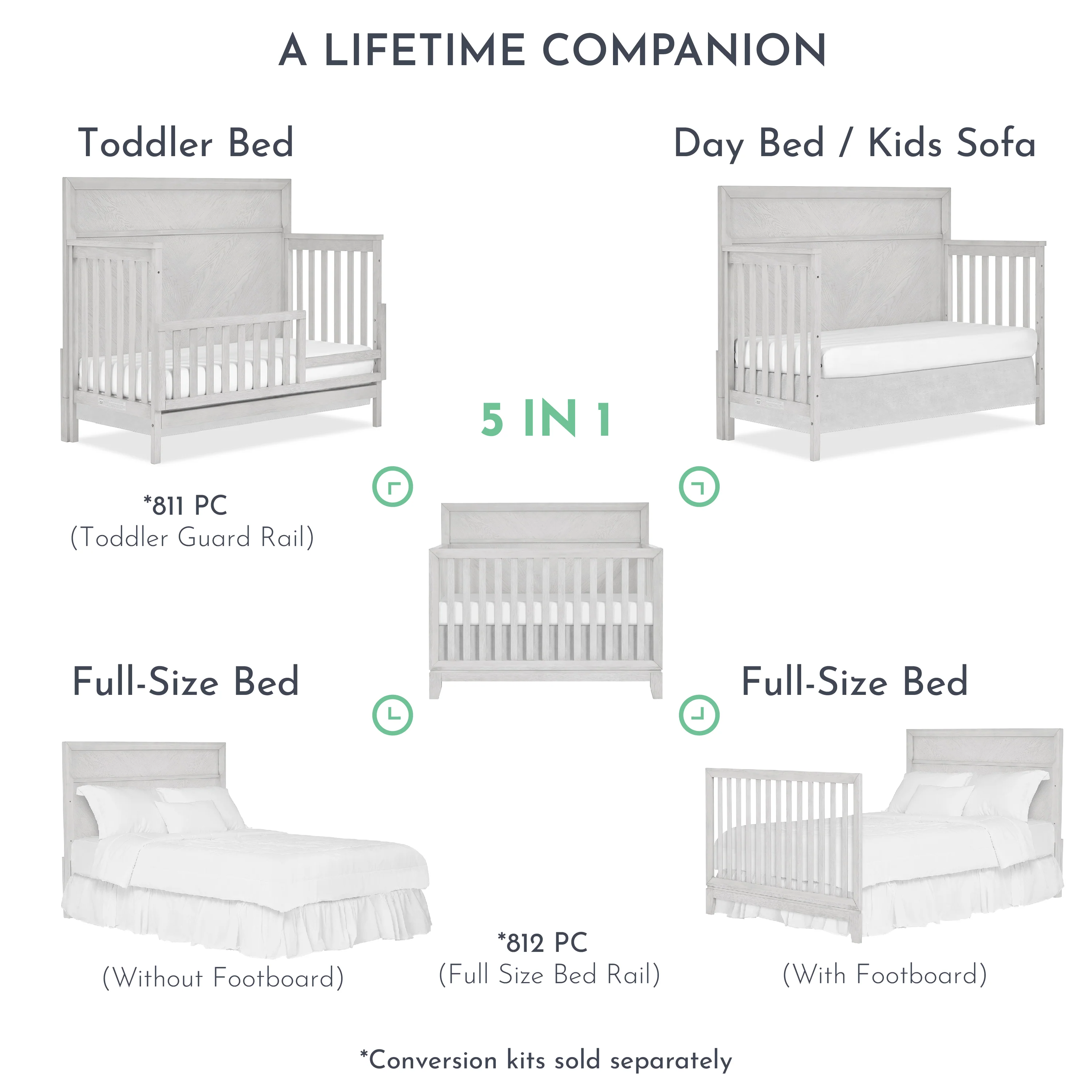 - Converts to a toddler bed, daybed as well a full-size bed with our conversion kit sold separately.