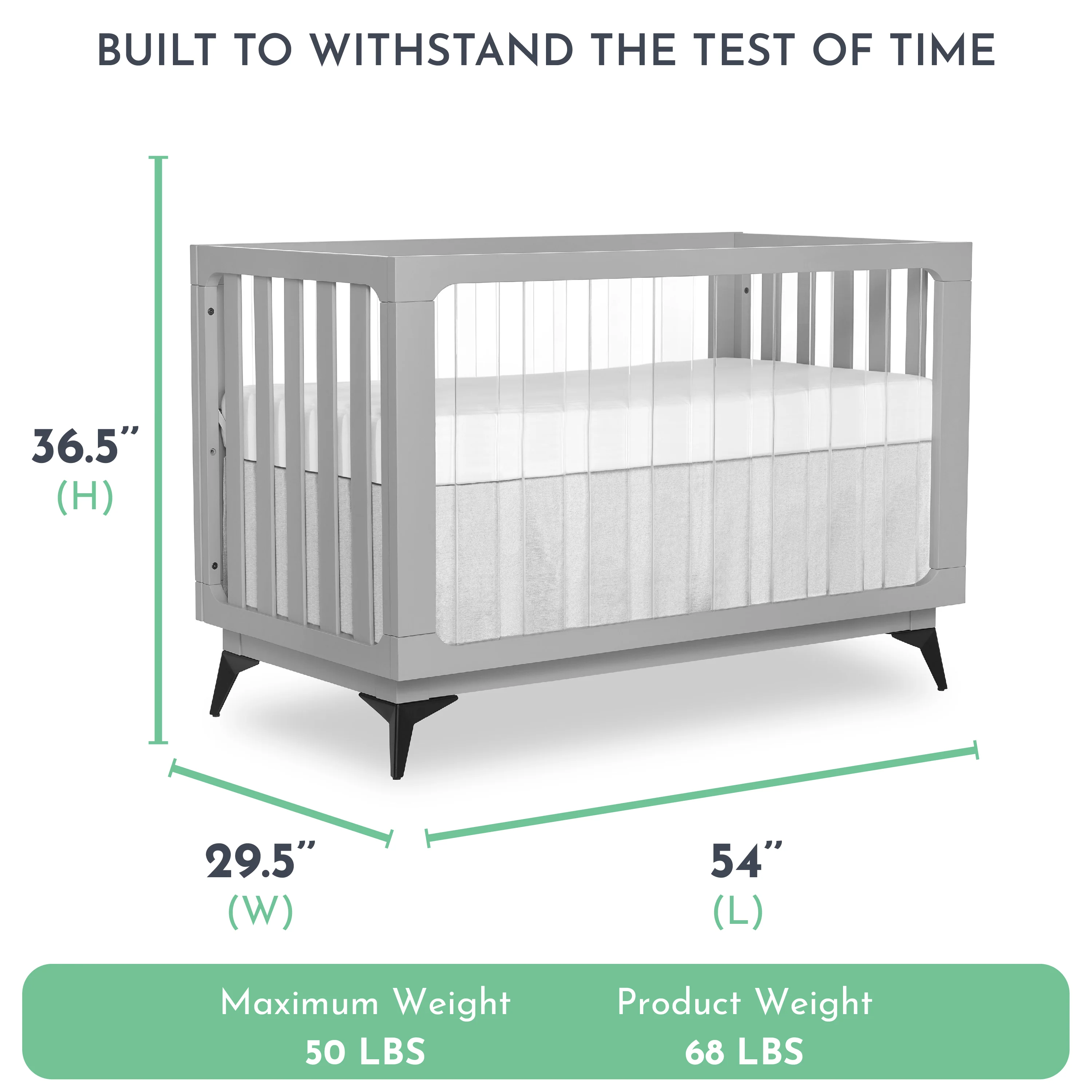 Evolur Acrylic Millennium crib features sleek lines that capture the sophisticated restraint of modernism. This design offers a hit of an industrial element with its sliver metal fitted feet; the clear slats provide an airy, open feel that seamlessly blends with your chosen design aesthetic. The Modern crib is designed to converts to a toddler bed and day bed to accommodate your growing child (conversion rails sold separately). This crib can be paired with a mixture of rich warm jewel tones, patterns combing with tasteful furniture creates a fun and cheery nursery.