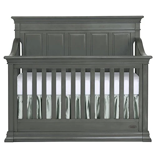 The bold lines and large intricate molding on the full panel headboard resemble ancient columns and lend to a traditional nursery style perfect for any gender. Available in java, distressed slate, stone, and distressed white colors. This 5-in-1 convertible crib will grow with your child well into their young adult years. The crib pairs perfectly with the matching clean lines of its double dresser, chifforobe, and hutch/bookcase.