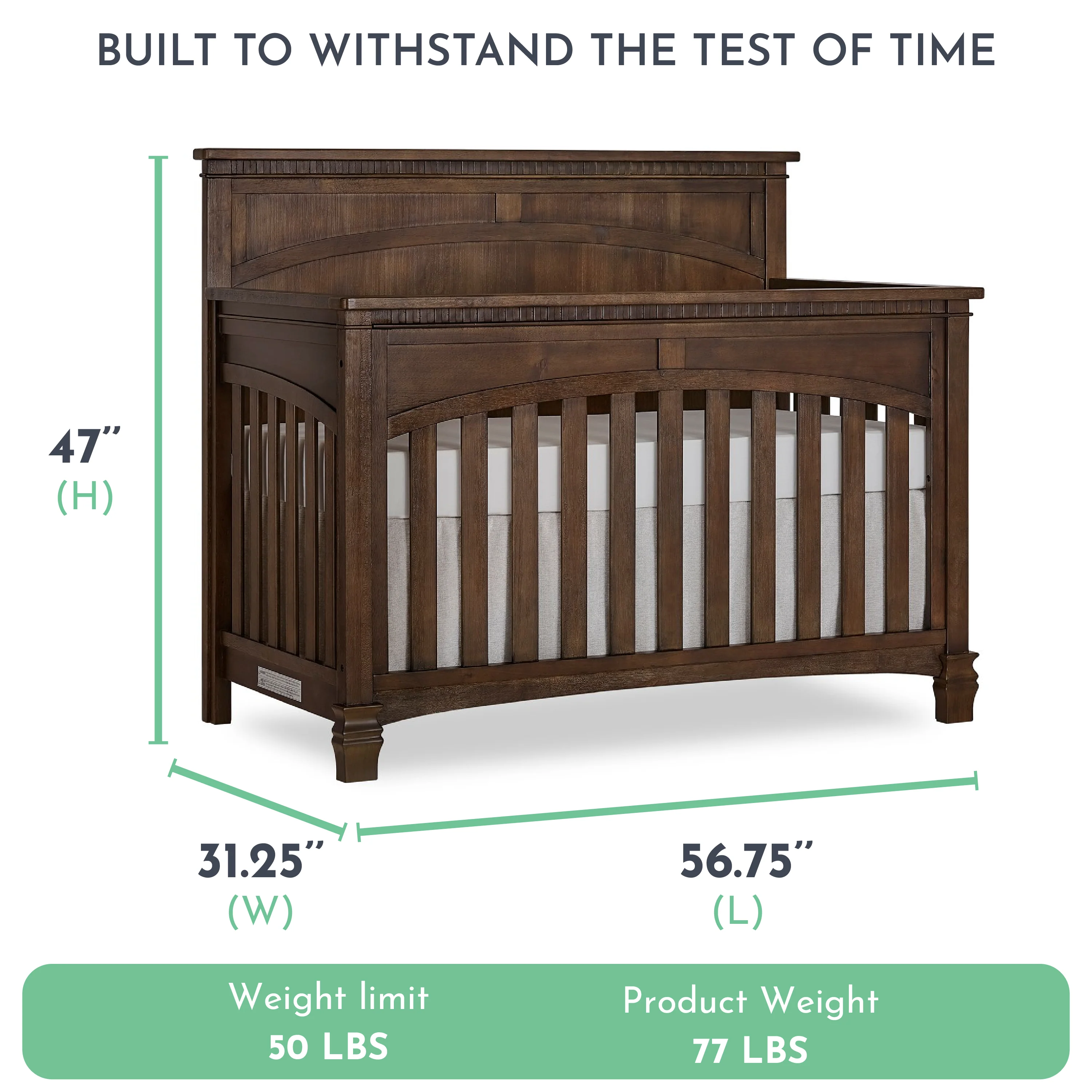 - Clearance Under Crib: "-Mattress Support Heights: "H, "H, "H-Weight: lbs.-Toddler Bed Conversion Rails: "L x "W x "H-Toddler Bed Conversion Rails Weight: lbs.