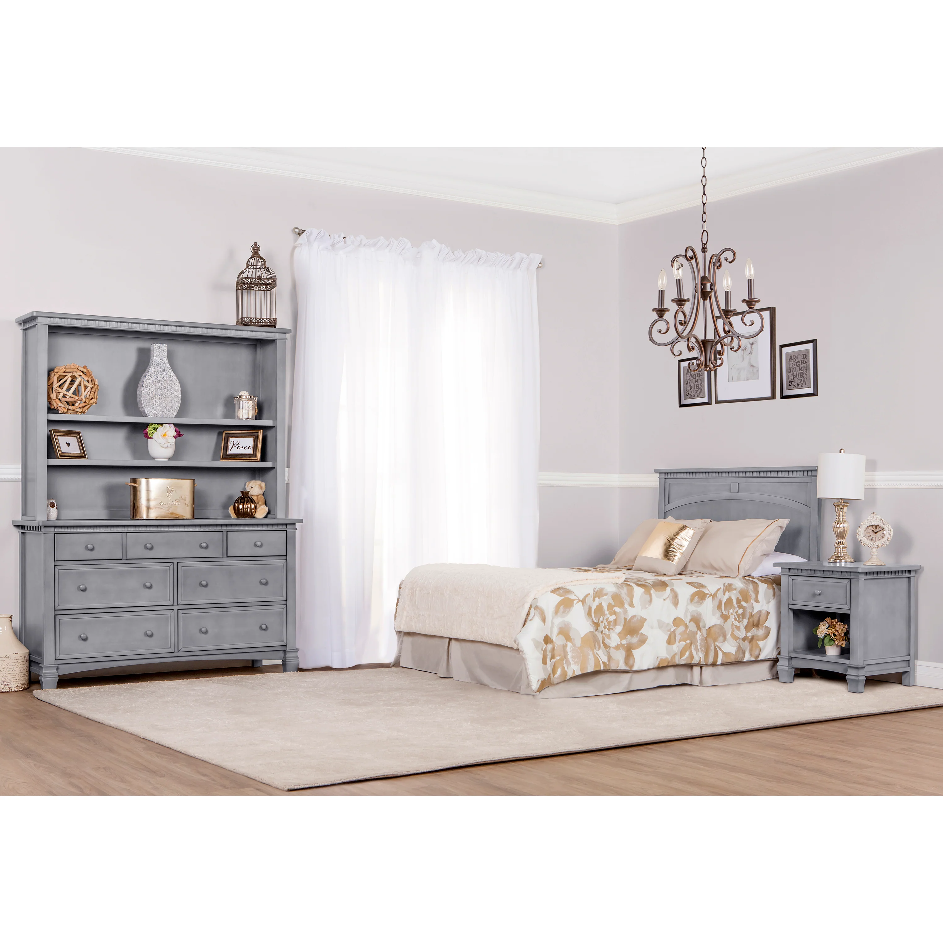 The Evolur Santa Fe 5 in 1 convertible crib offers a softer look with its full flat top panel design. Highlighted by detail routing, dentil molding, fluting and imperial feet adds a touch of charm. The Santa Fe 5 in 1 crib easily transitions from a standard size crib to a toddler bed, day bed and option as a full size bed (rails sold separately for full bed) . Paired with its matching Double Dresser, Chest, Hutch/Bookcase and nightstand this collection will continue to impress long after your baby grows out of his nursery into a room of his own. This collection is available in Vintage Gray, Steele Gray and Distressed White colors.
