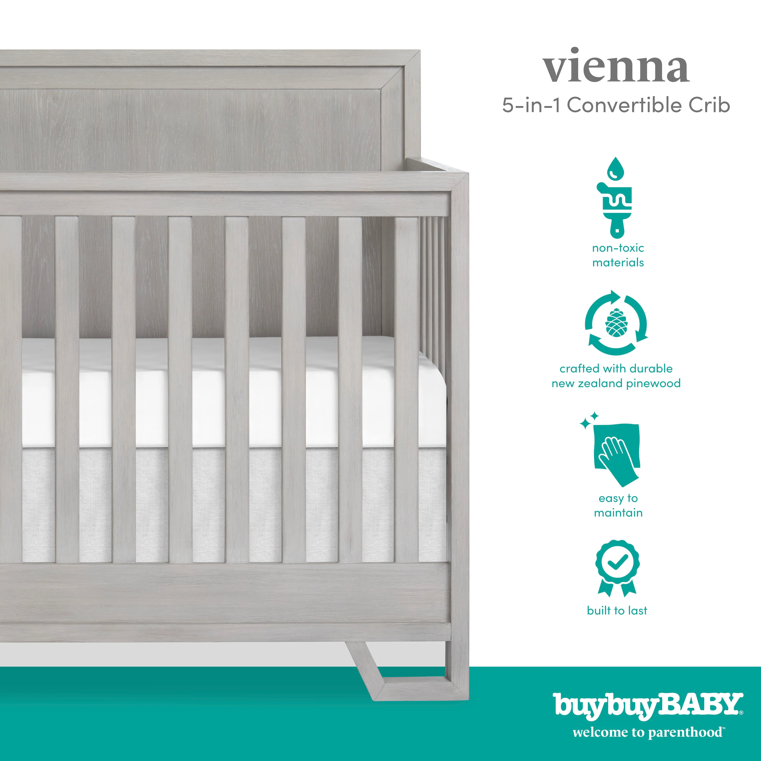 • VERSATILE CRIB: Built for durability & easy to maintain, the versatile BuyBuyBABY Vienna 5-in-1 Convertible Crib is a harmony of style & functionality.