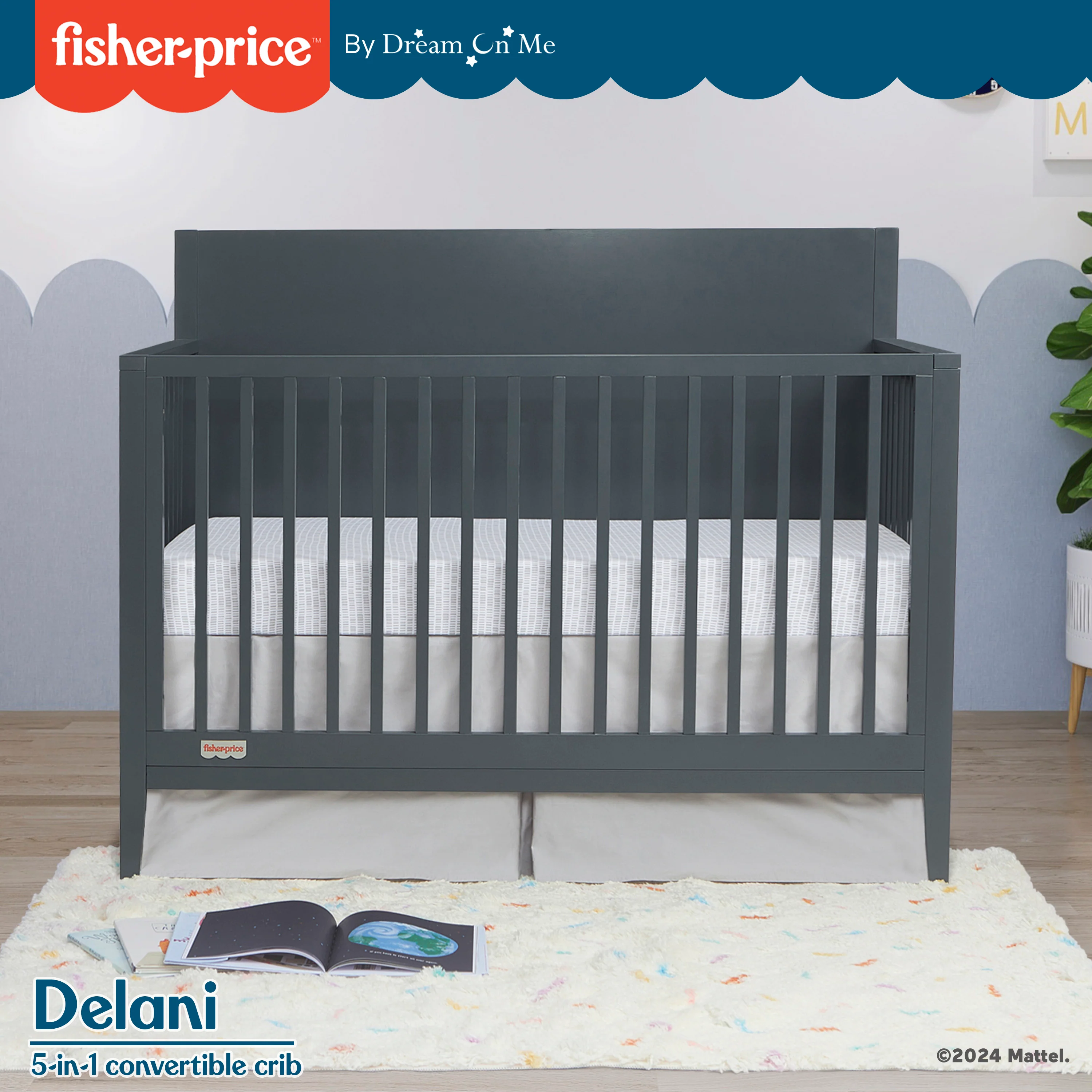 Be it some restful downtime or fun-filled playtime, your little dreamer deserves only the best. And that’s exactly what the all-new Fisher-Price�?by Dream On Me Delani 5-in-1 Convertible Crib brings - a snug oasis for ultimate relaxation! Crafted to seamlessly grow along with your little one, this crib transitions to a toddler bed, daybed and full-size bed (Conversion kit sold separately). With your child’s safety being our top priority, the Fisher-Price by Dream On Me Delani 5-in-1 Convertible Crib is JPMA & Greenguard Gold certified and meets/exceeds ASTM and CPSC standards. Built with durable New Zealand Pinewood and sturdy wooden spindles, this crib is complete with a child-safe, non-toxic finish. Easy to spot or wipe clean, the Fisher-Price by Dream On Me Delani 5-in-1 Convertible Crib involves very low maintenance. Available in a versatile Carbon finish, bring this wonderful haven of comfort and joy into your child’s life. Product dimensions are 54 1/2" L x 29 5/8" W x 44 3/8" H, with a weight of 72.75 Lbs and a maximum weight limit of 50 Lbs.