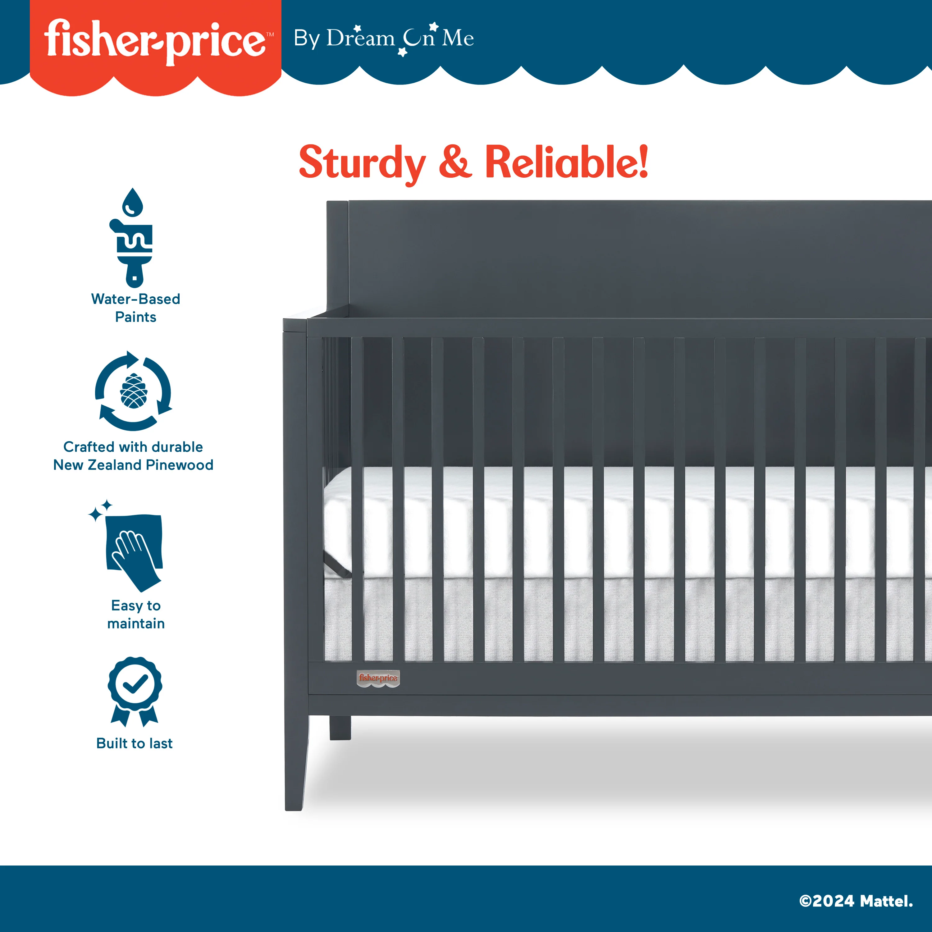 - SOLID & STURDY: Built with durable New Zealand Pinewood and sturdy wooden spindles, this crib is complete with a child-safe, non-toxic finish. Easy to spot or wipe clean, the Fisher-Price�?by Dream On Me Delani 5-in-1 Convertible Crib involves very low maintenance.