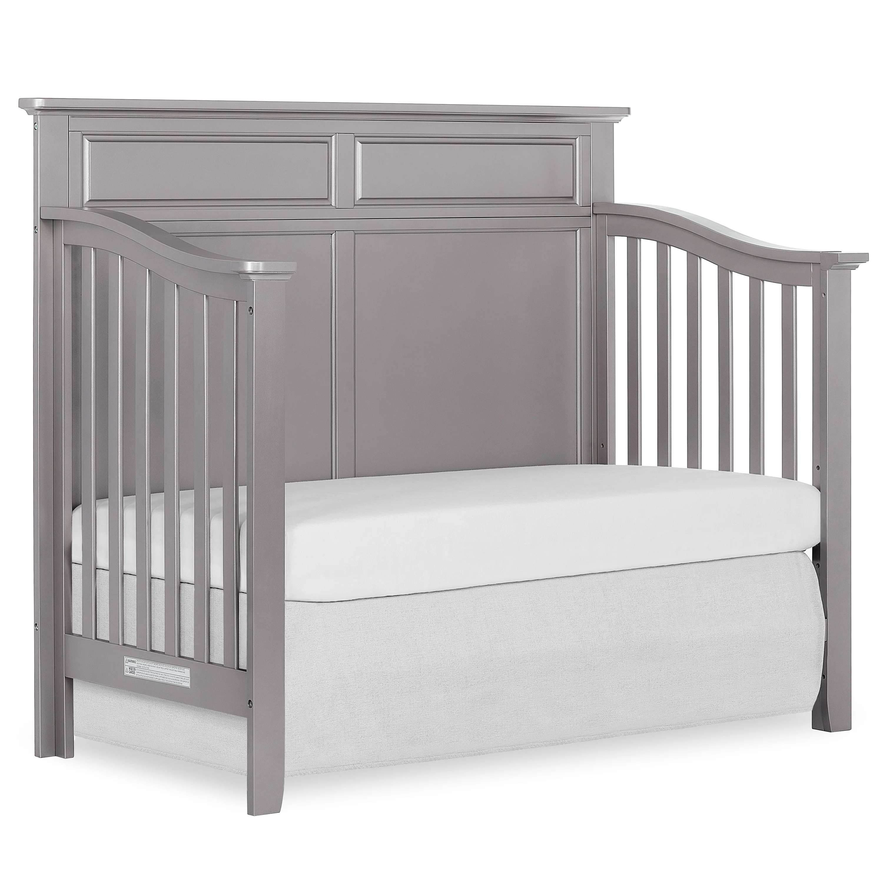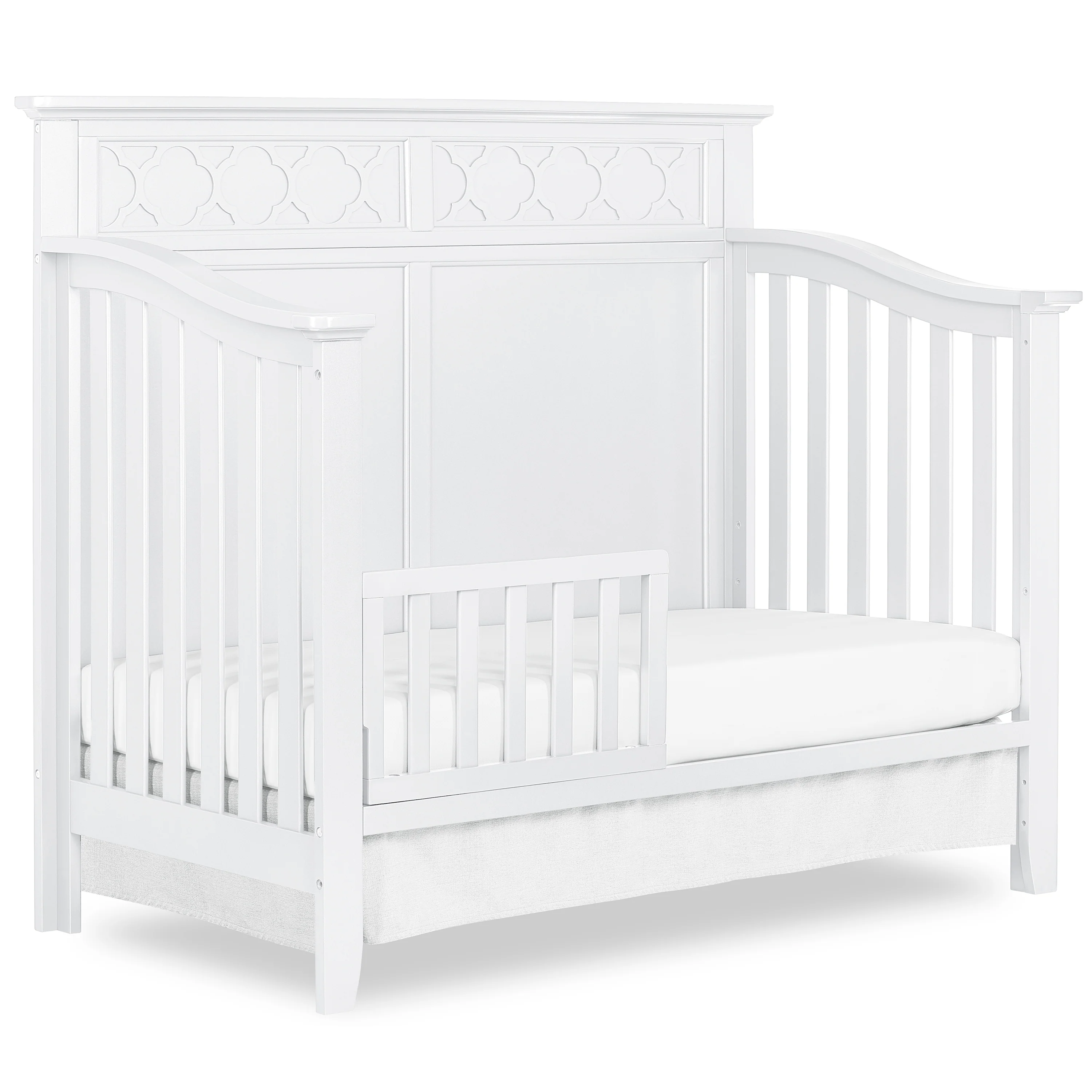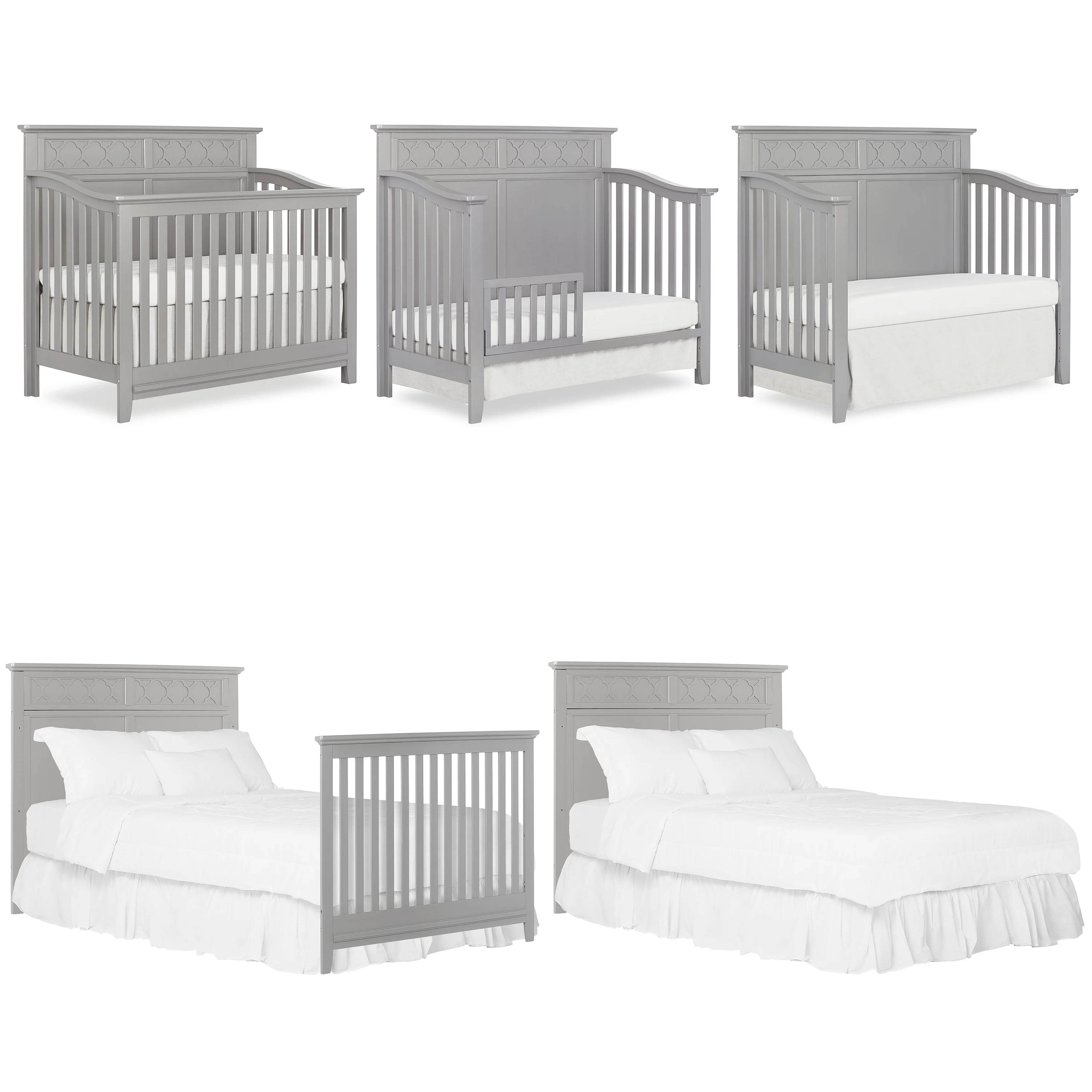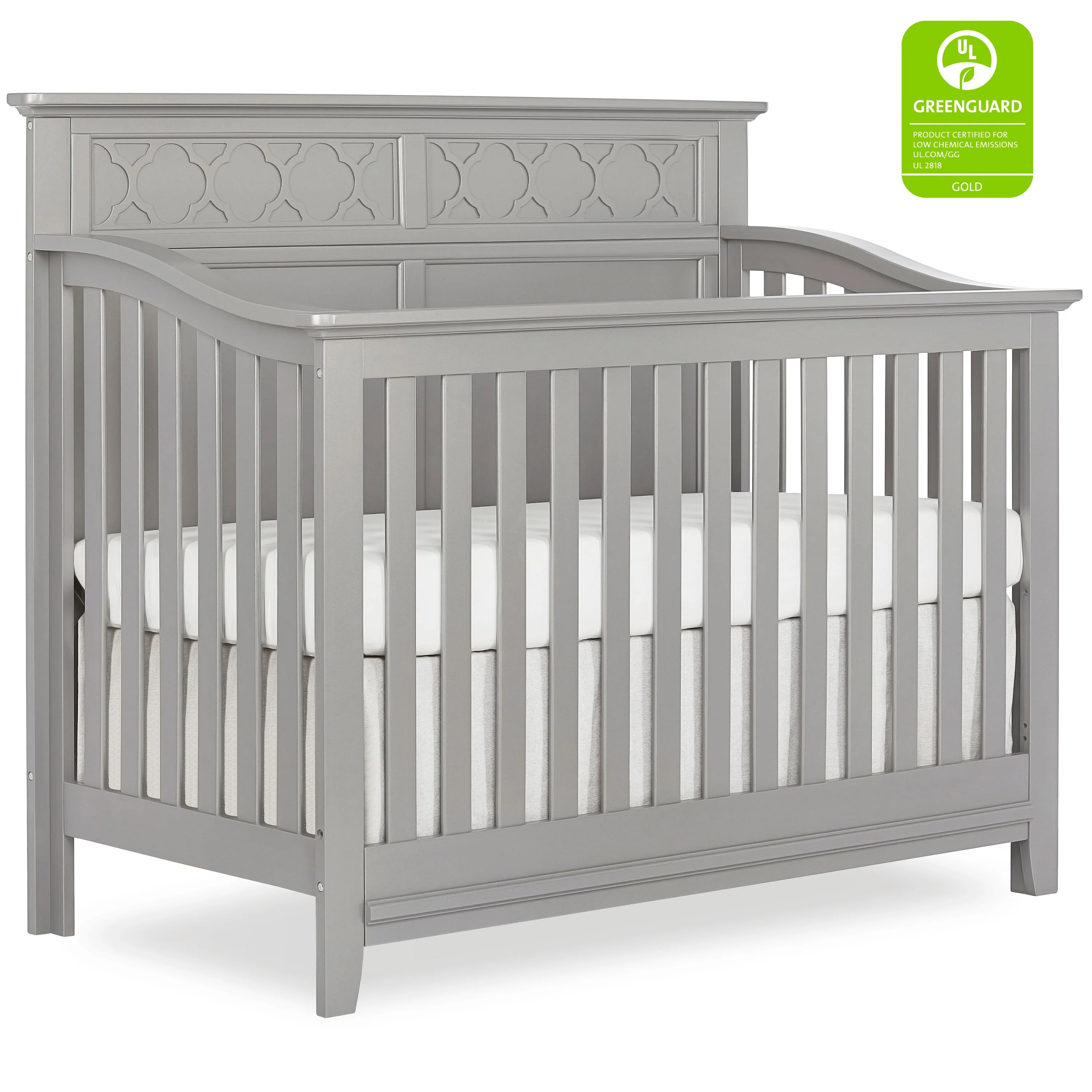 SweetPea Baby Fairview crib captures a transitional styling with a full panel headboard and quatrefoil decal, this crib offers lavish sophisticated elements that bring a little modest simplicity to an ageless nursery. The Fairview crib is designed to converts to a toddler bed and day bed to accommodate your growing child (conversion rails sold separately). This crib can be a mix or match with other furniture, glossy accents or neutral color schemes or go with a vintage or antique feel by combing patterns and colors to create a one of a kind nursery.