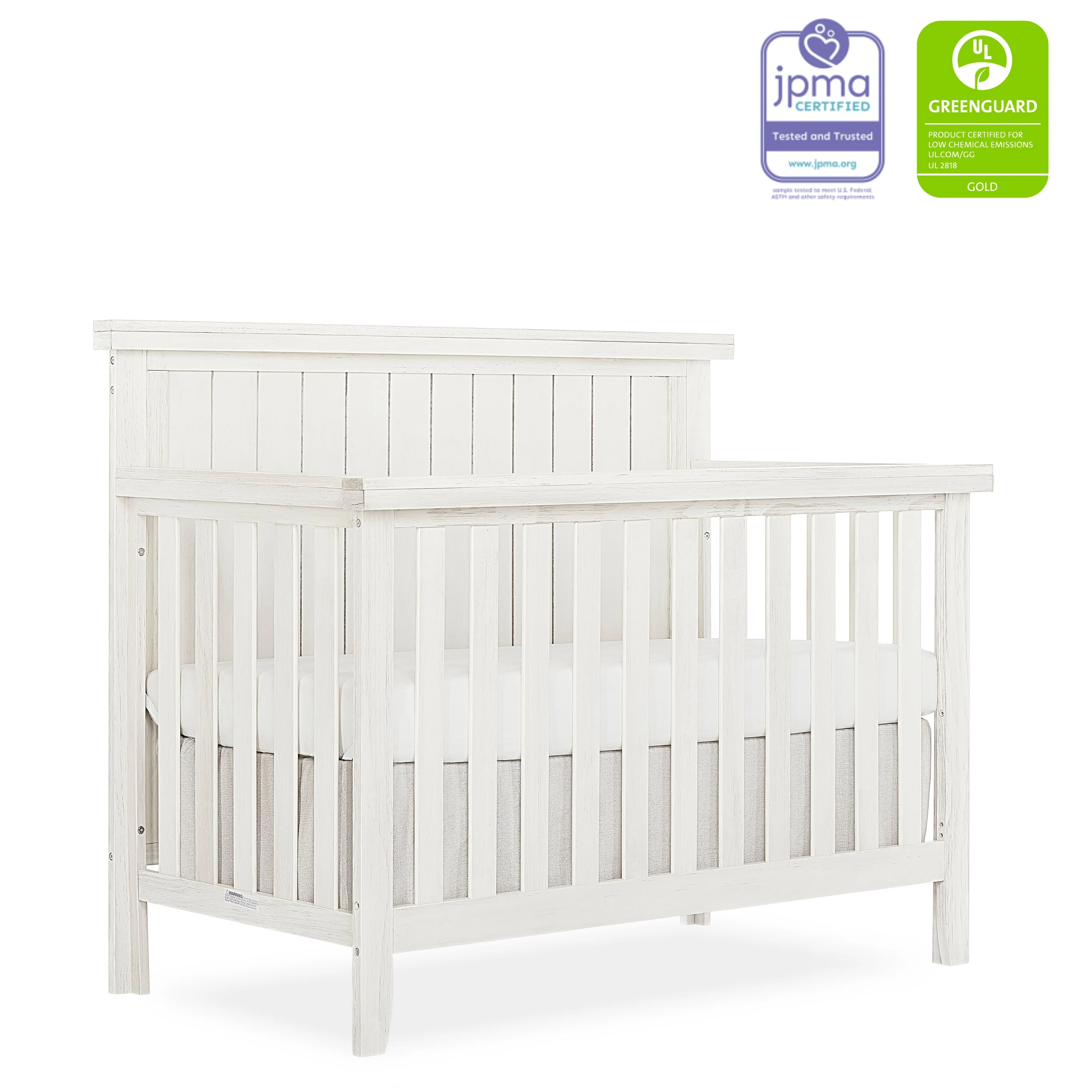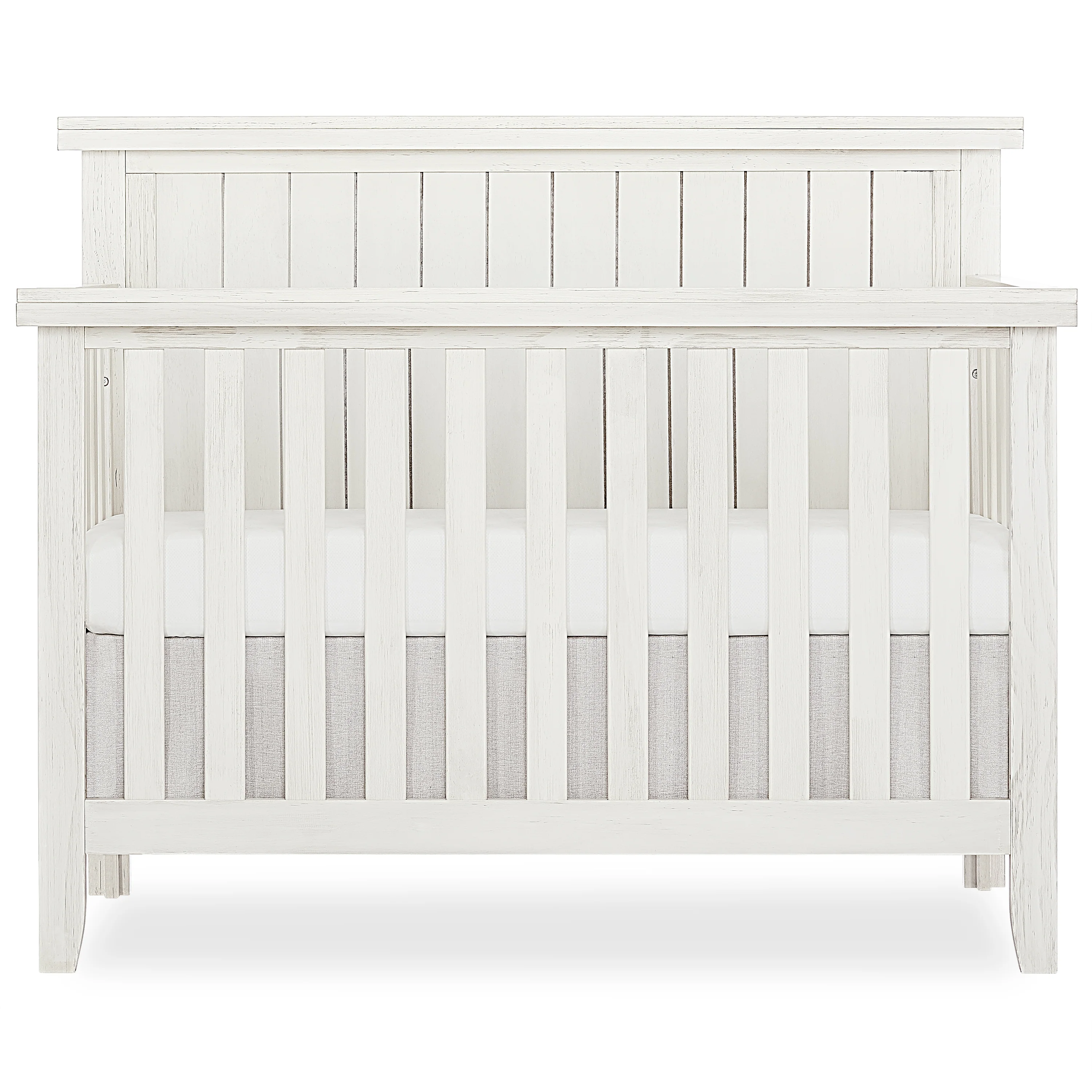 - The Red Wood crib is designed with a plank pattern headboard and an aged finish which creates a modern farmhouse nursery.