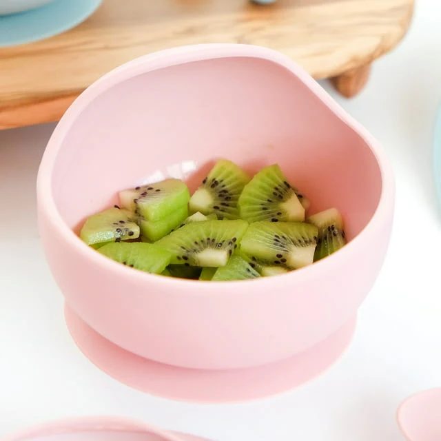 - 5-piece set of unbreakable silicone tableware for infant and toddler boys and girls ages 4+ months; contains 2 self-feeding utensils, one silicone bib with catch pocket, one silicone suction bowl, one 2oz. self-feeding training cup