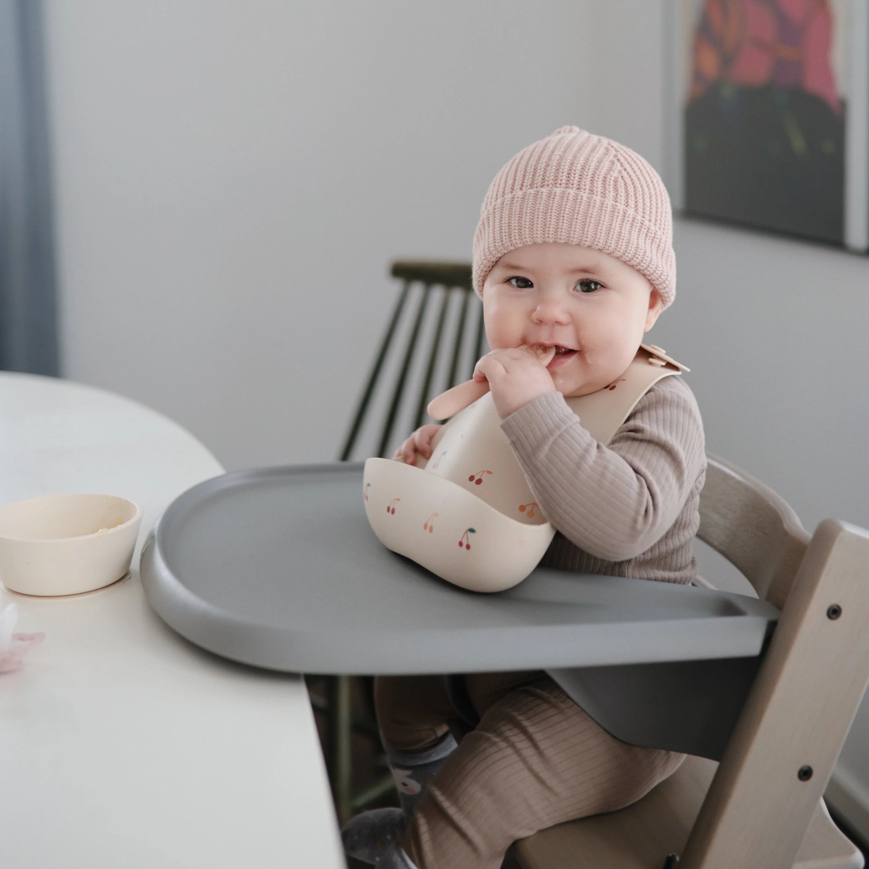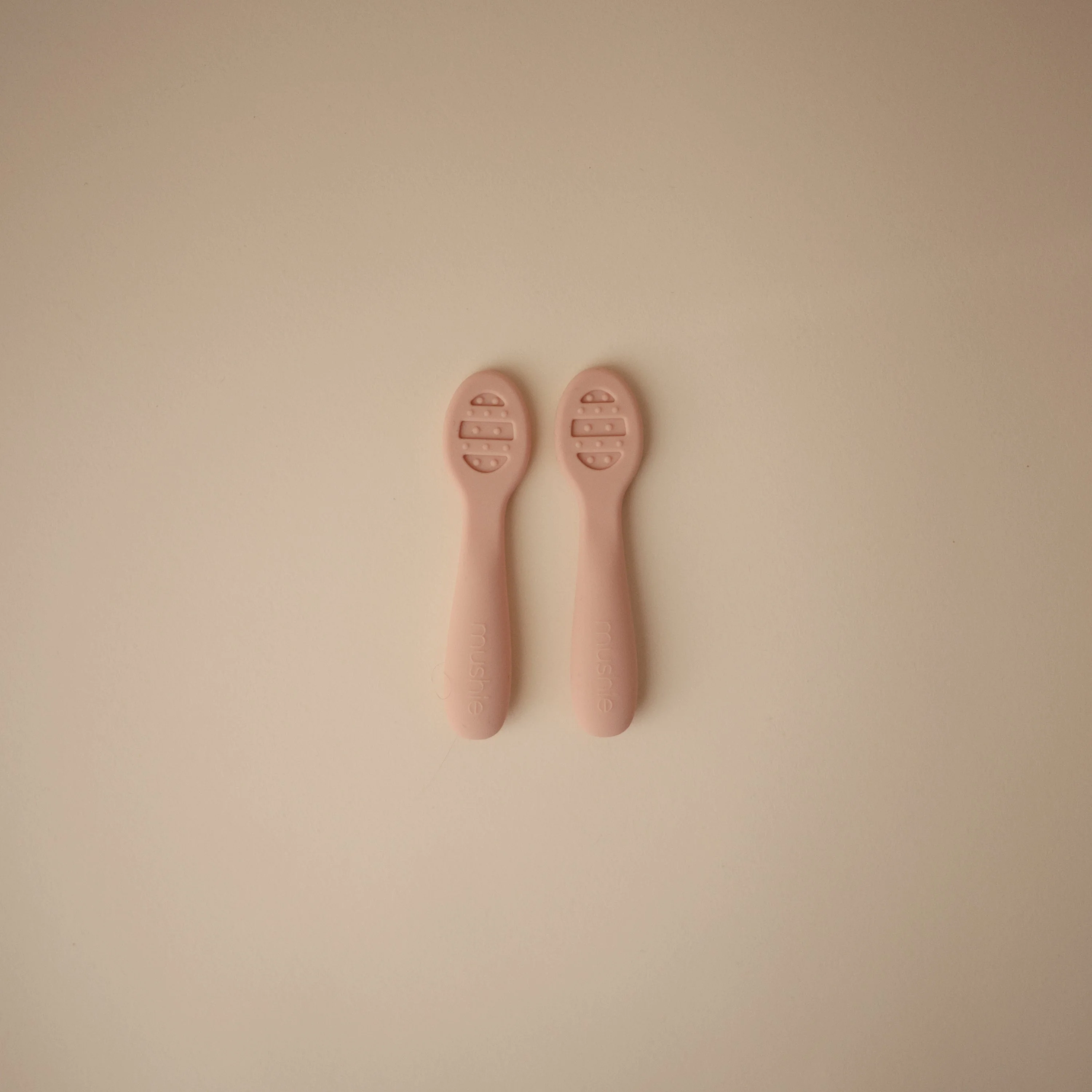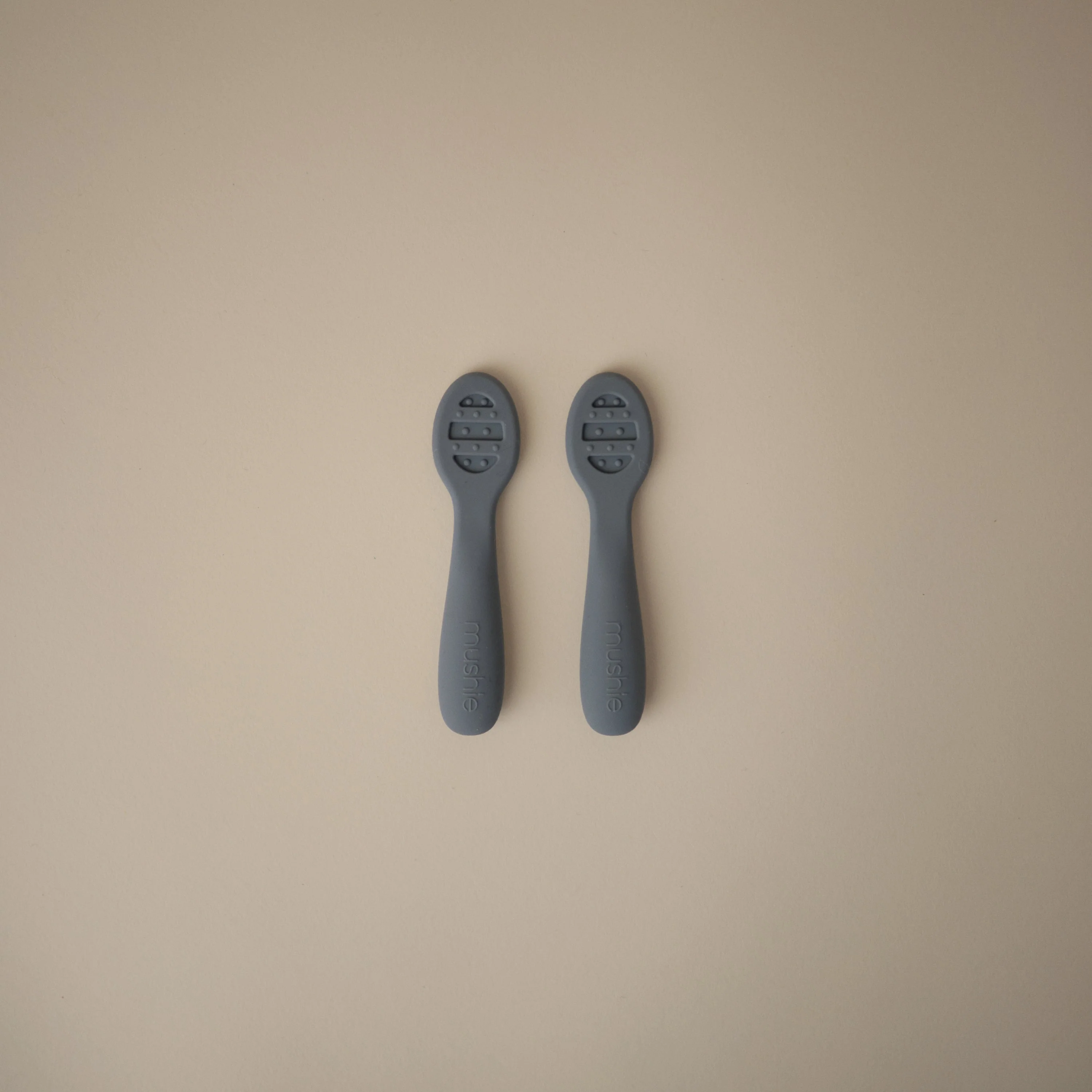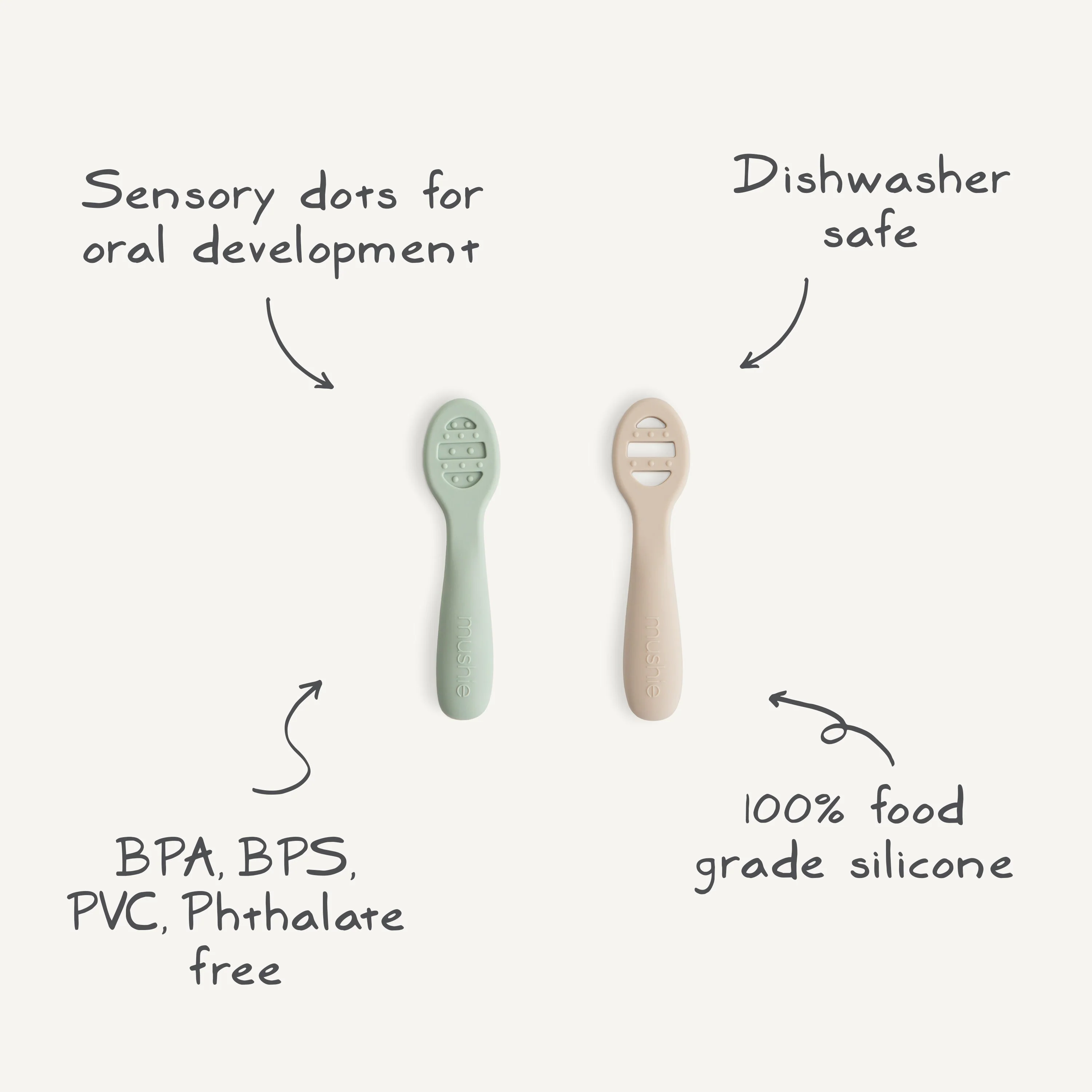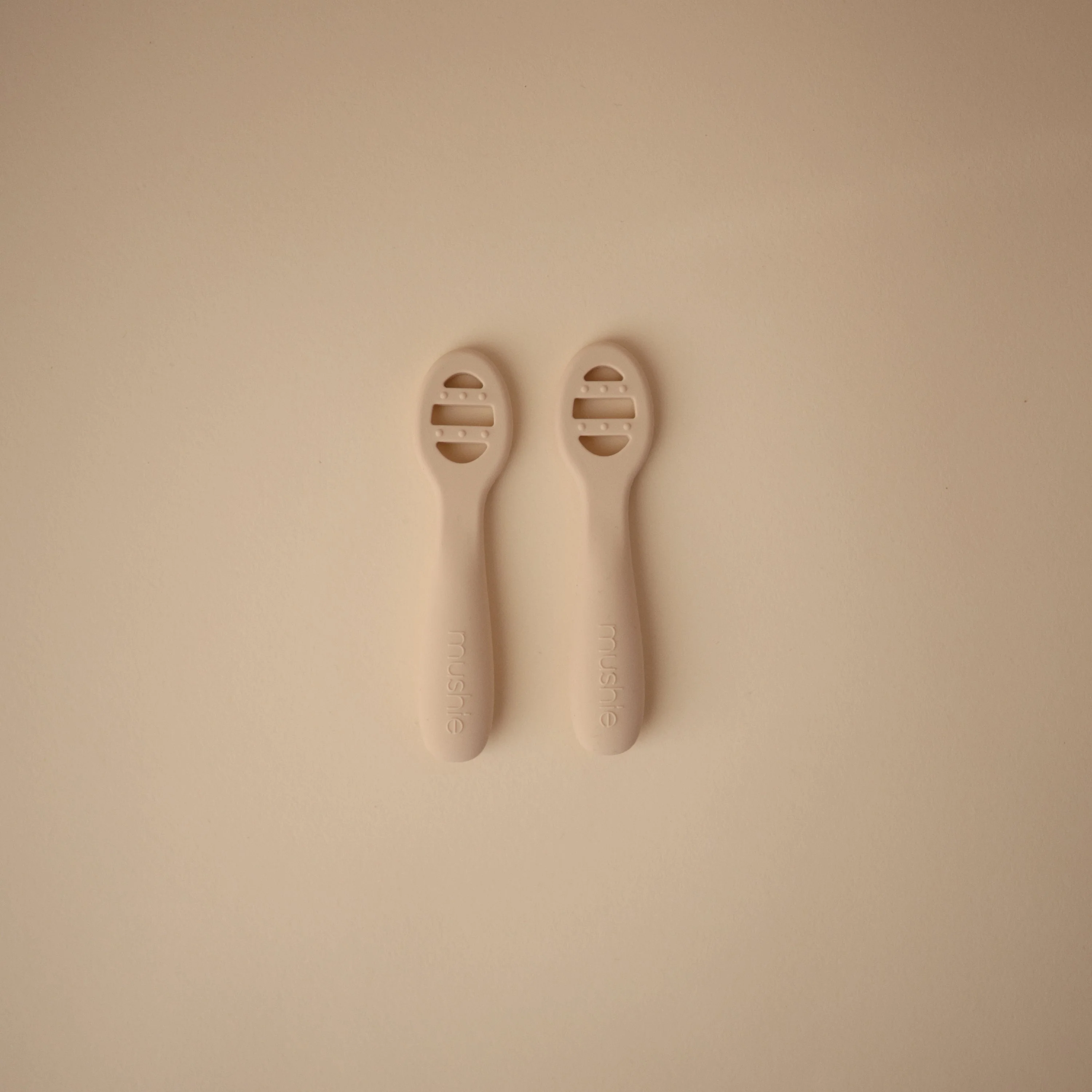 Our First Feeding Baby Spoons are designed to make your little one's transition to self-feeding smoother. Stage 1 has a solid surface without holes, ideal for thin purees and yogurts. When babies are ready for heartier textures, they can transition to Stage 2 with open slots for scooping thicker foods like oatmeal and mashed potatoes. Both versions include sensory dots on each side, providing a soothing experience for teething gums. The flat design ensures there's no wrong way to pick up the spoons, making it easy for little hands to manipulate without requiring wrist rotation.