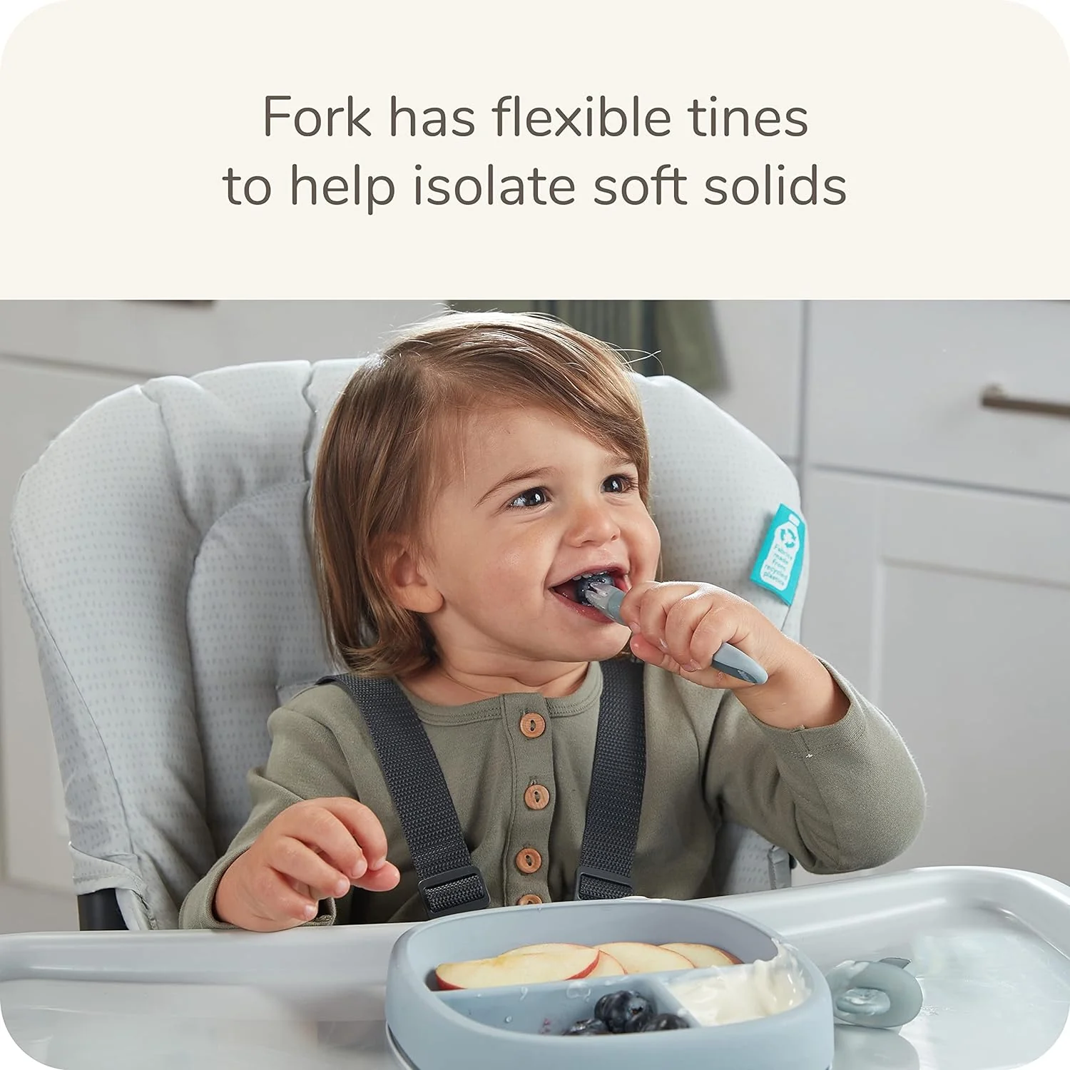 • The dipper fork has flexible outer tines and sturdy inner tines to help baby easily pick up and hold soft foods like fruits and veggies