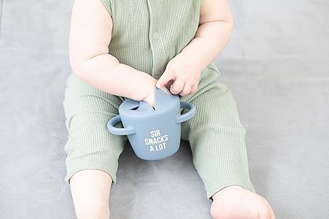 He is the royal snacker! The Happy Snacker is a first-of-its-kind two-piece silicone snack cup with a mess-proof snap-tight lid and soft silicone opening so little hands can easily access food and prevent spills. Designed with easy-grip handles, it fits in car seats and stroller cup holders.
