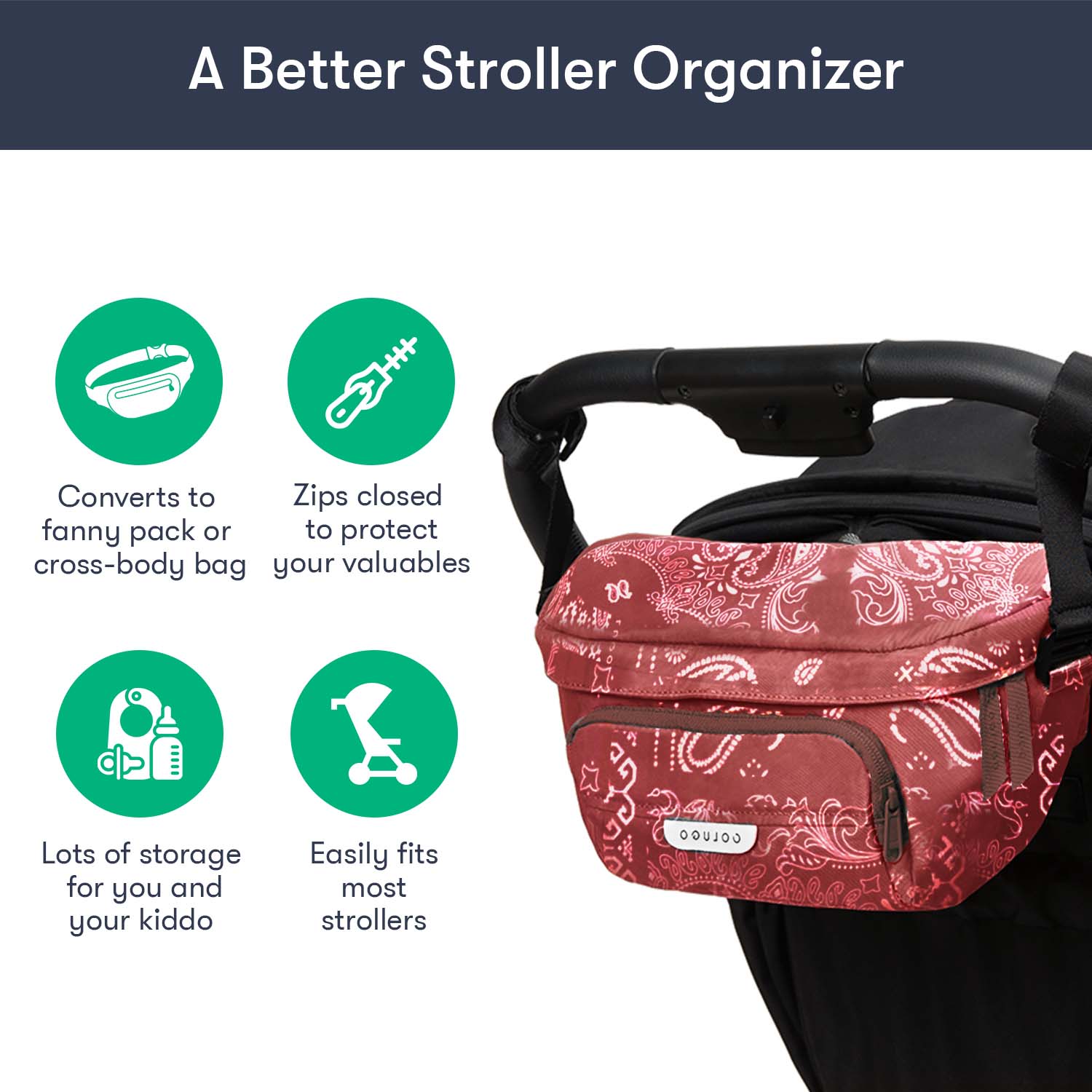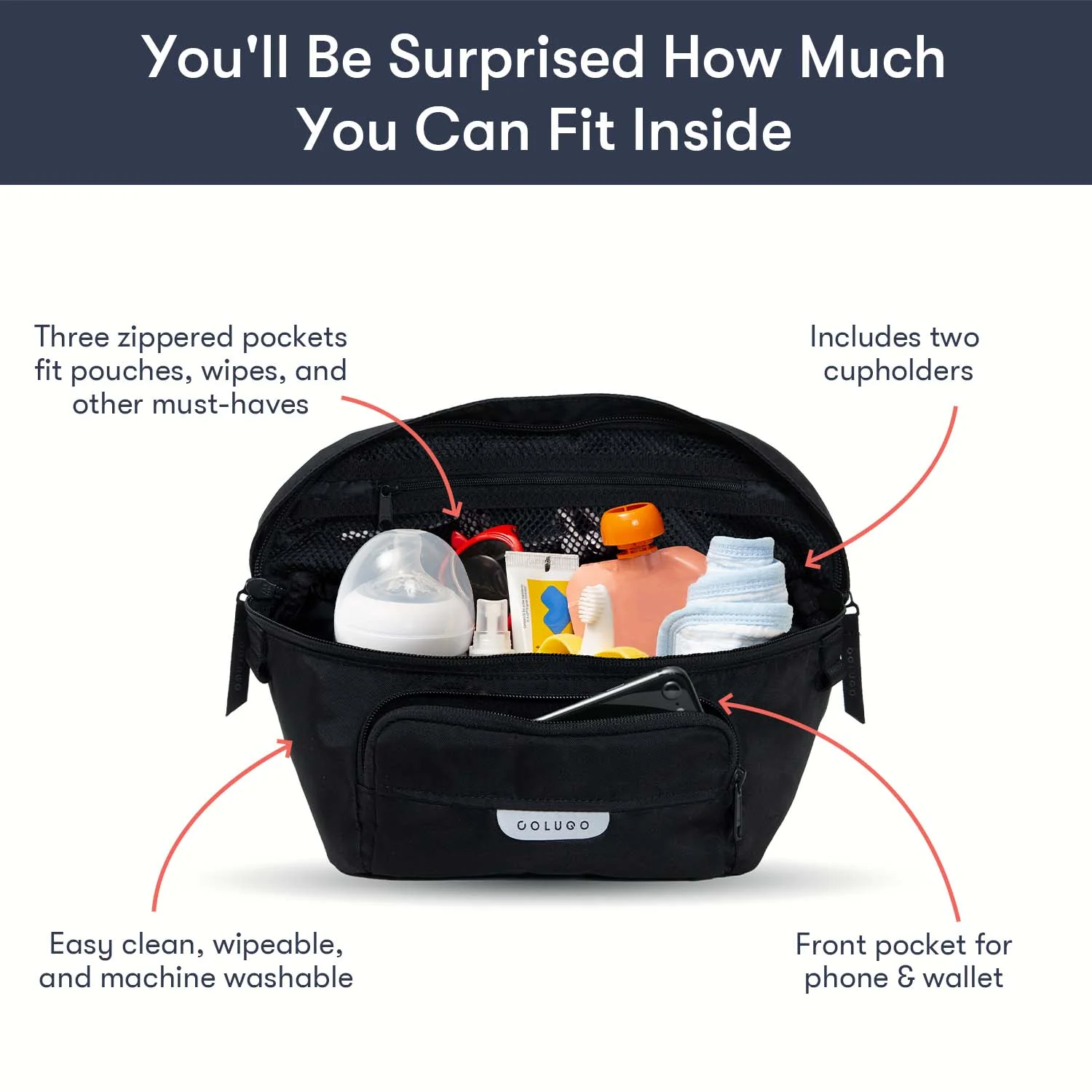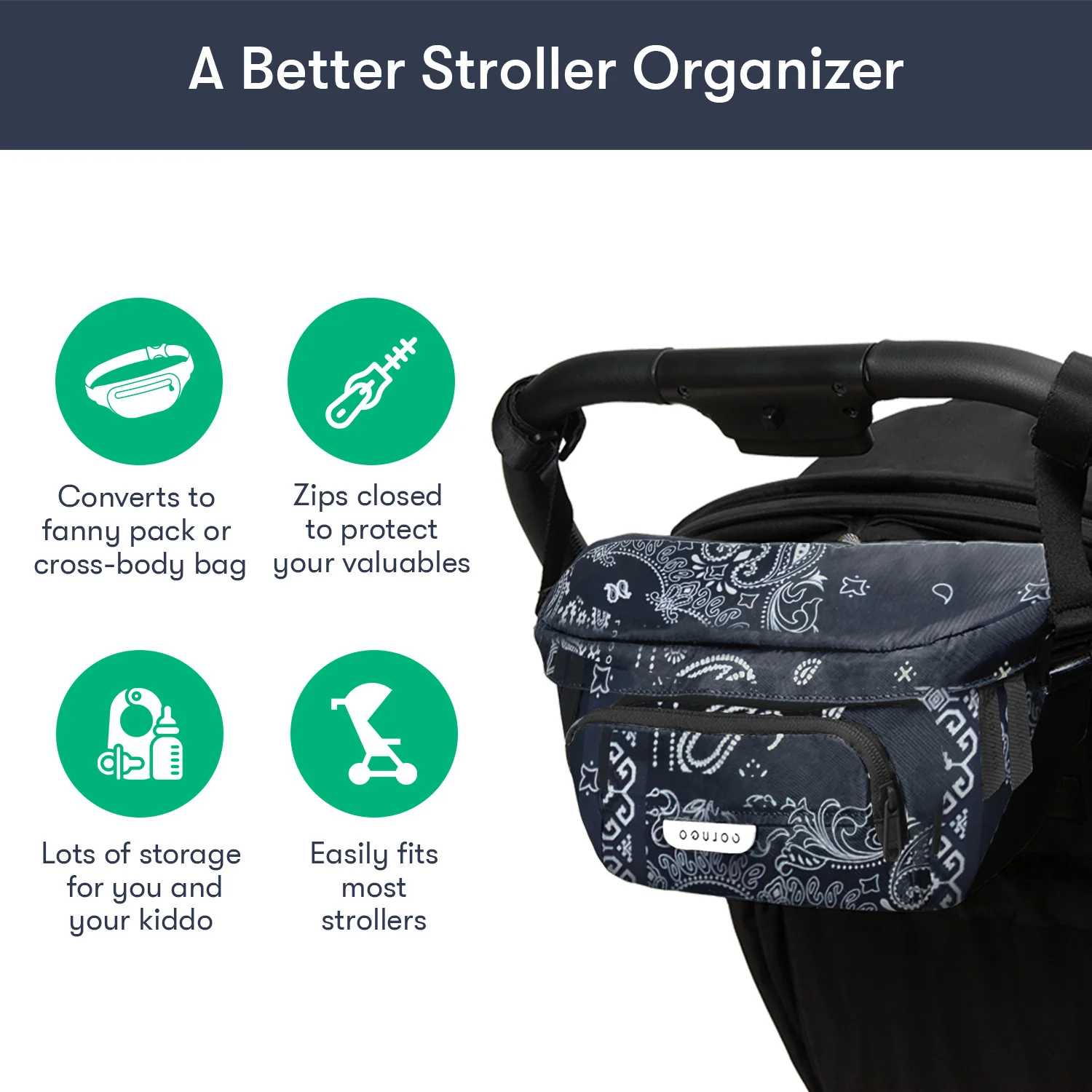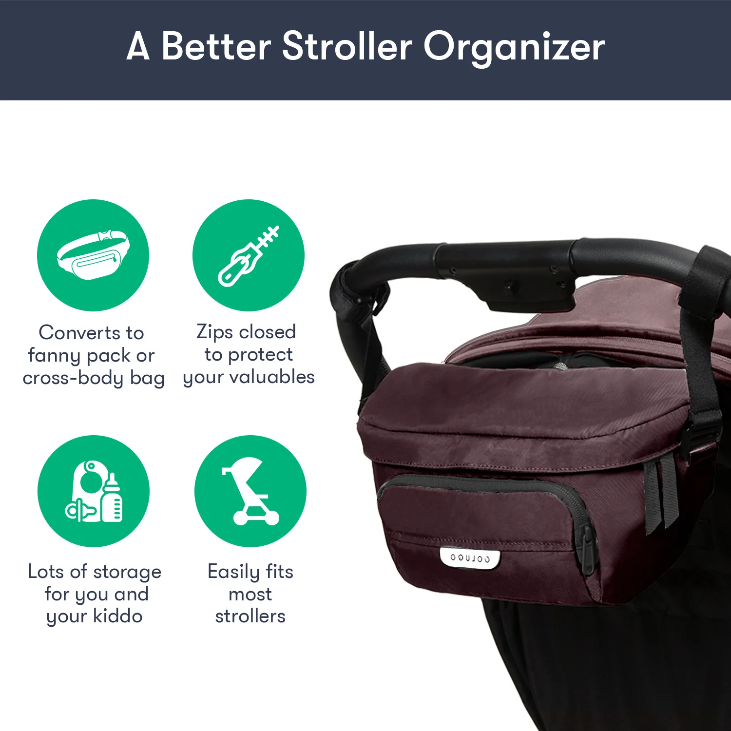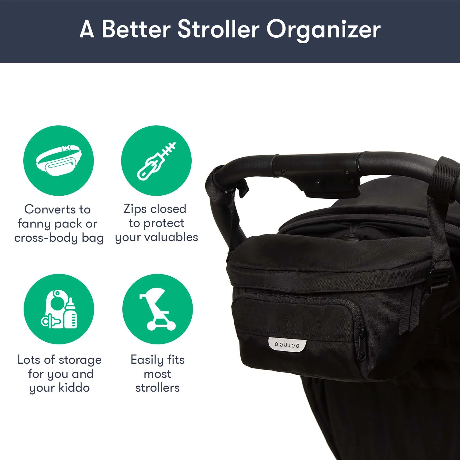 Designed to fit to your Colugo stroller, this organizer has 2 secure attachment points, 2 cup holders and 3 zippered pockets. It can fit pouches, wipes, pacifiers — the things you need in an instant while you're on the go. It also converts into a fanny pack or crossbody bag for those moments you want to take your valuables with you. You’ll be surprised how much you can fit in this bag.