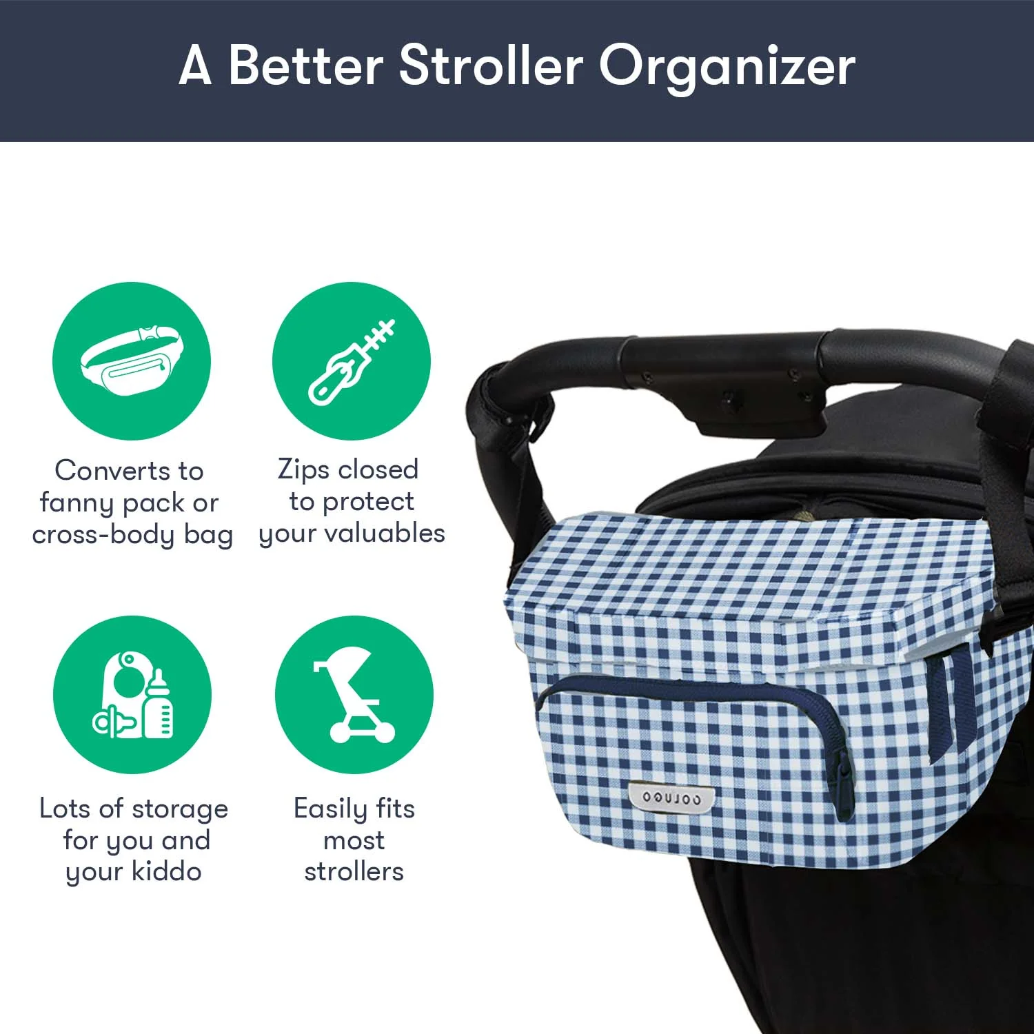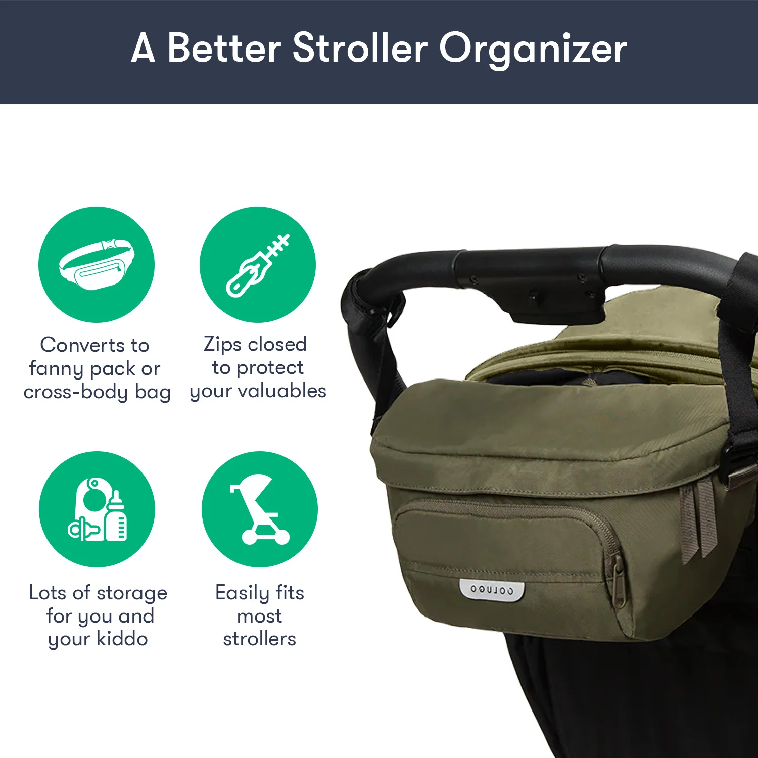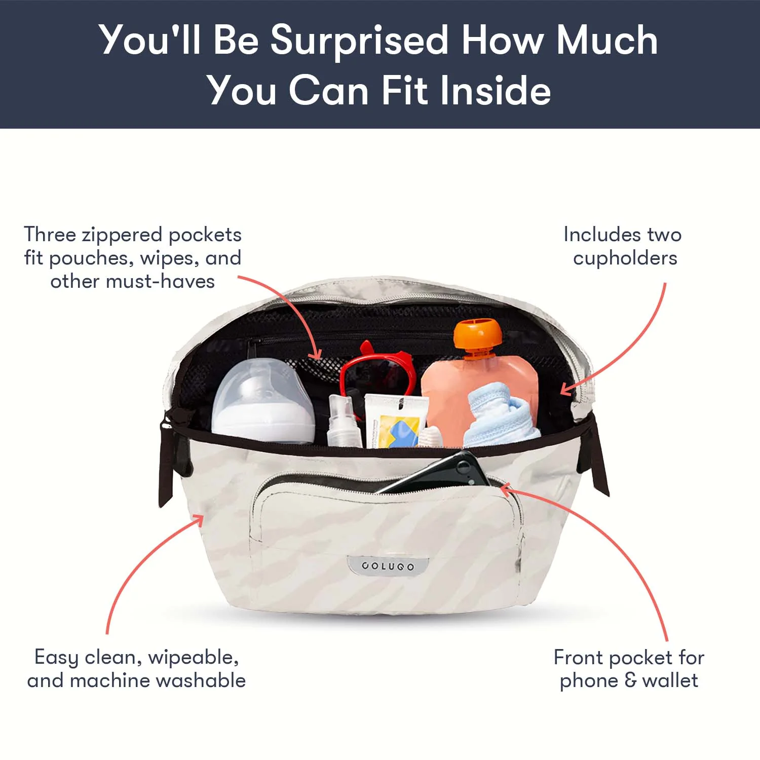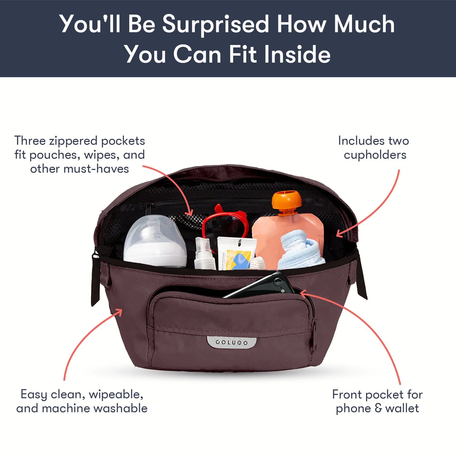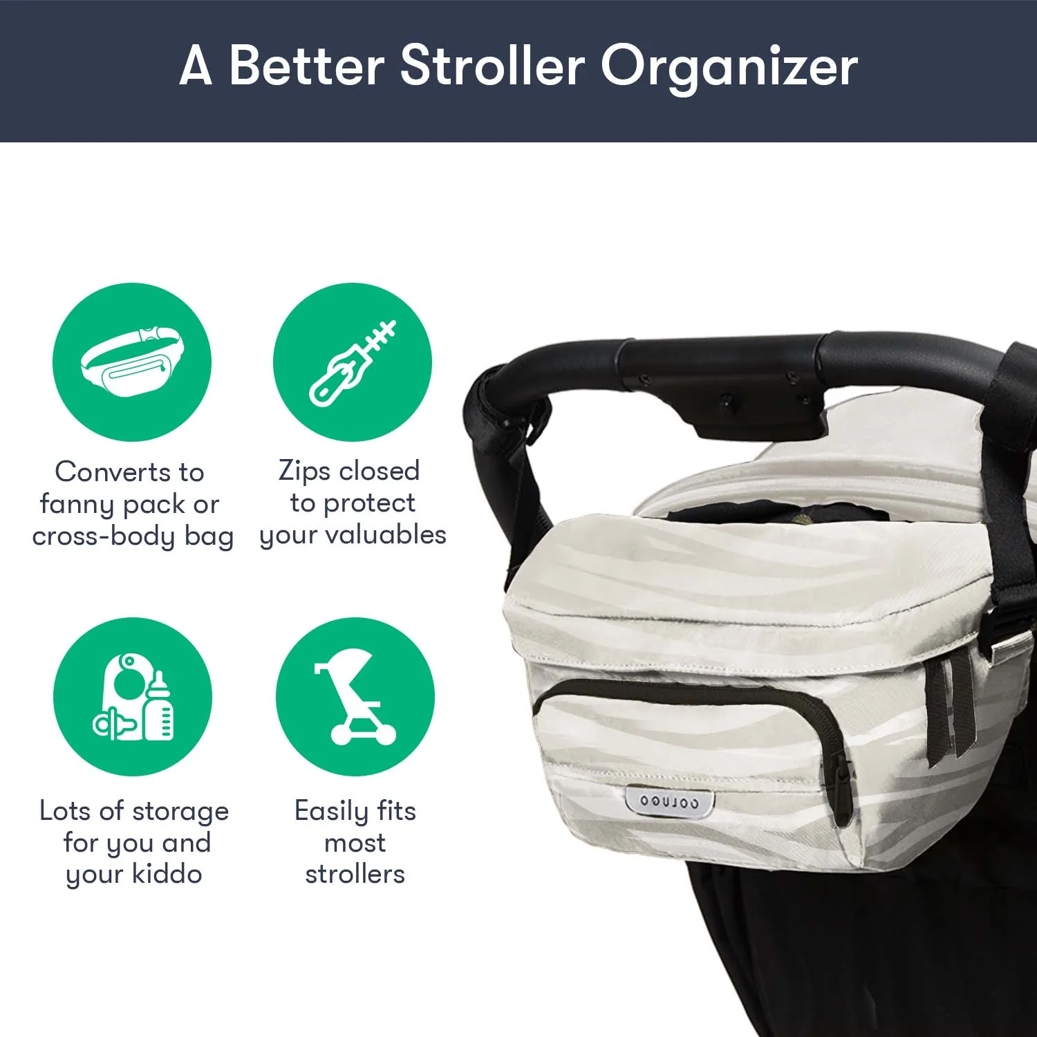 Designed to fit to your Colugo stroller, this organizer has 2 secure attachment points, 2 cup holders and 3 zippered pockets. It can fit pouches, wipes, pacifiers — the things you need in an instant while you're on the go. It also converts into a fanny pack or crossbody bag for those moments you want to take your valuables with you. You’ll be surprised how much you can fit in this bag.
