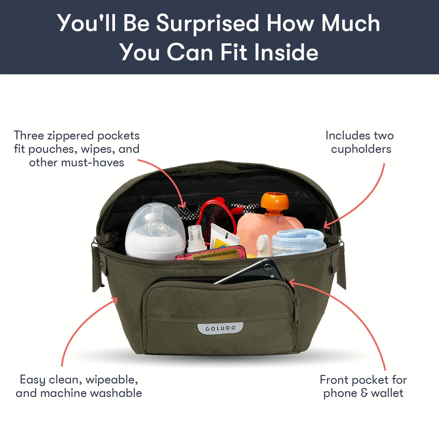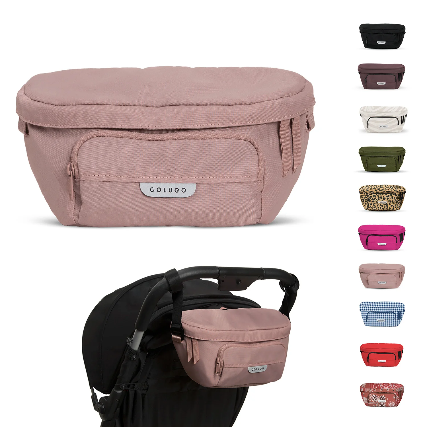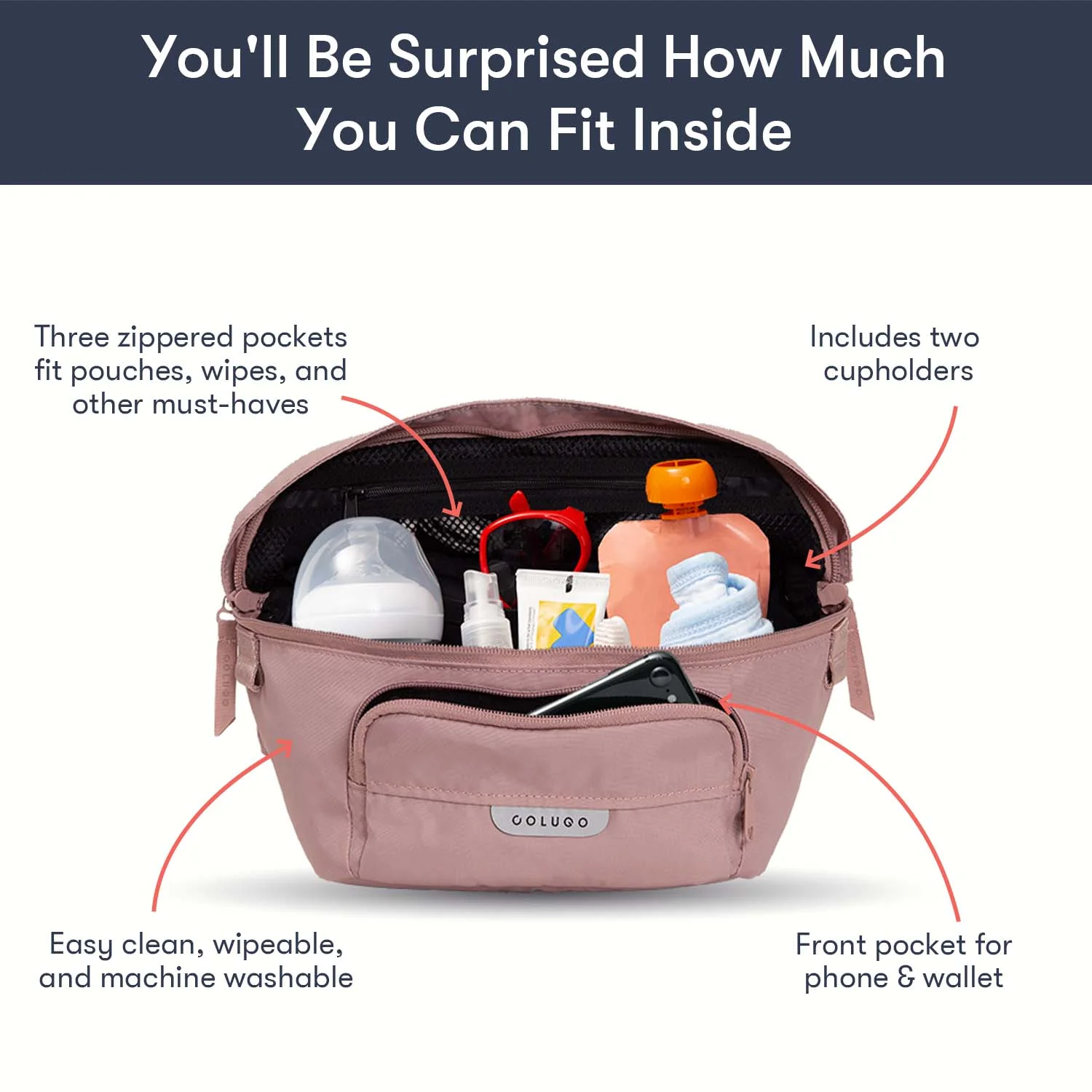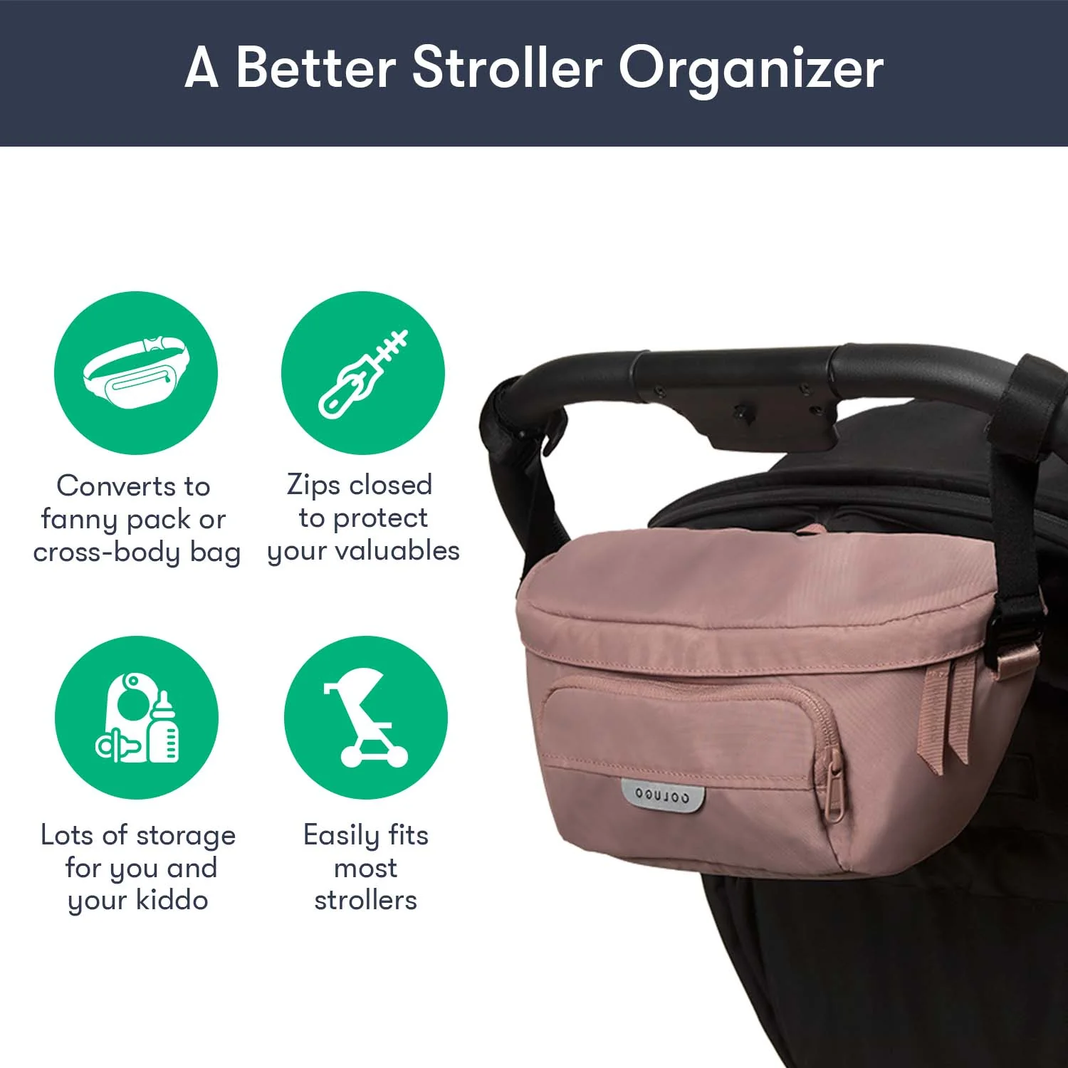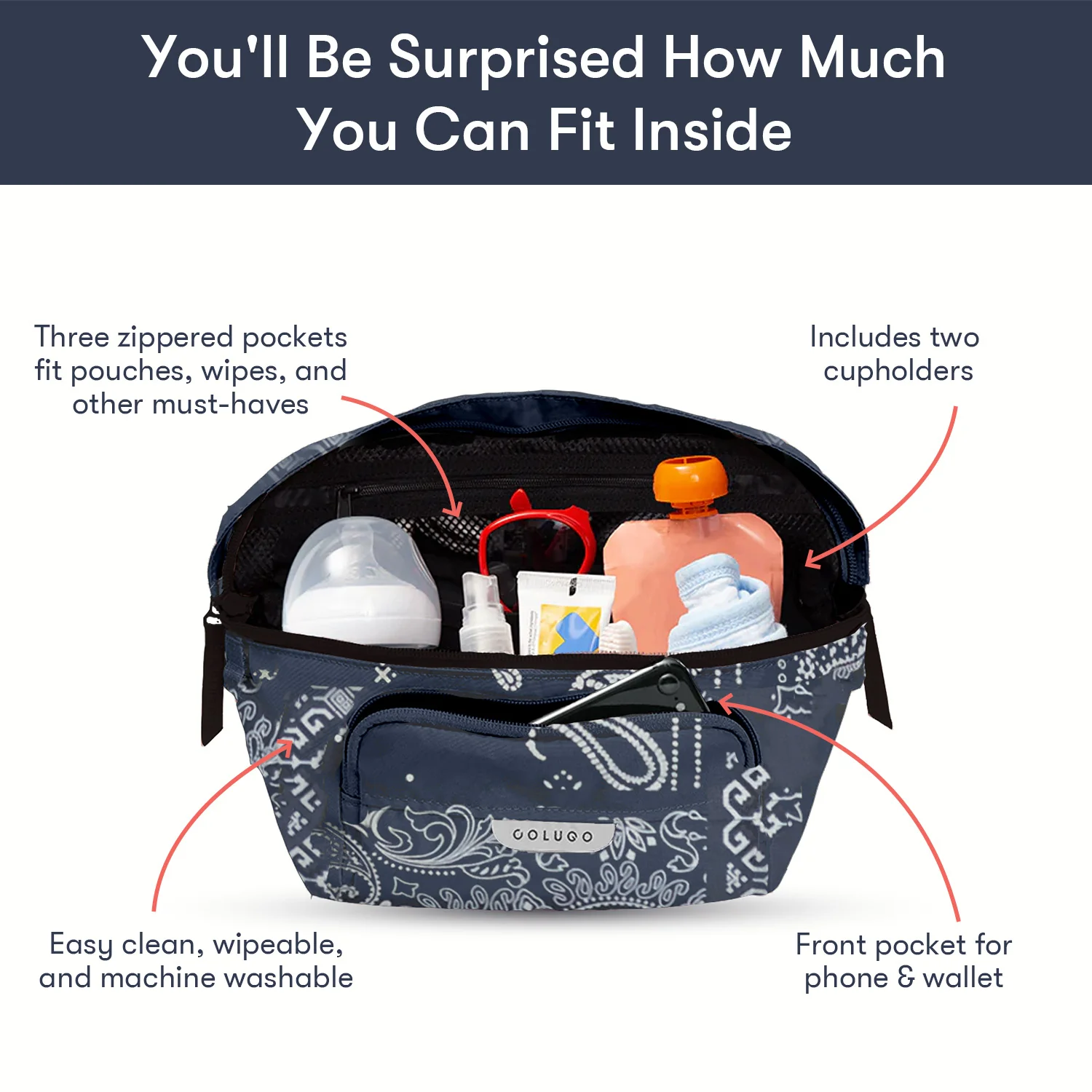 Designed to fit to your Colugo stroller, this organizer has 2 secure attachment points, 2 cup holders and 3 zippered pockets. It can fit pouches, wipes, pacifiers — the things you need in an instant while you're on the go. It also converts into a fanny pack or crossbody bag for those moments you want to take your valuables with you. You’ll be surprised how much you can fit in this bag.