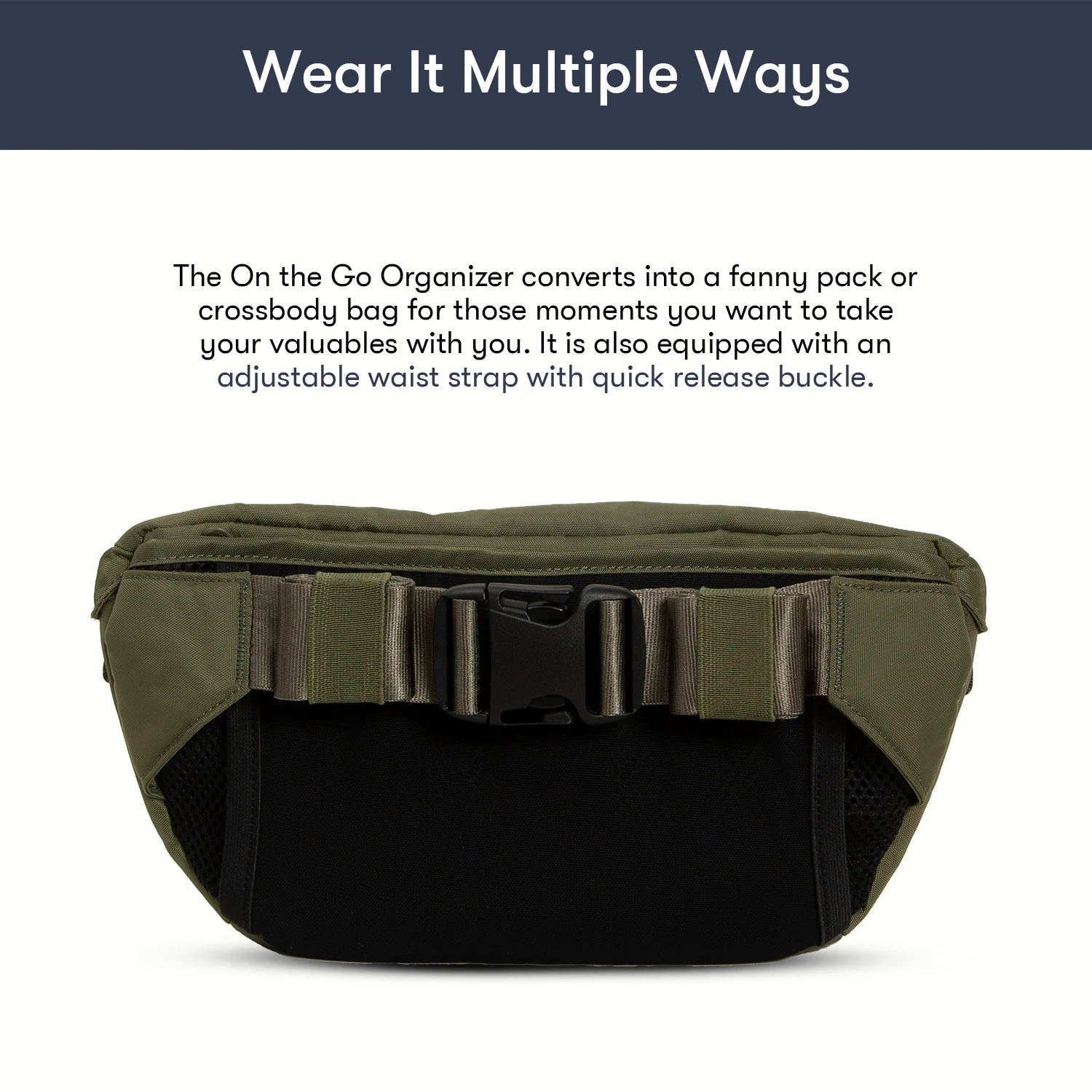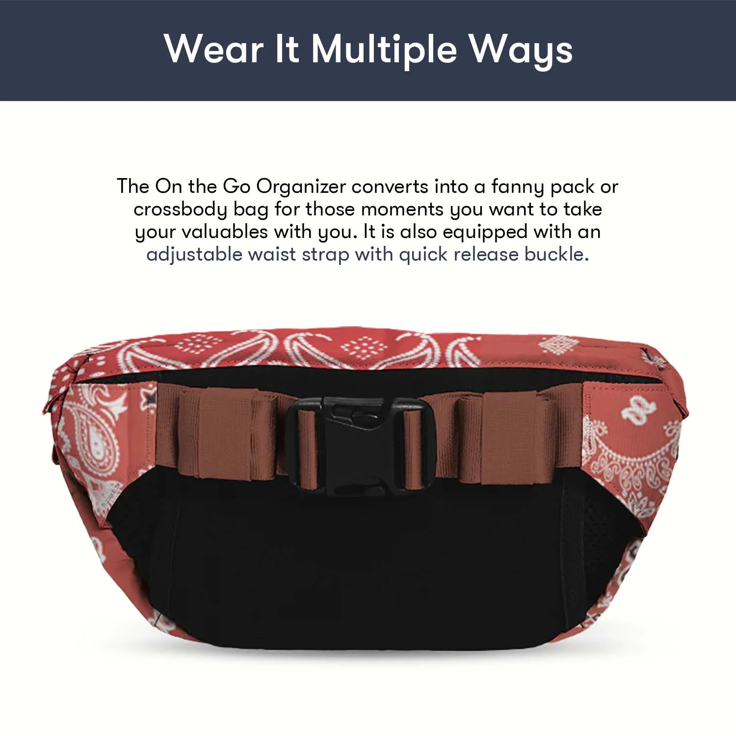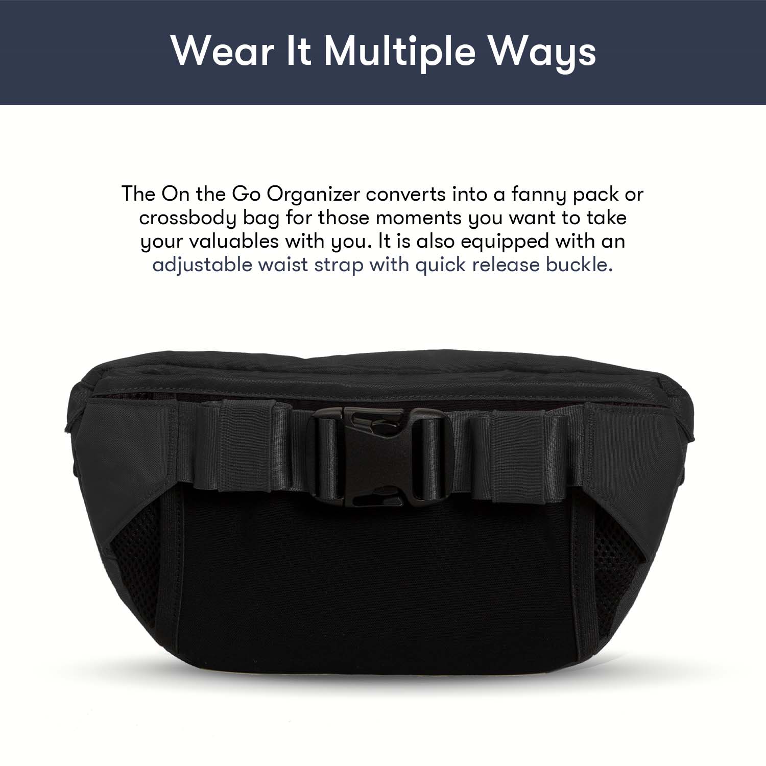 - Converts into a fanny pack or crossbody bag