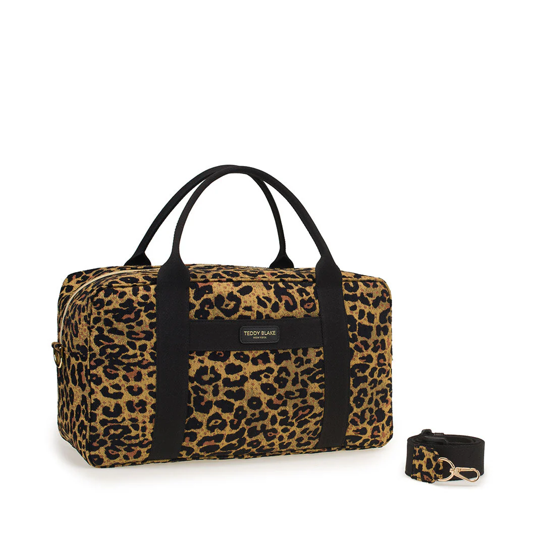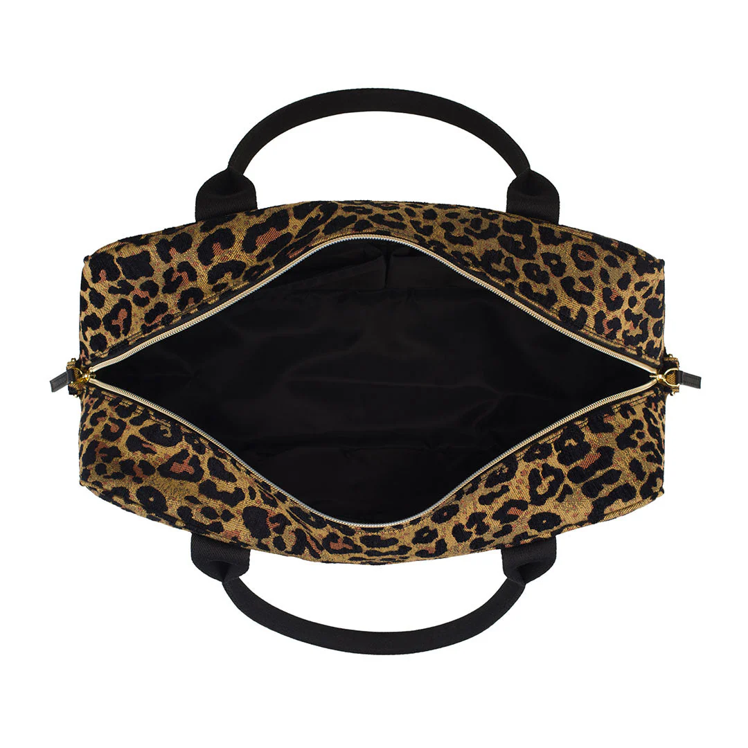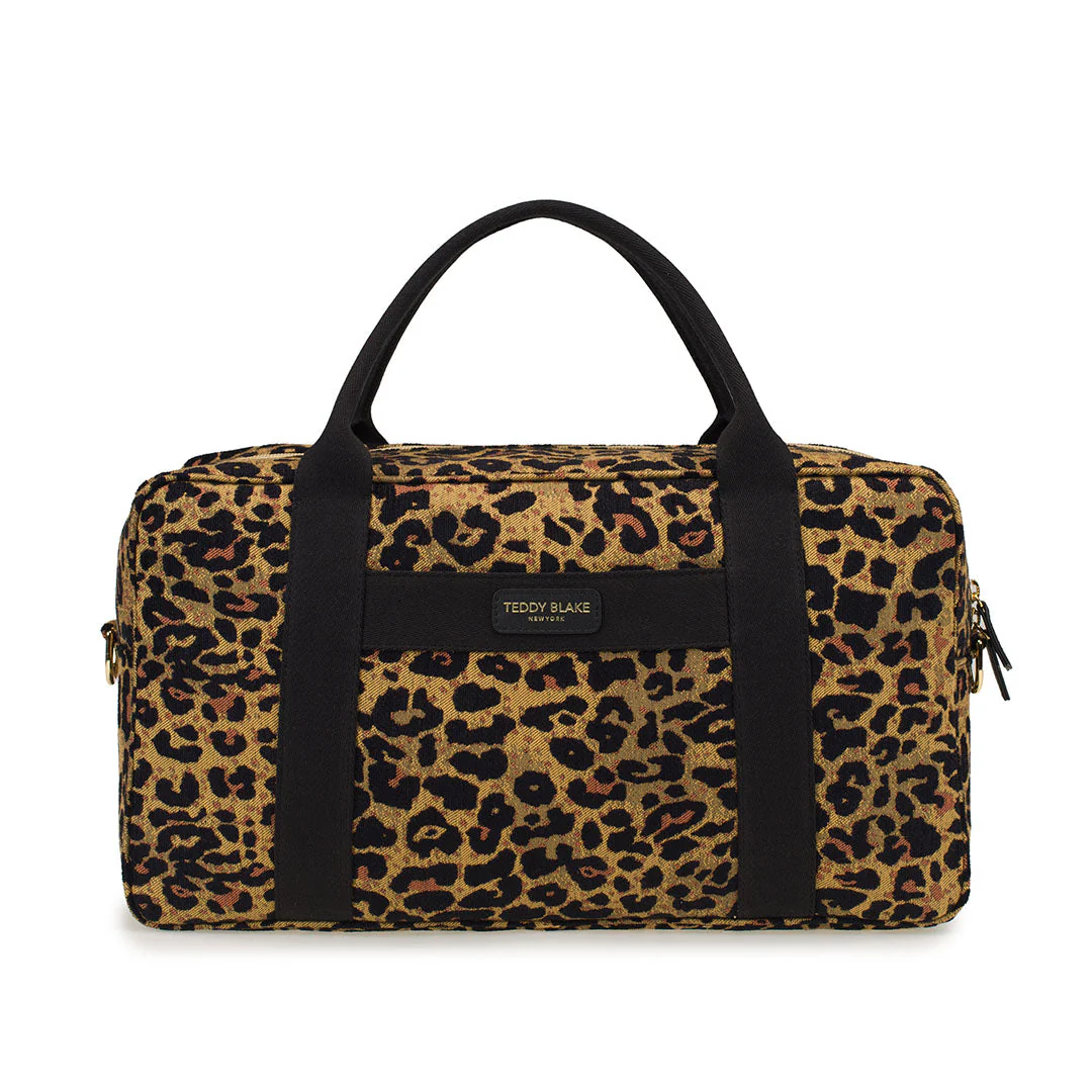 Designed with a woman’s needs in mind, the Ivy duffel bag changes to fit the day's needs! Crafted in Italy from  a jacquard fabric with a leopard print look. This versatile tote is your one-bag solution with a slide pocket on each exterior side and a well-organized interior to hold everything you need. Carry it as is, or use the wide strap and switch to a shoulder bag.