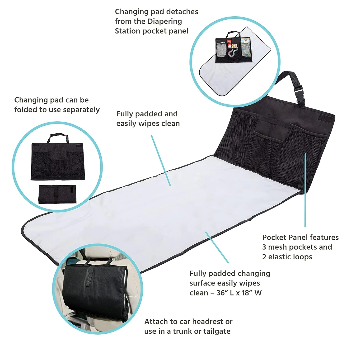 - An adjustable buckle strap makes it easy to attach the Diapering Station to car headrests.
