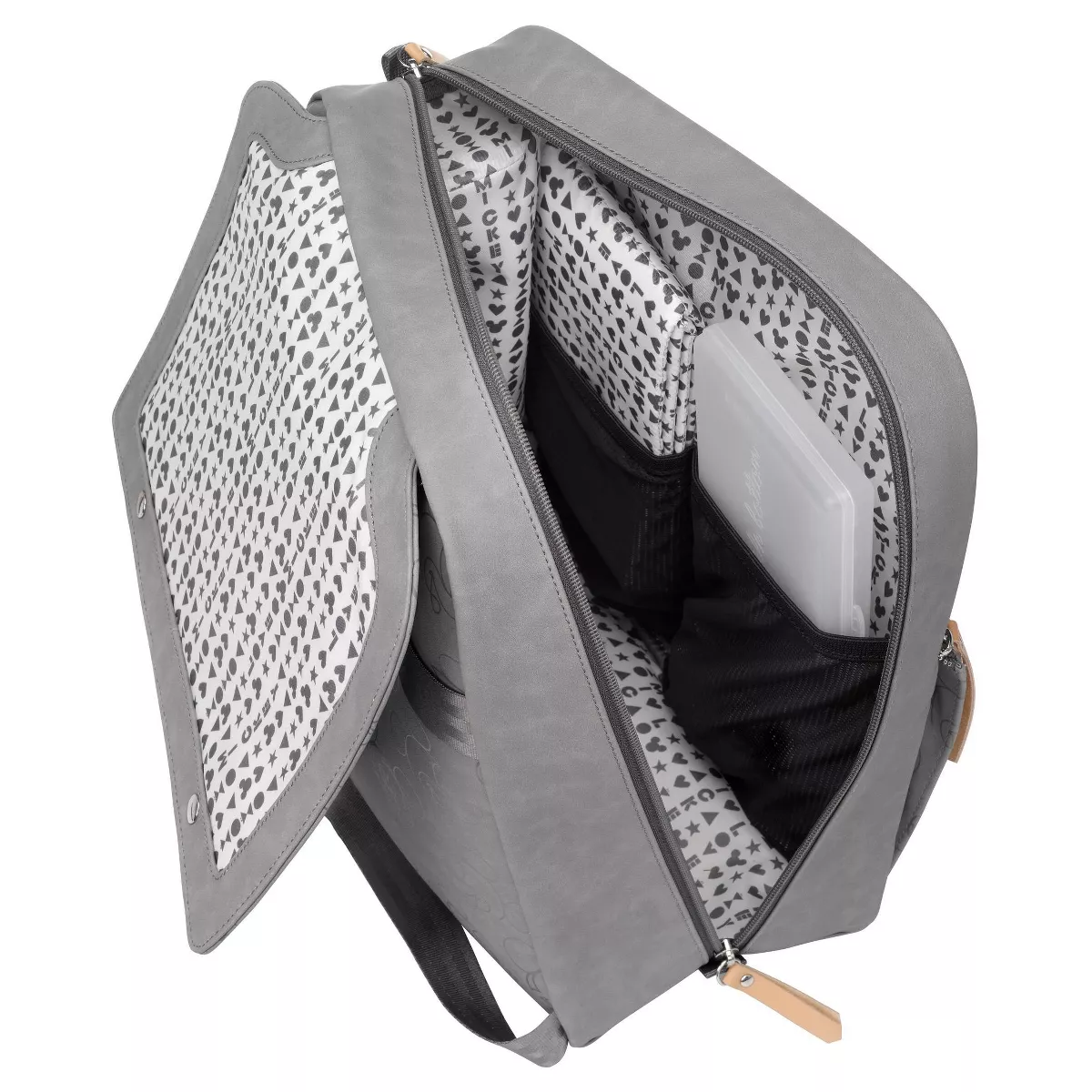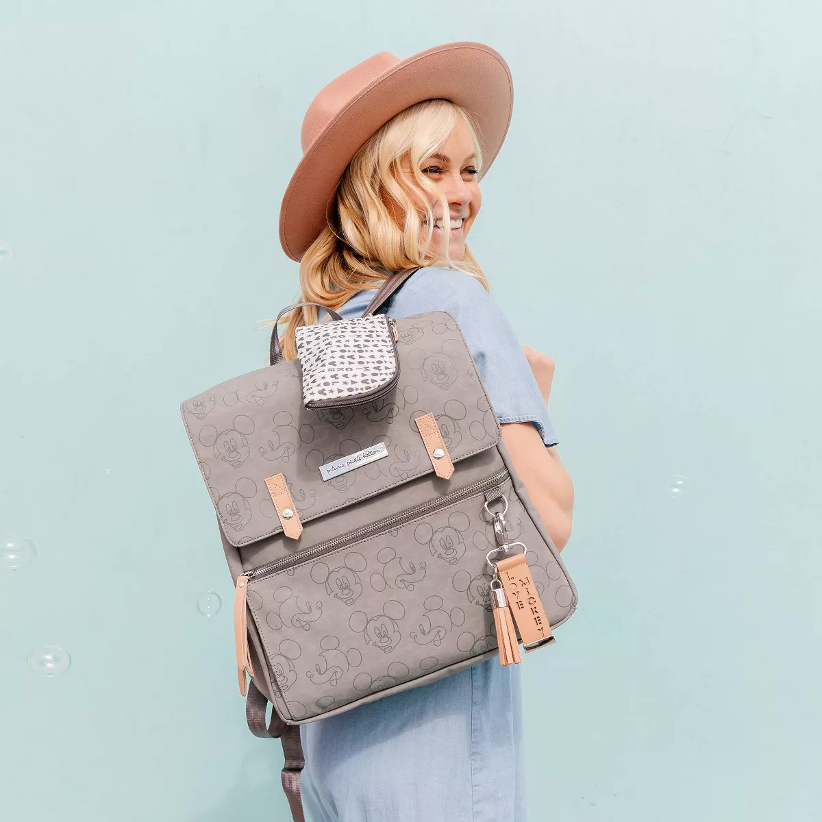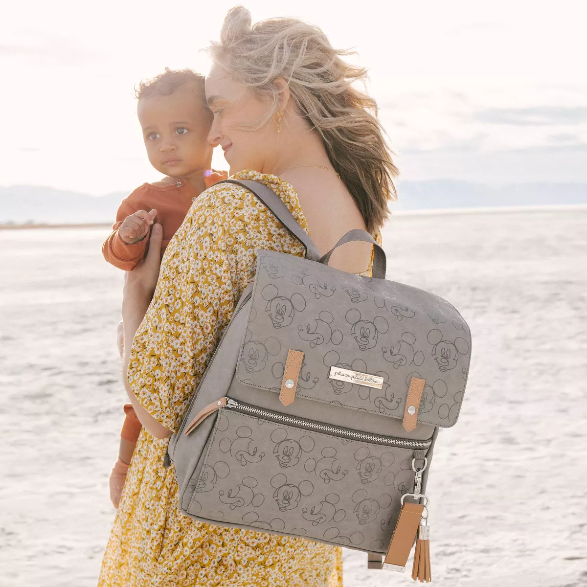 The Love Mickey Meta Backpack Diaper Bag by Petunia Pickle Bottom combines fashion and function. This versatile bag features a trendy Mickey Mouse-themed print plus spacious interior, mesh, and insulated pockets for baby's on-the-go essentials. ul sleek and trendy Love Mickey print in grey.