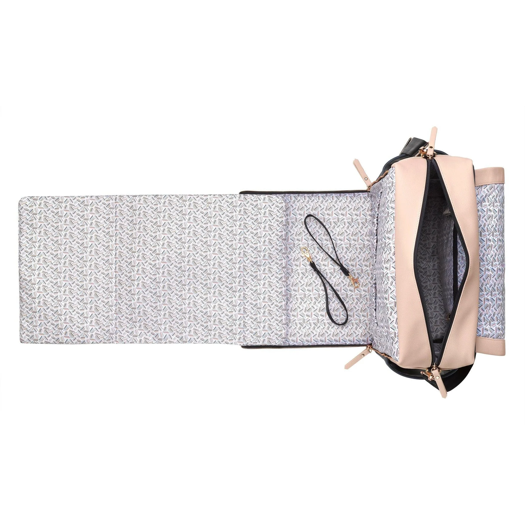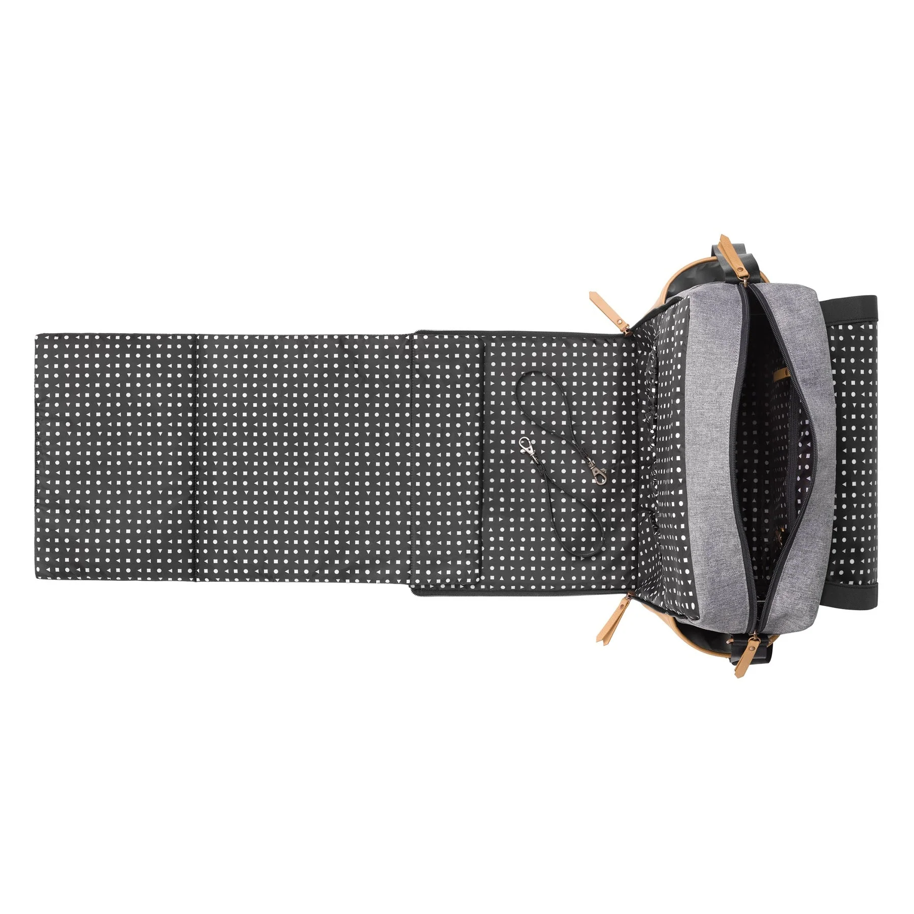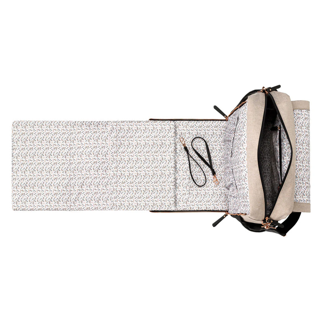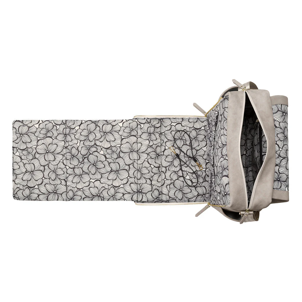 - Zip-out diaper changing station for baby with removable changing pad and pockets for diapers and wipes.