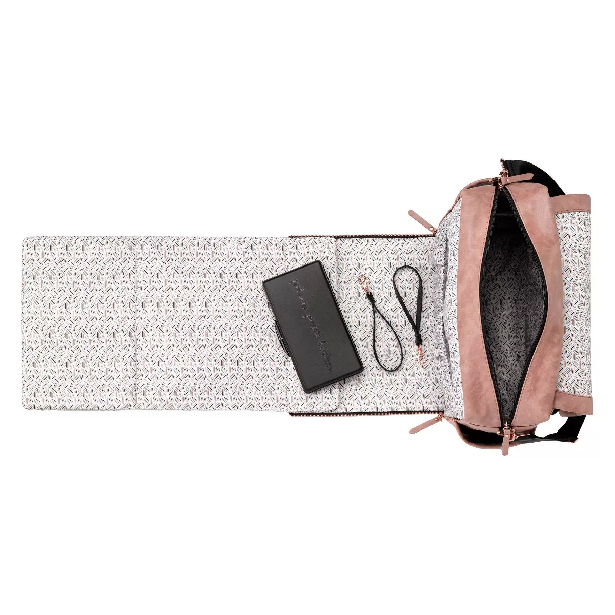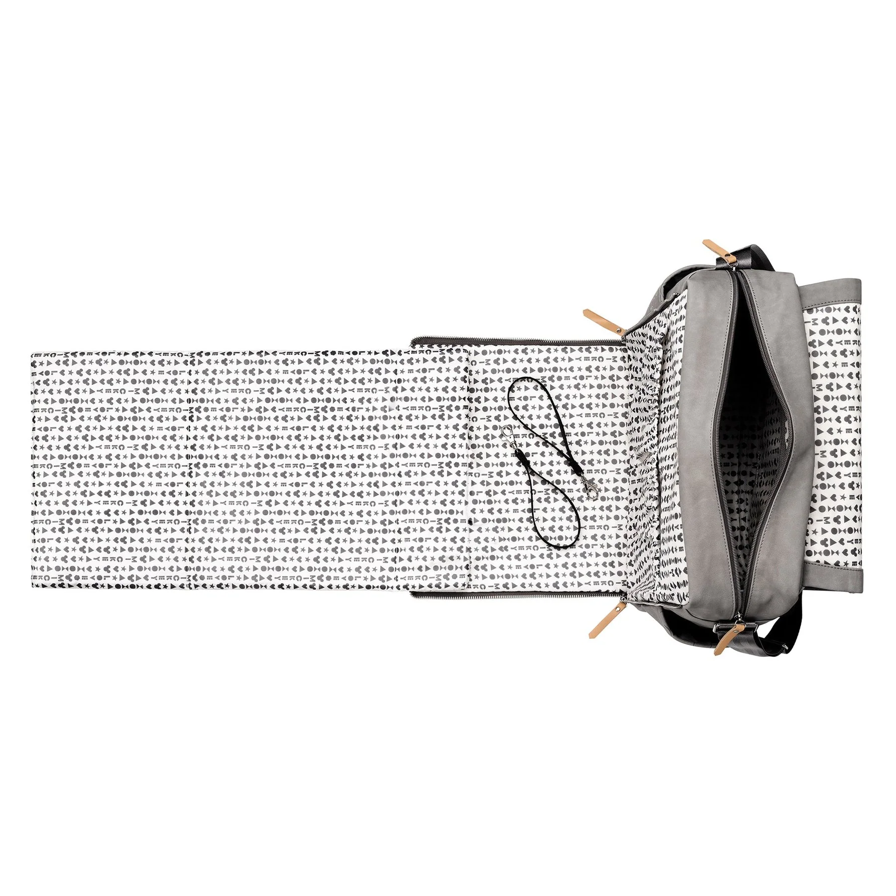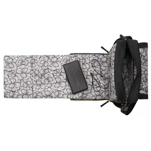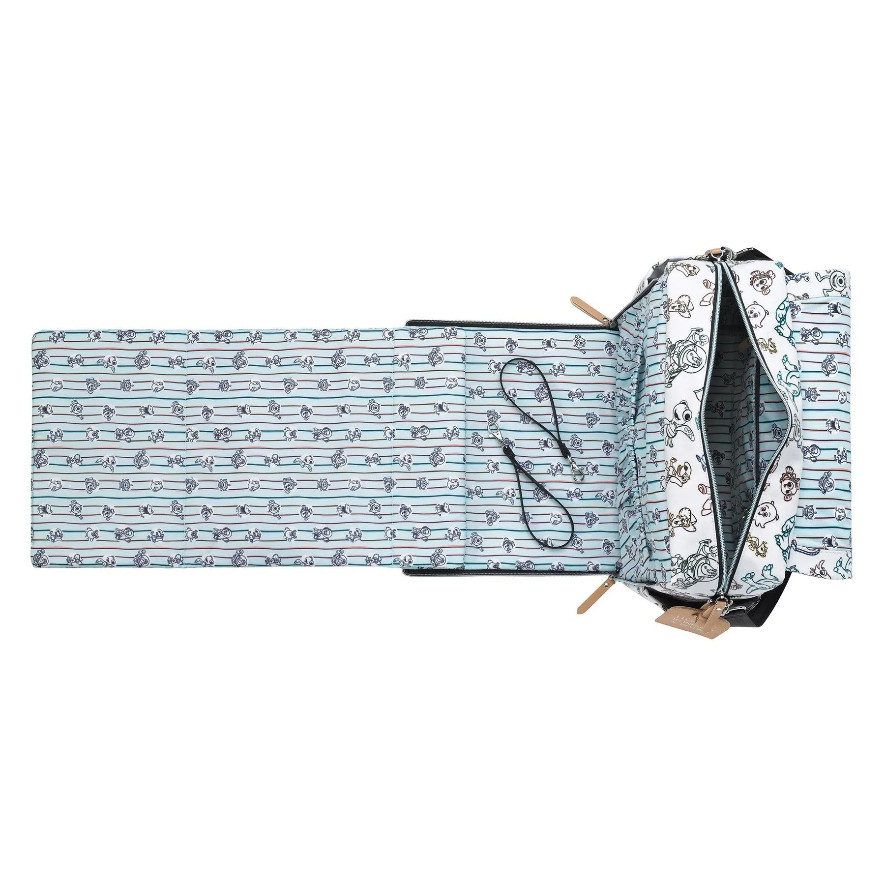 - Zip-out diaper changing station for baby with removable changing pad and pockets for diapers and wipes.