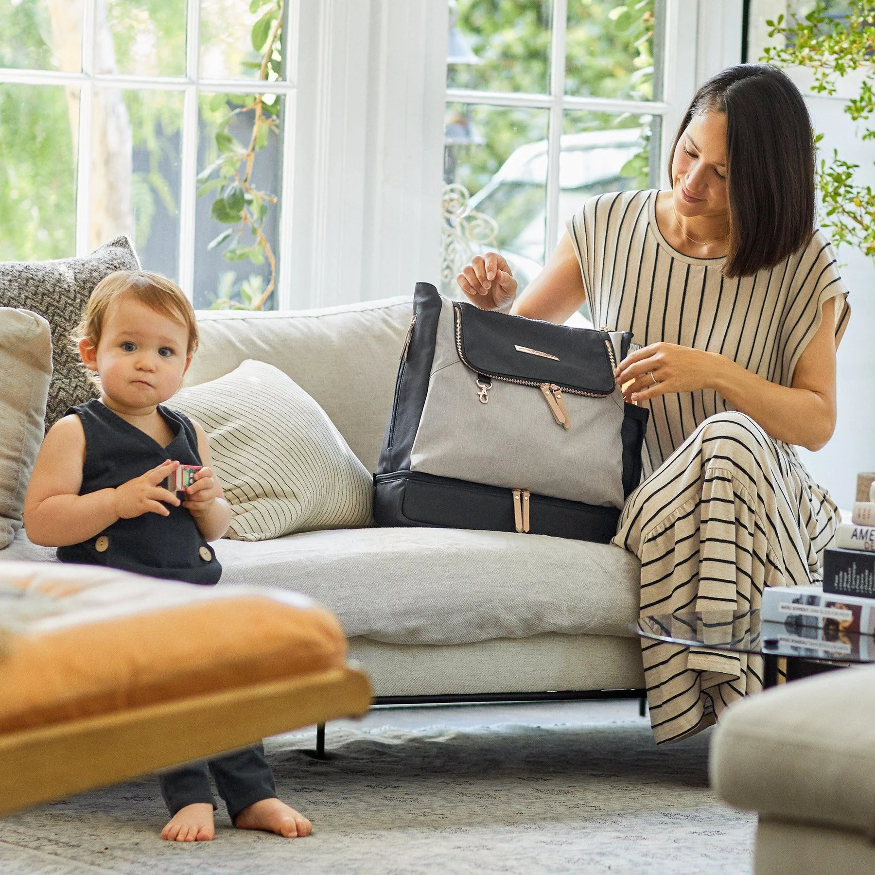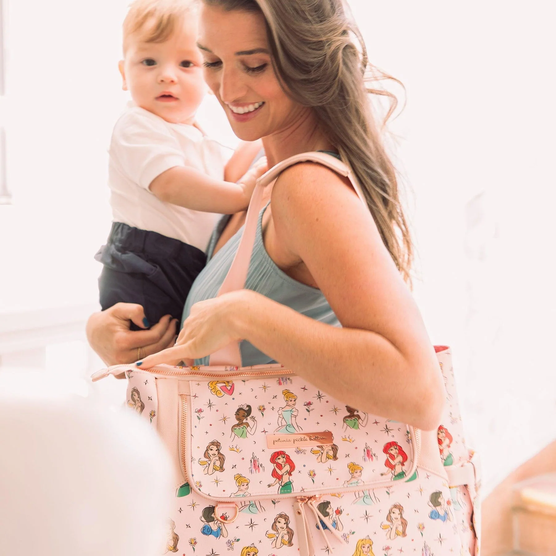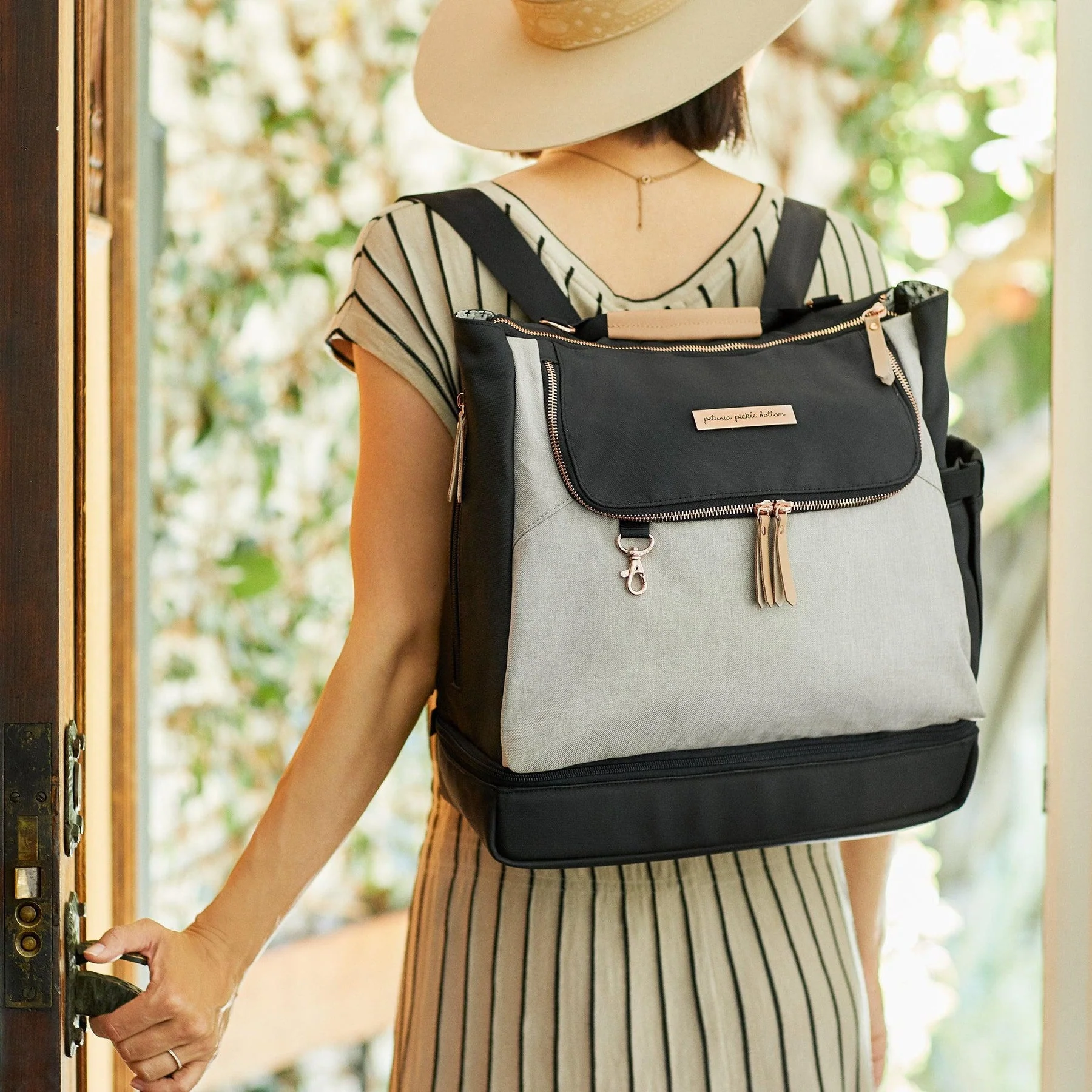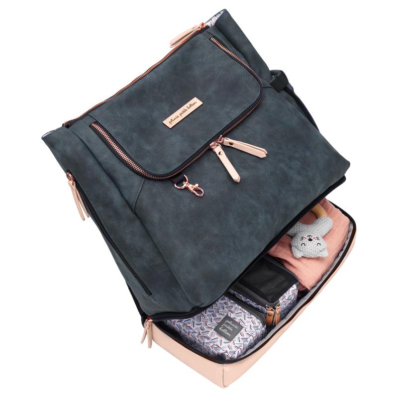 Combine style and function with the compact Petunia Pickle Bottom Pivot Diaper Backpack. With a two-tone design, this durable bag features separated top and bottom compartments, a spacious top section, and numerous zippered pockets.