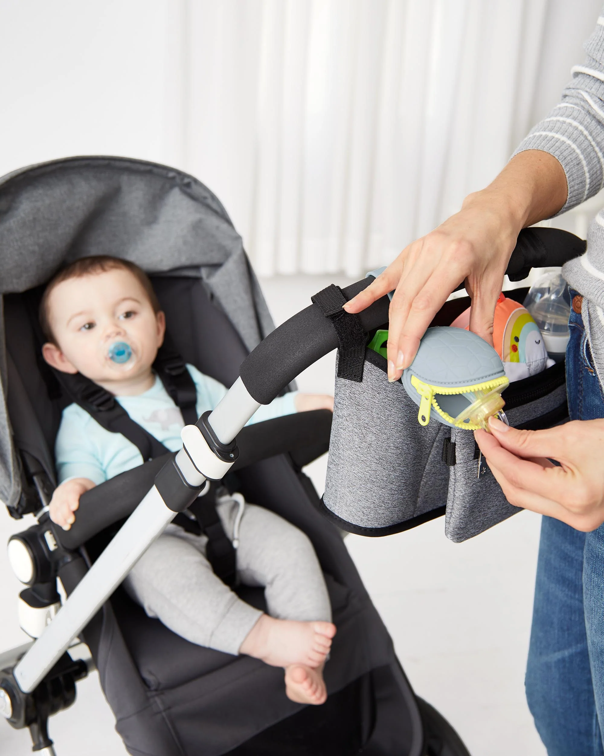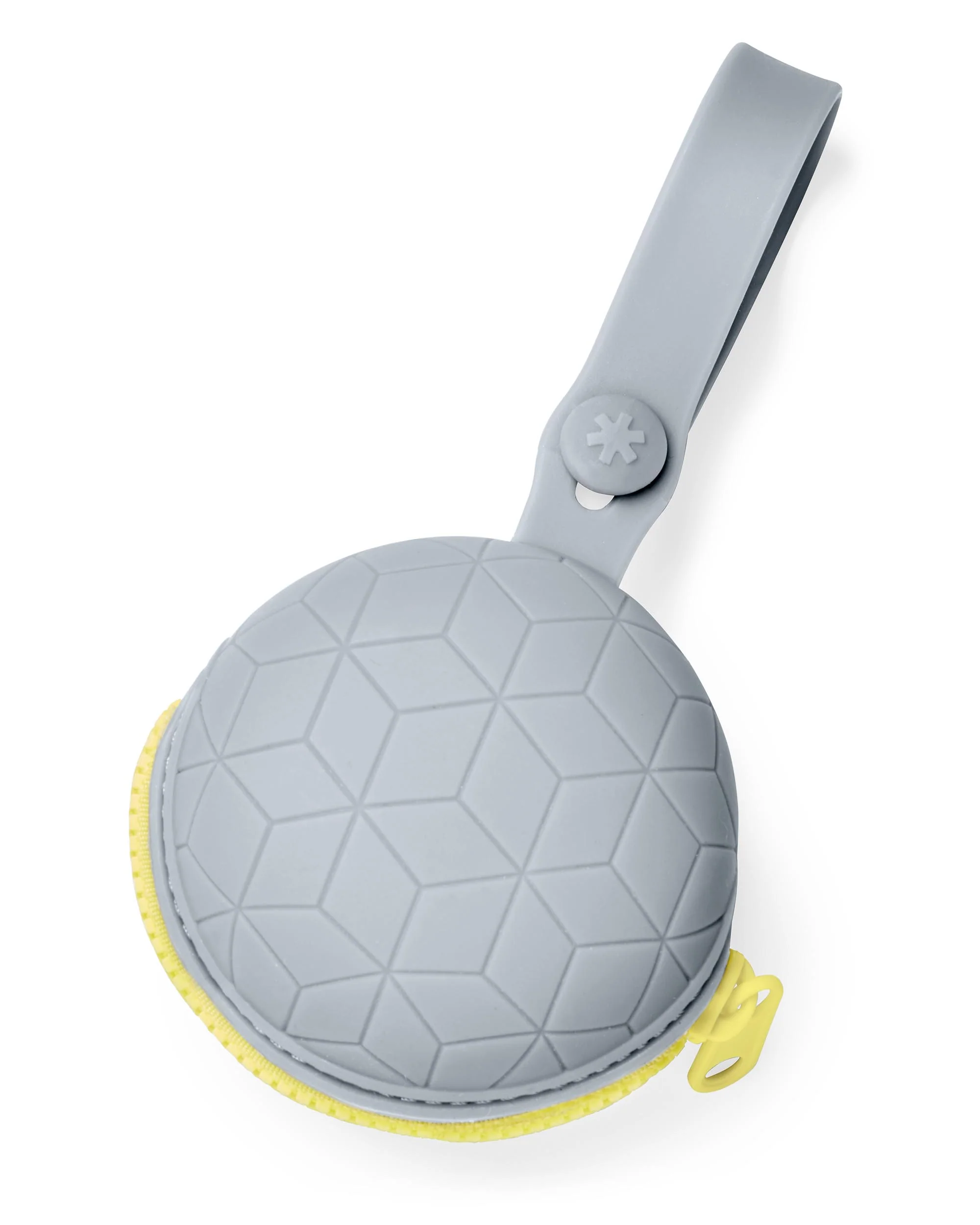 With a secure zip closure and a modern compact shape, our silicone pacifier holder keeps pacis clean and ready to go. Designed to fit up to two pacifiers, the soft silicone material is dishwasher safe so it’s easy to clean. A handy strap attaches to your stroller or diaper bag so baby's pacifier is always within easy reach.
