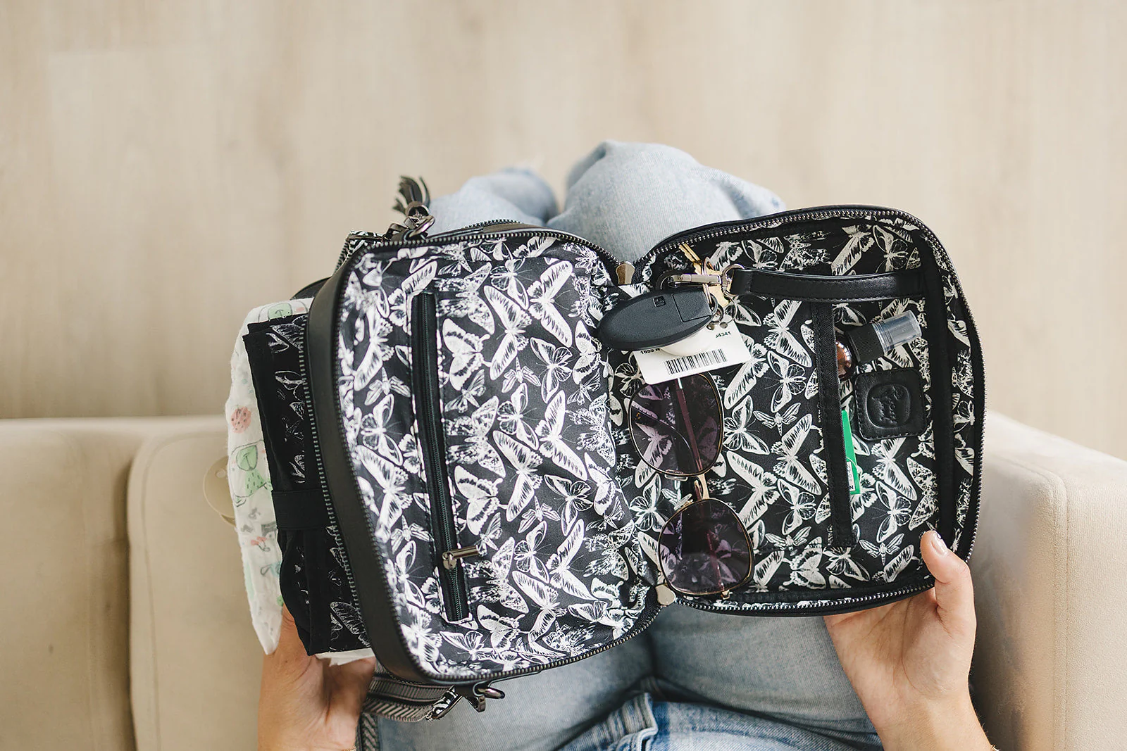 The Poppy is a modern minimalist approach to a timeless silhouette shape, made with moms in mind. Thoughtfully designed with two separate sections: part diaper bag with a compartment for your baby essentials, and part purse with a separate compartment for your essentials. Multiple zippered and open pockets, a key leash and detachable pacifier leash, an elastic pocket with an opening for wipes, and an adjustable and removable shoulder strap.