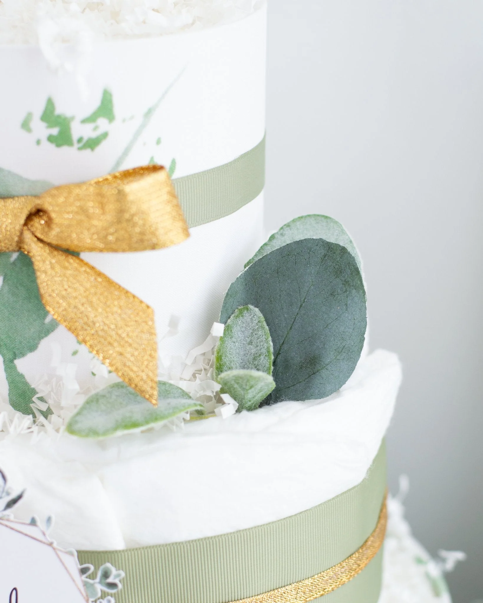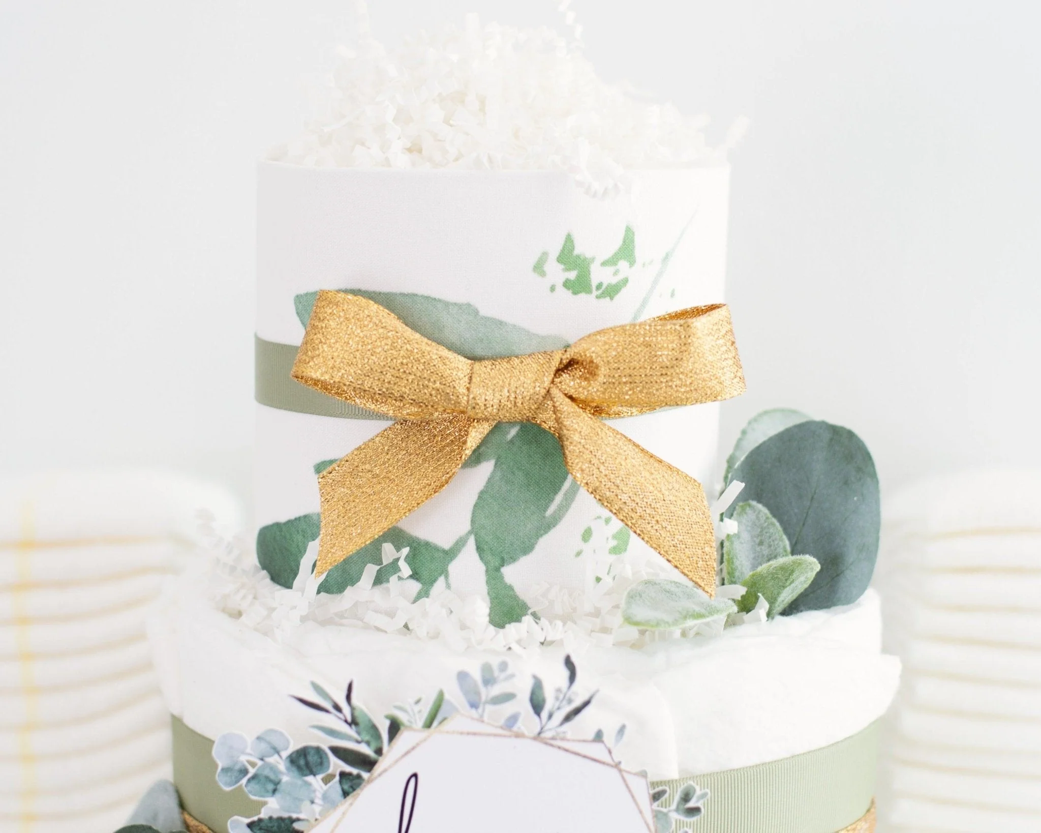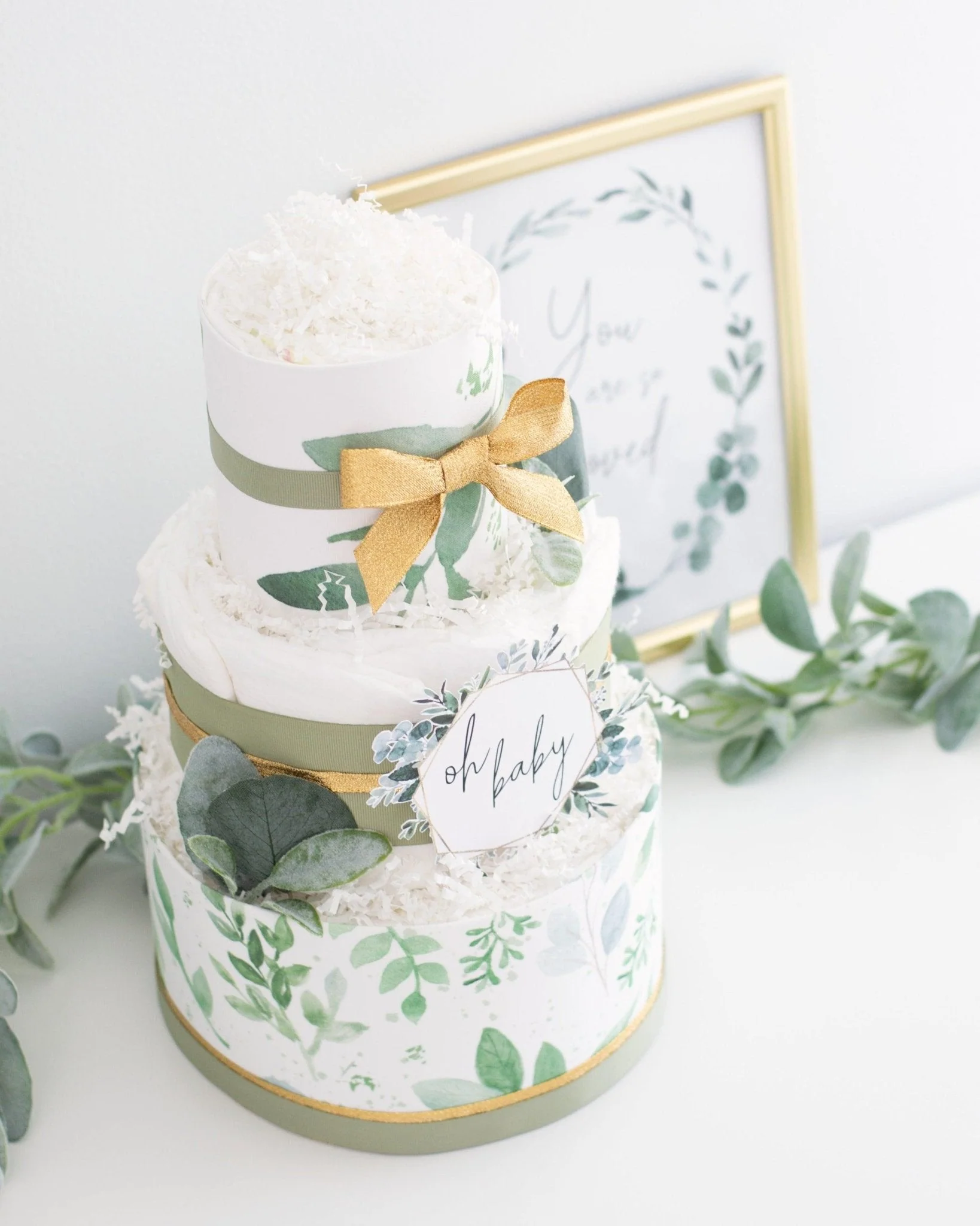 Our greenery diaper cake makes the perfect decoration for a gender-neutral baby shower. The mom-to-be and other shower guests will be swooning over the gorgeous custom printed fabric and details. The mom will also love that this cake is also filled with diapers she can use once her baby arrives!