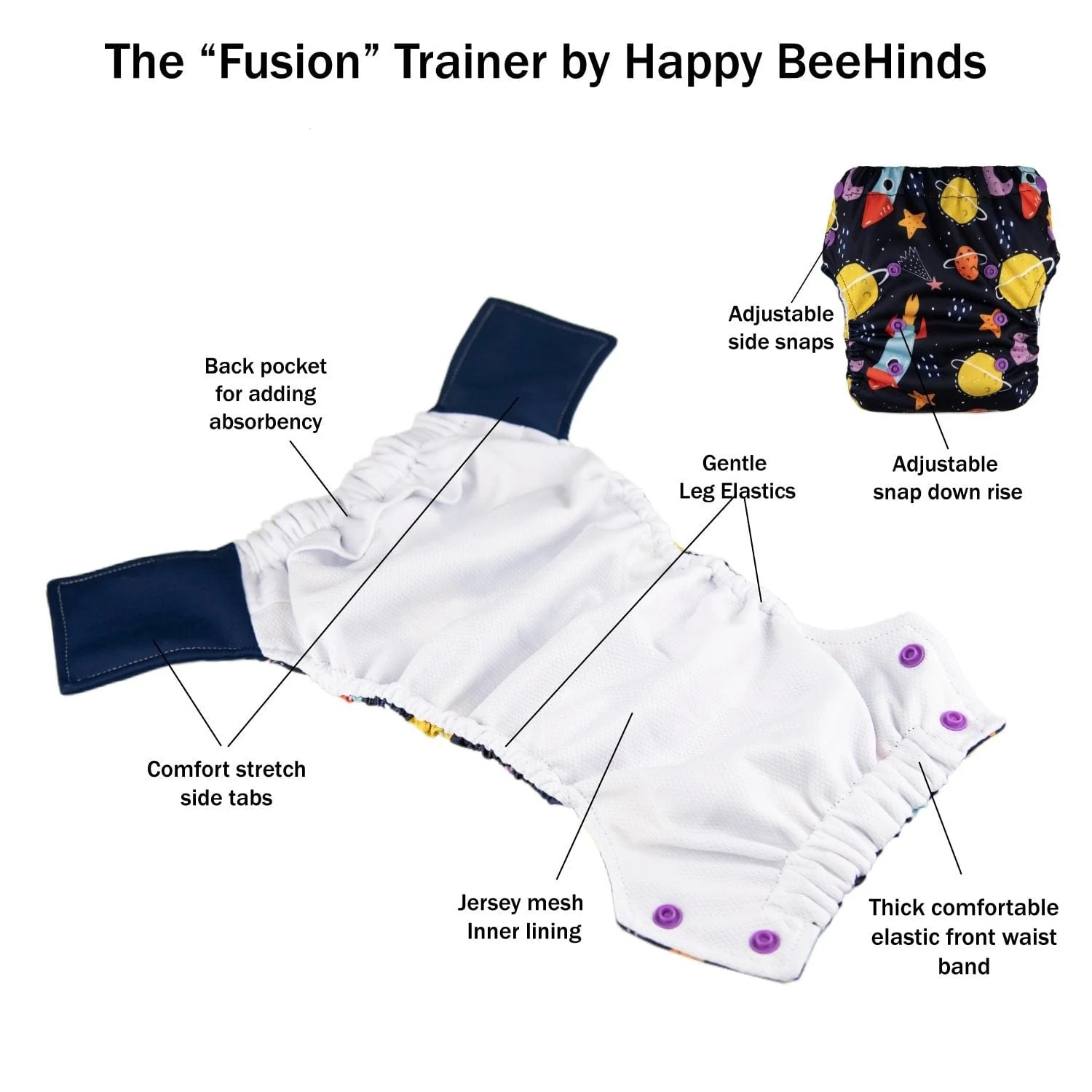 The "Fusion" Trainer will be a hit with mamas and tots alike for its incredible multipurpose "Fusion" design. With stretchy features that make sliding them on and off practically effortless - toddlers will be thrilled! Plus, you can customize it with your favorite absorbency.