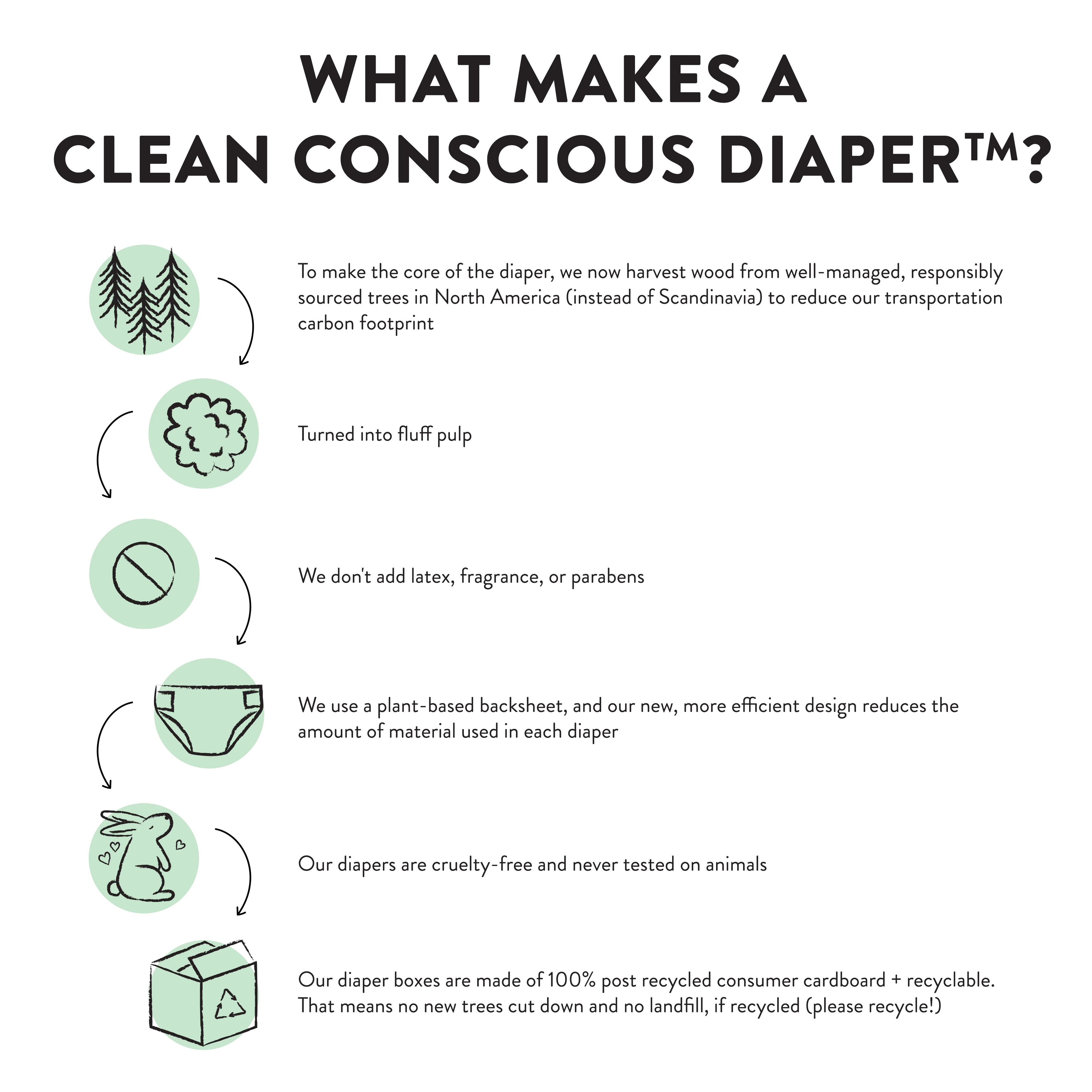 - Clean Conscious Diapers�� are designed with safe plant-based materials*, a wetness indicator (so you know when it��s time for a fresh one), enhanced blowout protection, & advanced absorption for dry, healthy-looking booties. Now OEKO-TEX庐 STANDARD 100 certified!
