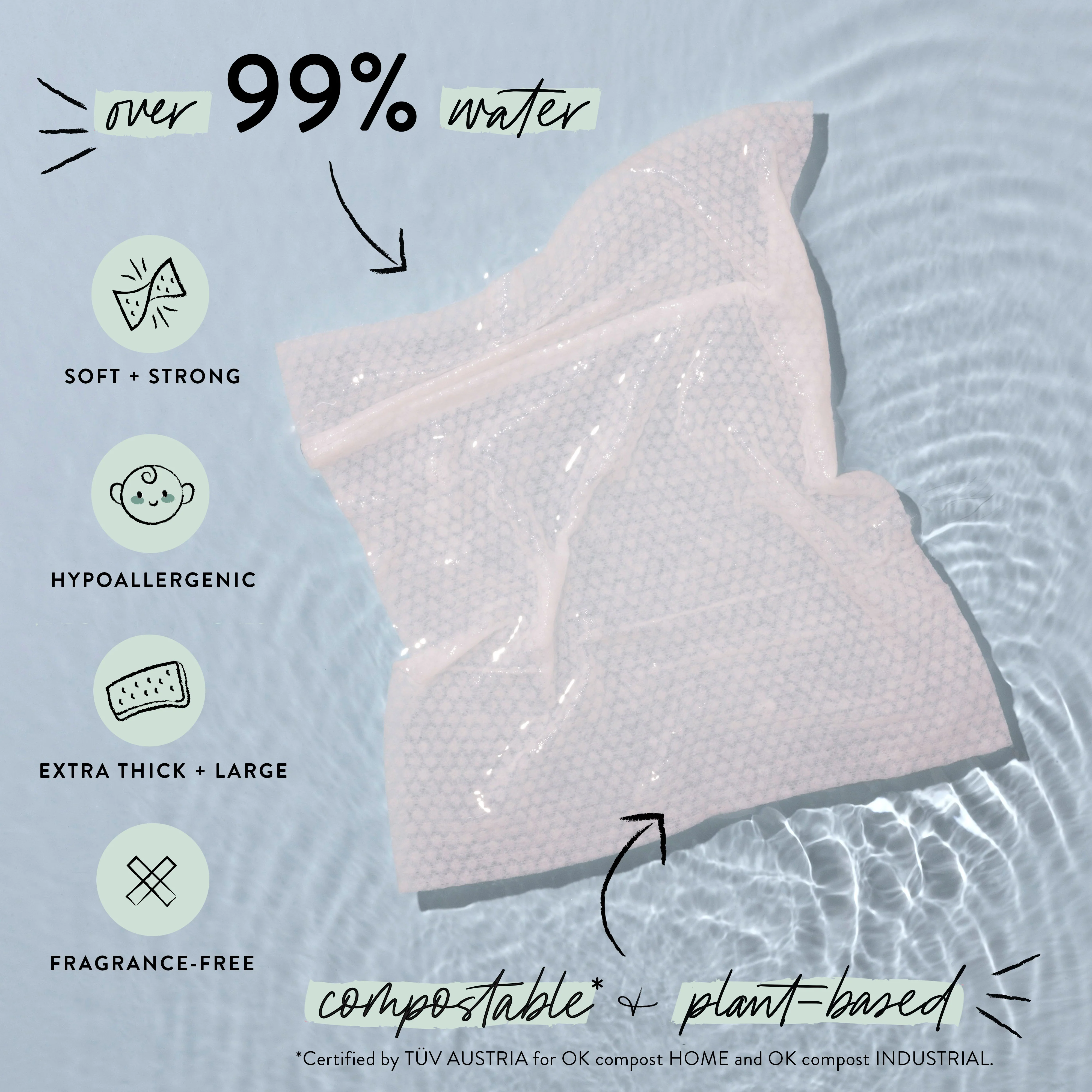 - Just as fast as a Grapefruit Peel and an Onion**" Compostable Wipes Plant-Based Wipes Made With Over 99% Water Extra Large, Thick & Soft Hypoallergenic