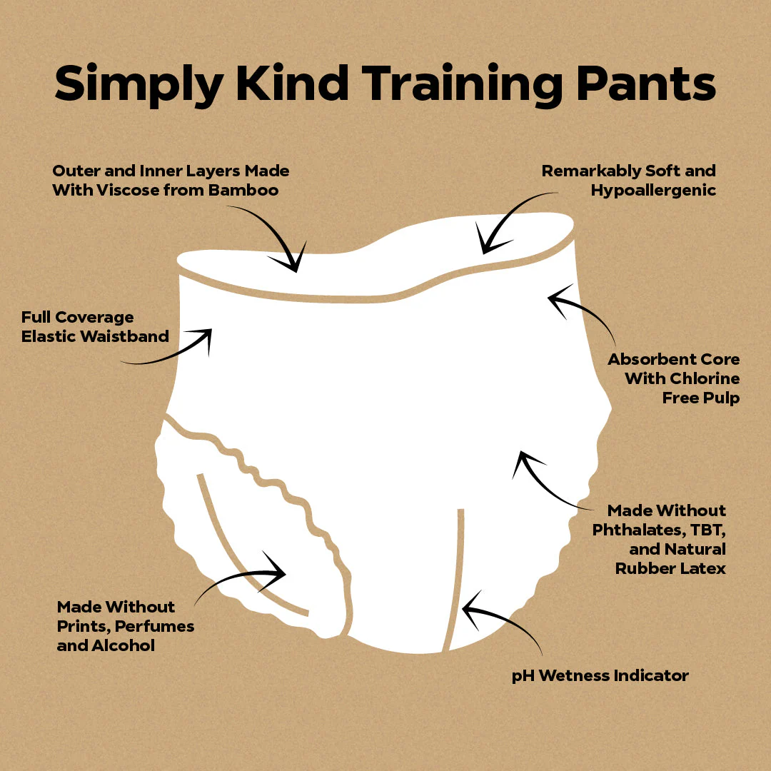 We have created the most thoughtful training pants, or as we like to call them briefs, for the most precious of customers. Our briefs use Chlorine-Free fluff pulp and are free of harmful chemicals or irritants such as latex, alcohol, perfumes, PVC, lotions, TBT or Phthalates. We've made them with Bamboo viscose because it is soft, odorless and breathable. For parents like us and you, that means less gross stuff touches our baby, they get less diaper rashes and it is less stinky.