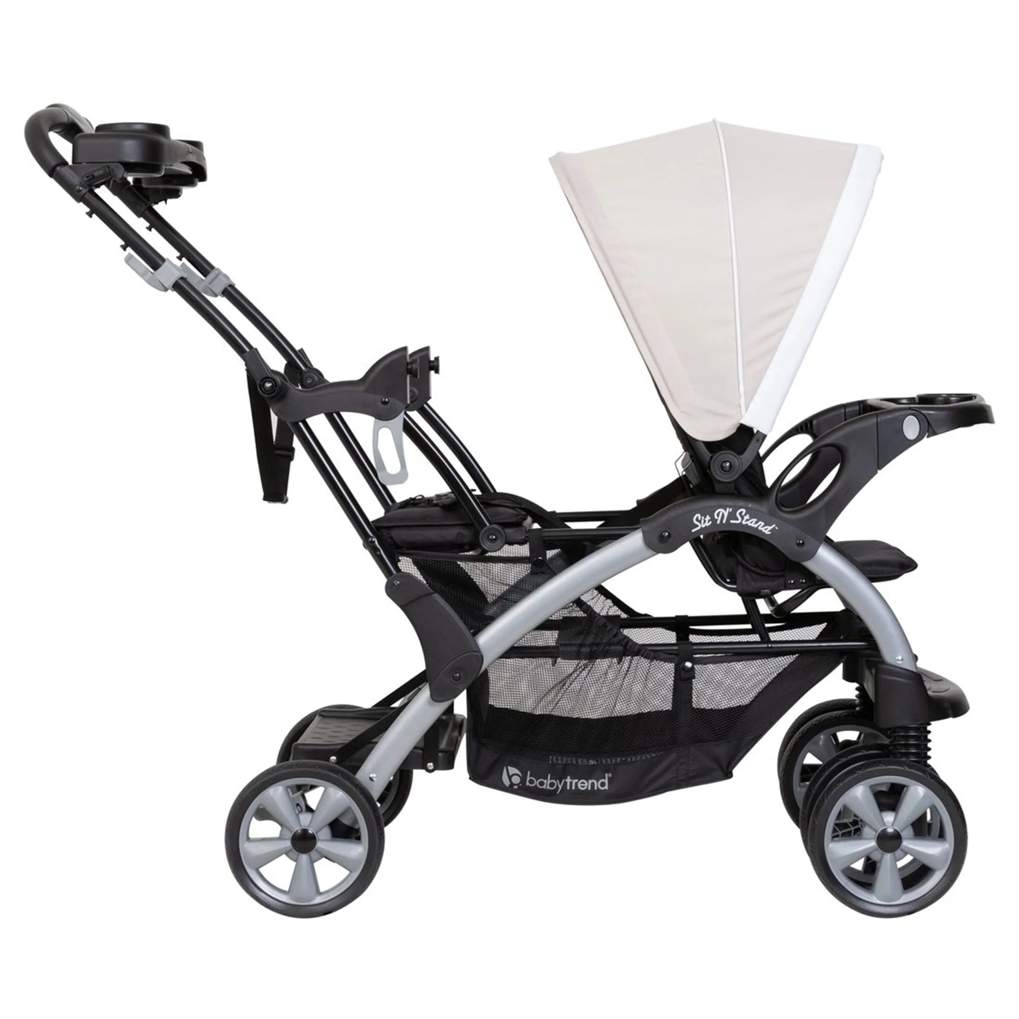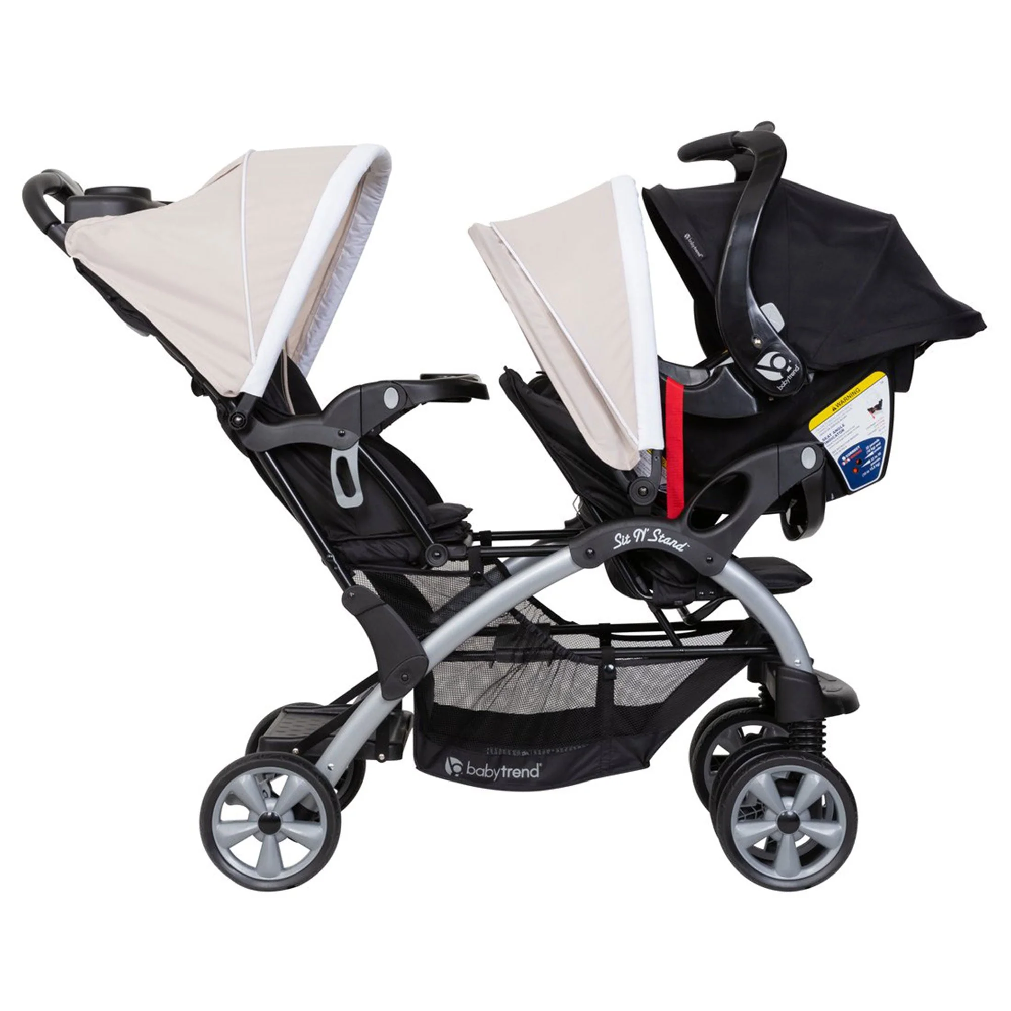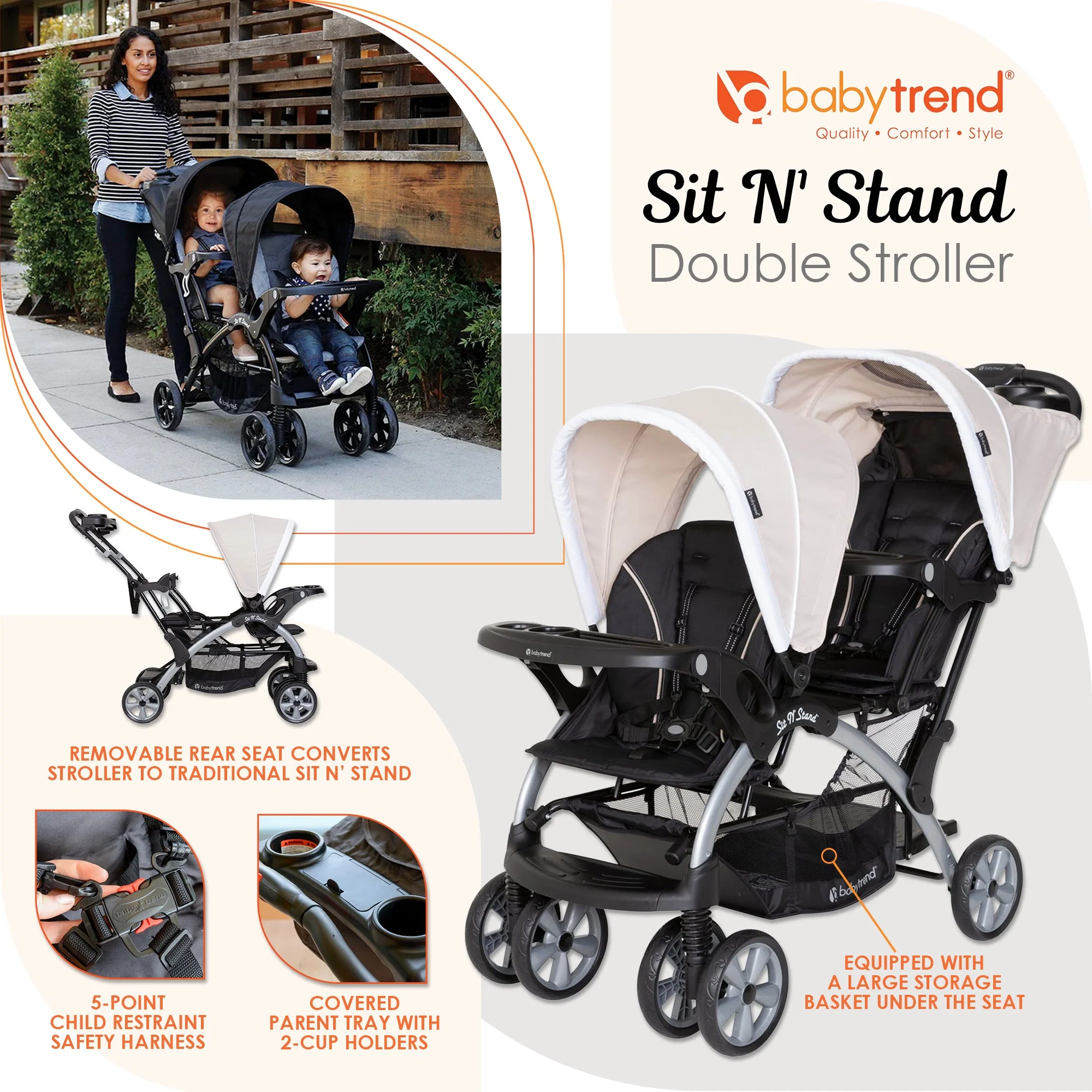 Double the safety, double the style, and double the babies are exactly what you can do with the Sit N' Stand Double Infant Stroller from Baby Trend. This convertible double stroller features 2 seats or can be used as a removable rear seat for a standing platform that provides a place for older children.